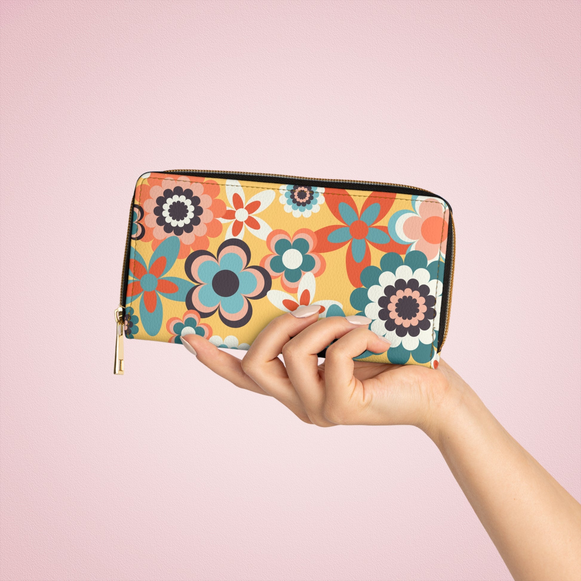 Designed with love and adorned with a groovy 60's and 70's mcm boho floral design, our zipper wallet is made from cruelty-free faux leather, so you can flaunt your unique style without compromising your values! Inside the zipper closure, you'll find pockets designed to hold your cash, credit cards, coins, and checkbook, ensuring your valuables are secure while you are free to go where your carefree spirit takes you!