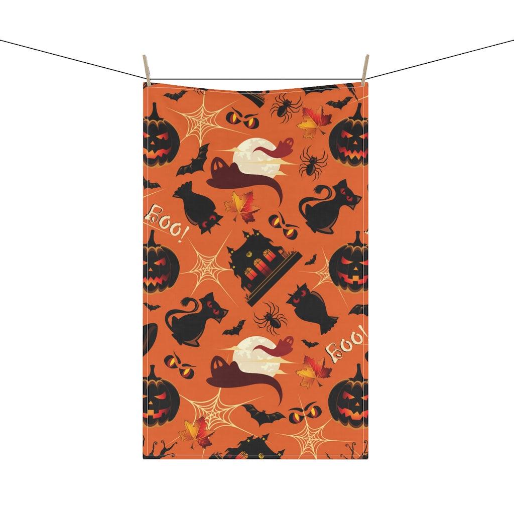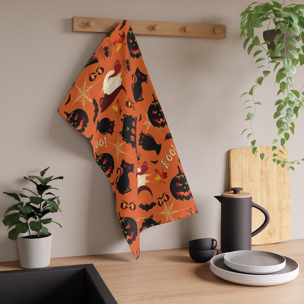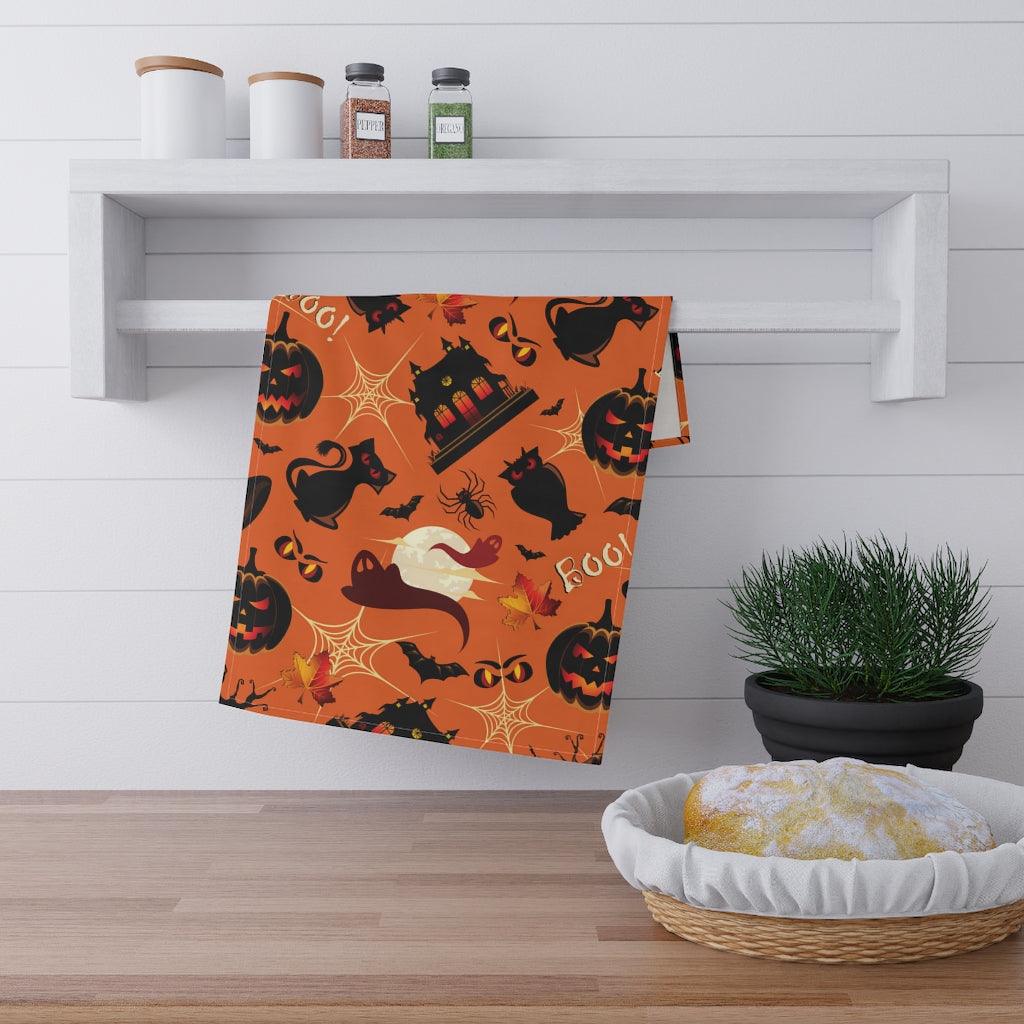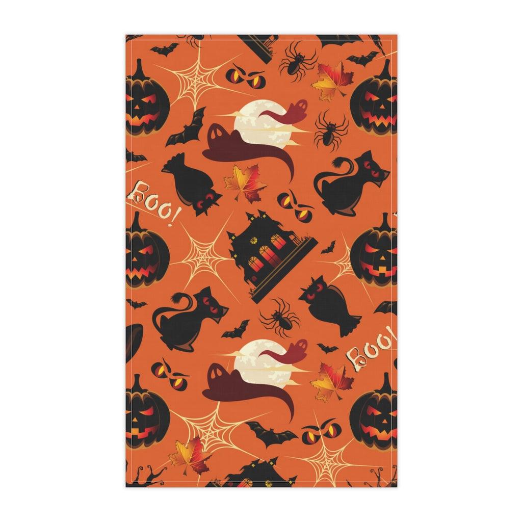Halloween Black Cat, Bats & Ghost Orange Cotton Twill Kitchen Towel