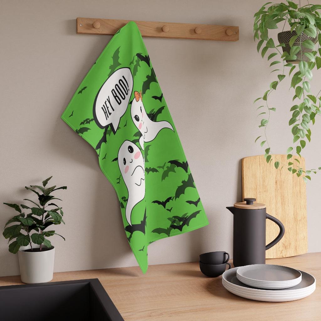 Hey Boo, Cute Kawaii Ghosts & Bats Halloween Green Tea Towel