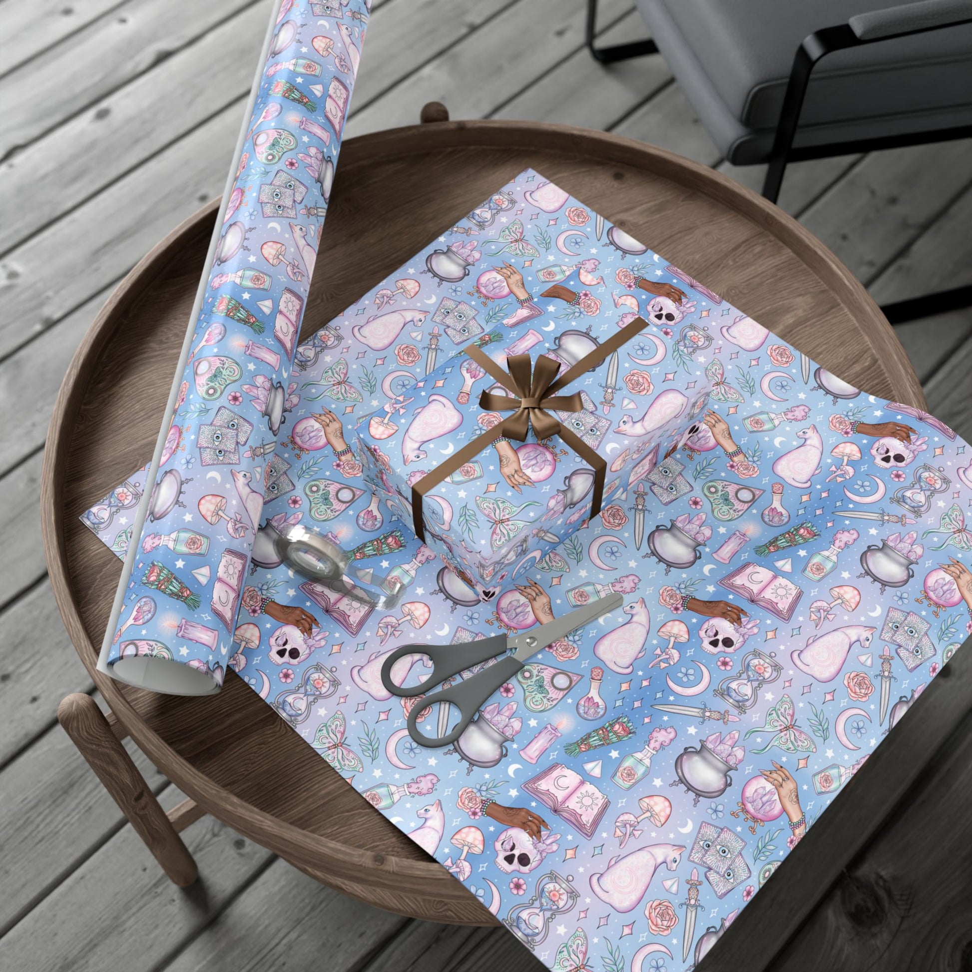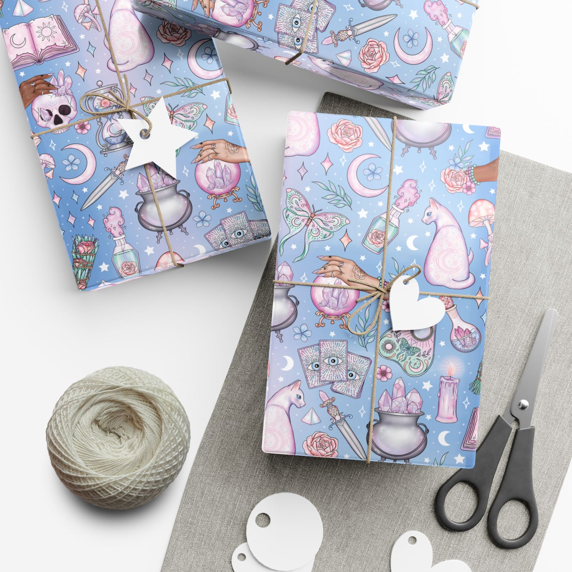 Our witchy, kawaii pastel goth blue eco-friendly gift wrap transforms the act of gift-giving into a whimsical and opulent spectacle. Whether you're celebrating the holidays, a special occasion, or simply reveling in the art of presenting gifts, this extraordinary wrapping paper adds a touch of whimsigoth and personality to your festivities!