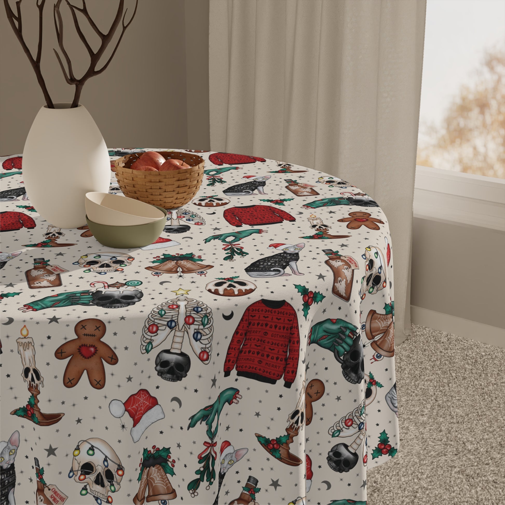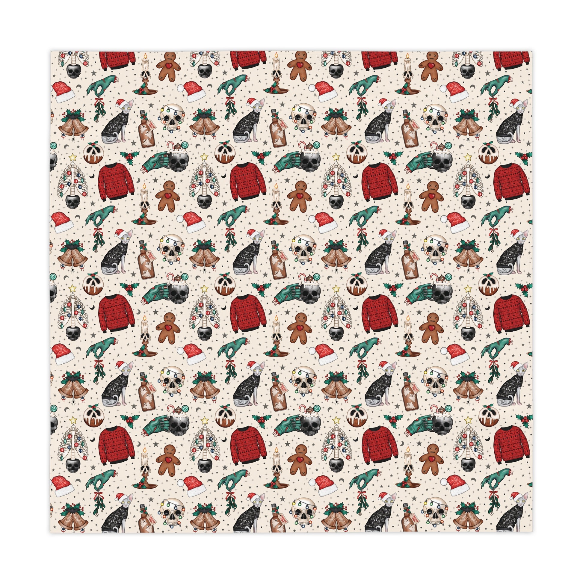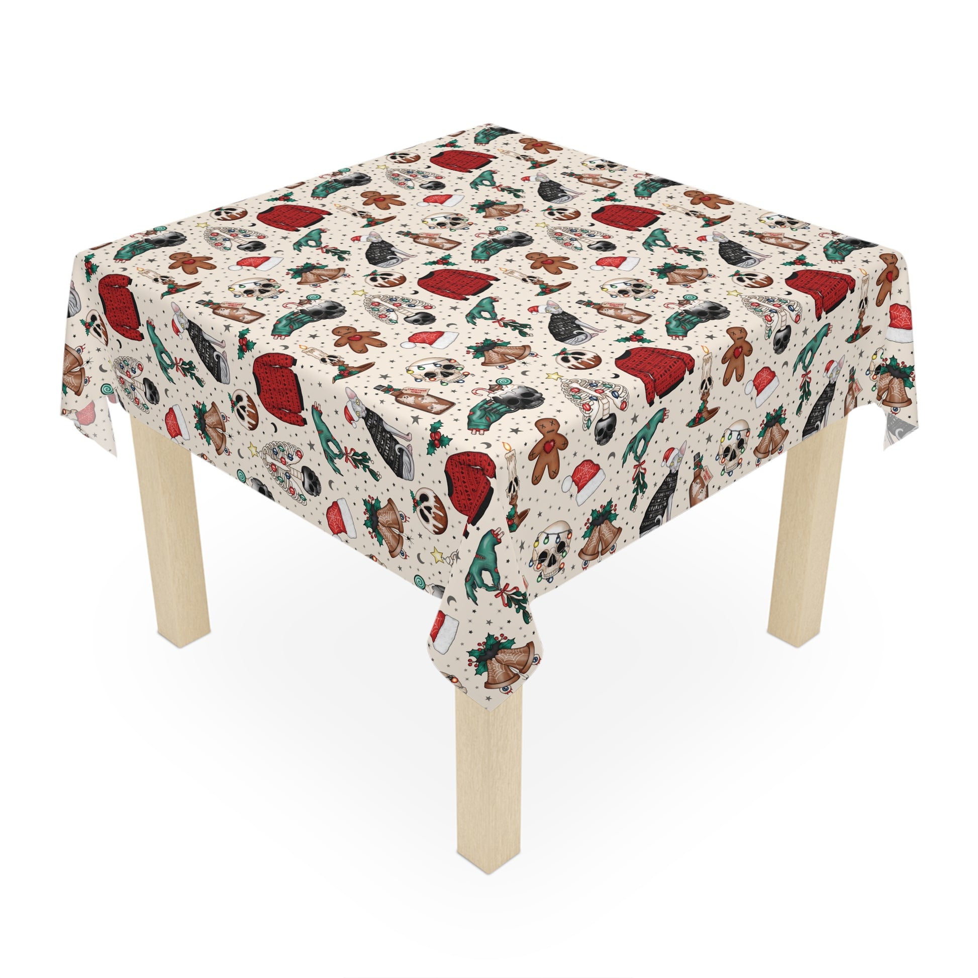 Perfect for your goth Christmas, our kitschy kawaii Creepmas tablecloth is a joyful celebration of the cute, weird and wonderful; where holiday charm meets quirky spookiness! Our multicolor, creepy-cute tablecloth helps create a whimsical winter wonderland that is anything but ordinary, and will be a gorgeous backdrop to your holiday spread!