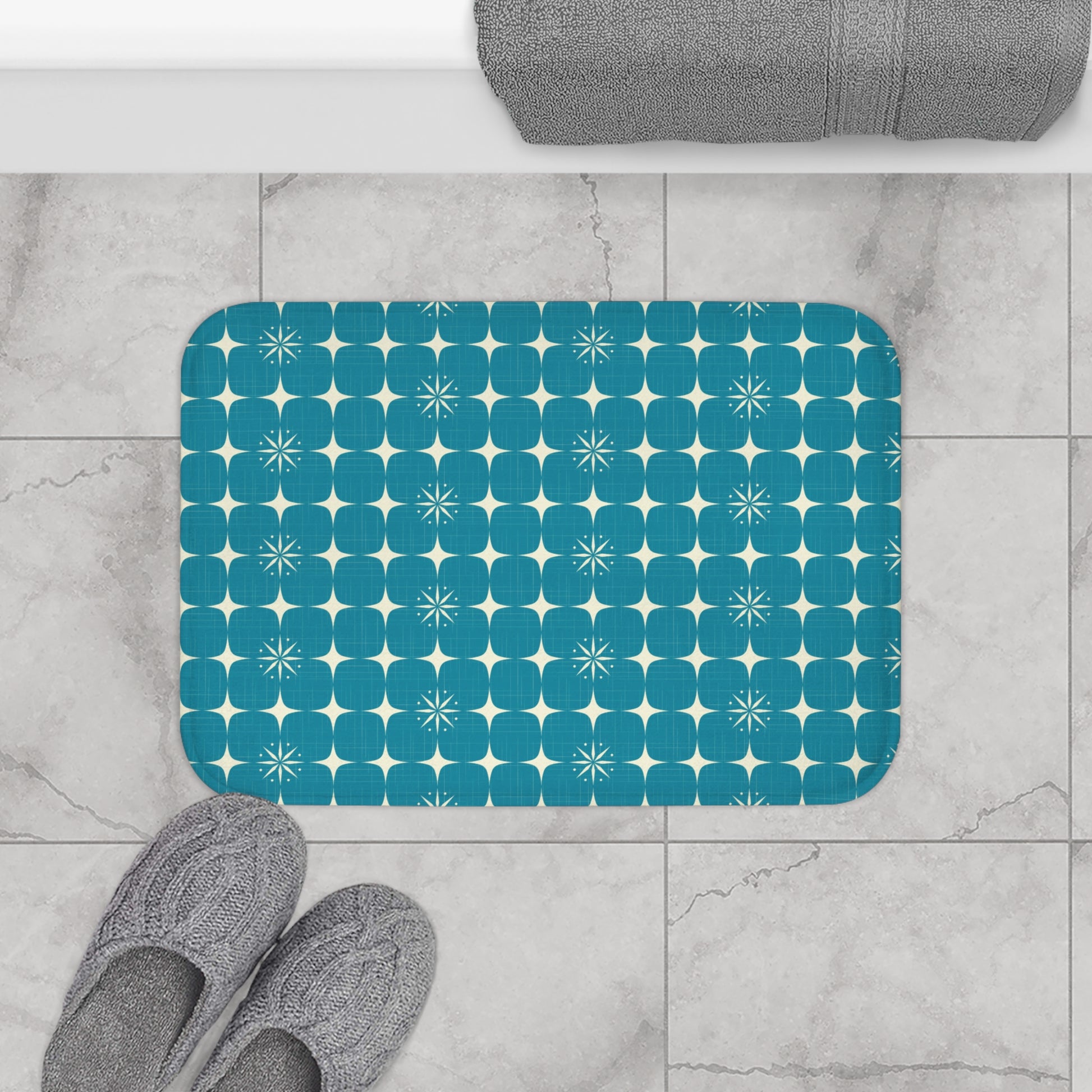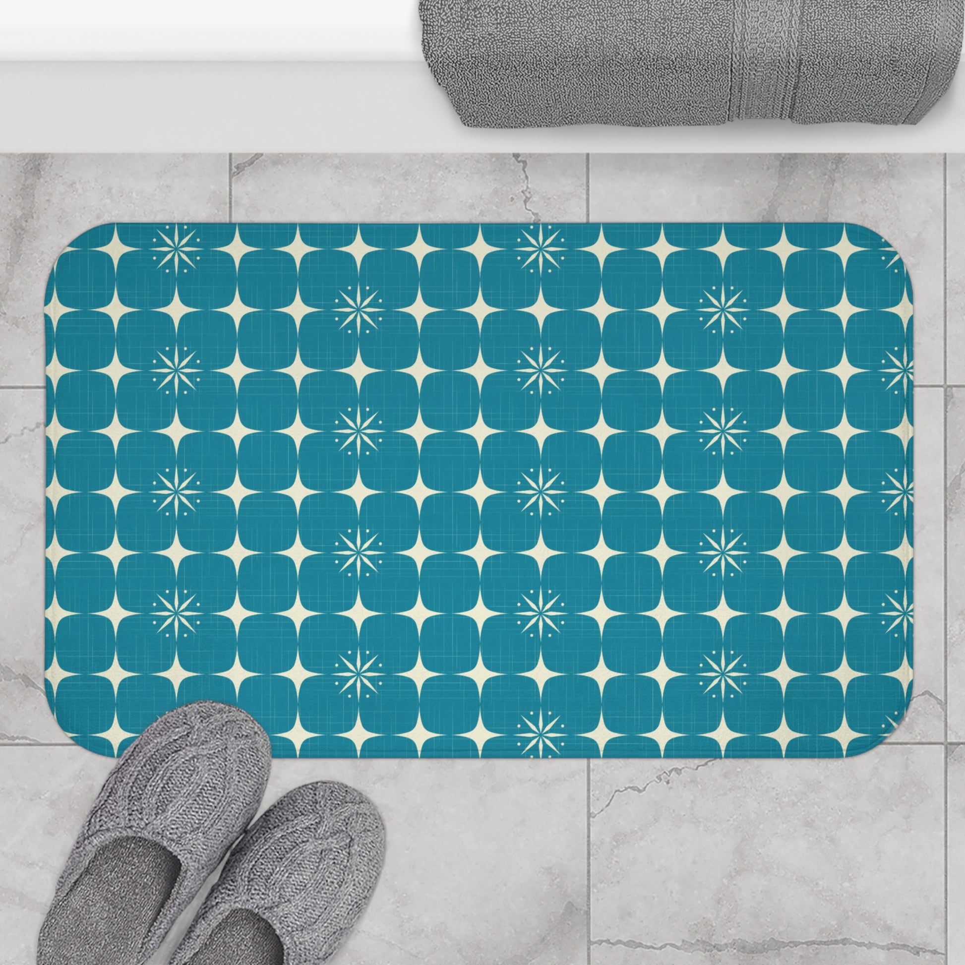 This bath mat features an atomic starburst design from the 50's mid century mod era in a beautiful retro blue. A quick change of your bath mat is an easy way to refresh your bathroom! Matching shower curtain available.