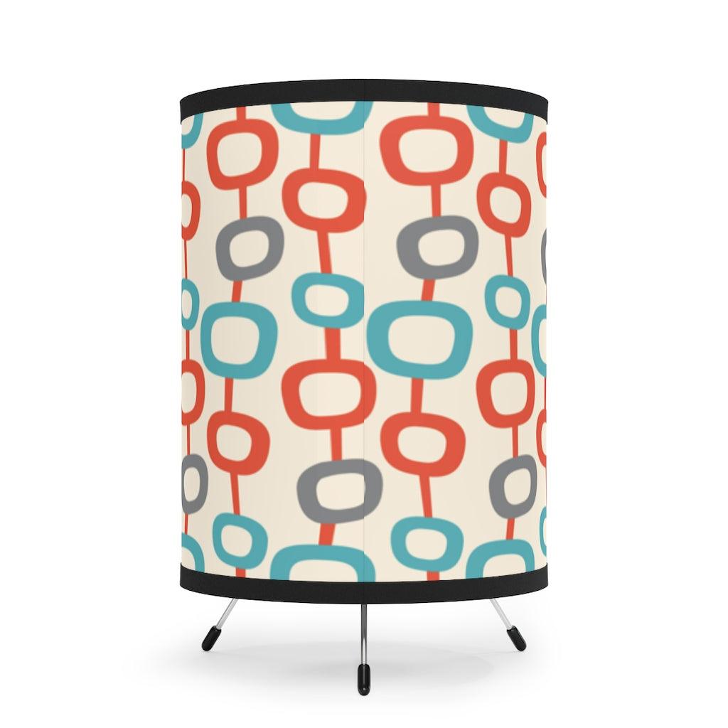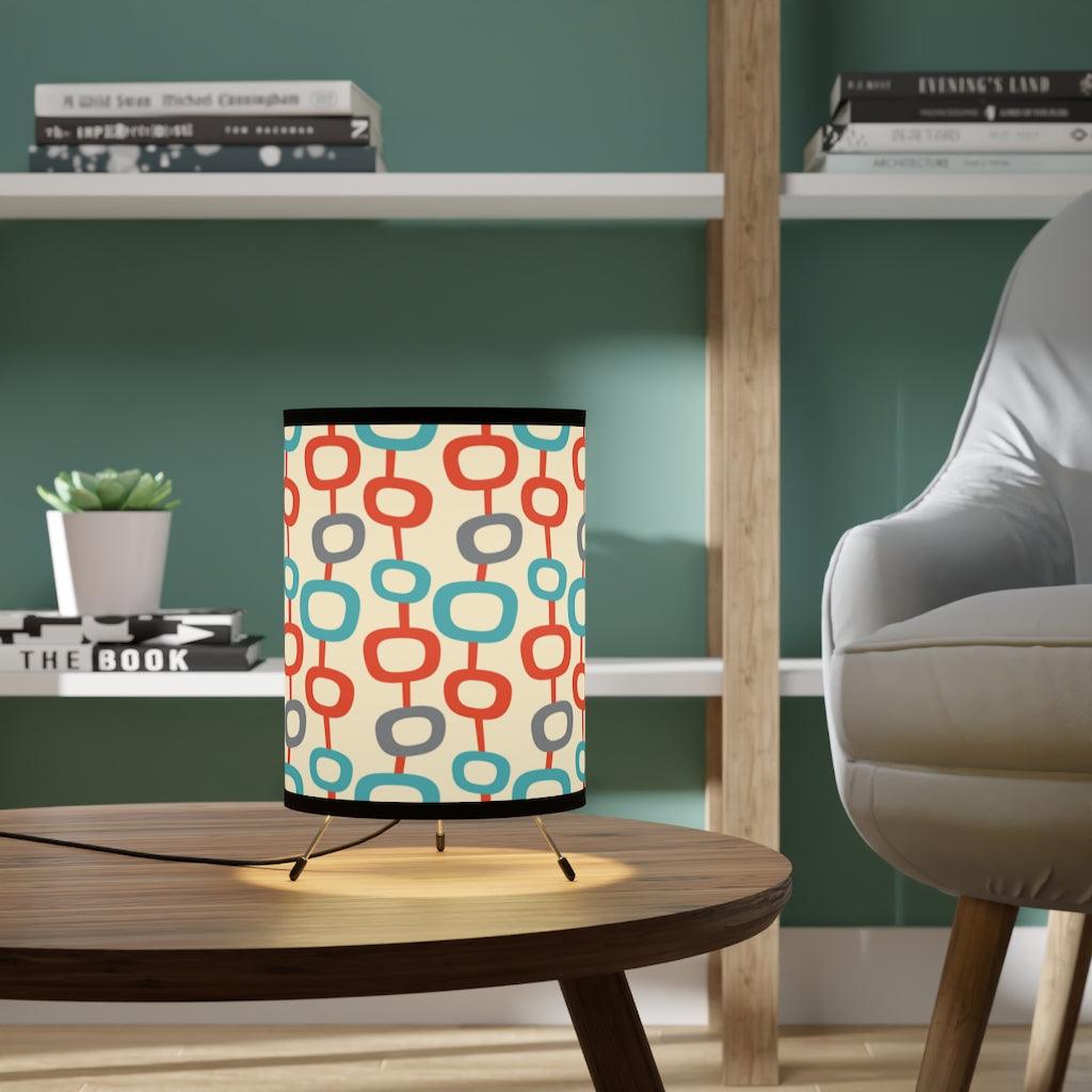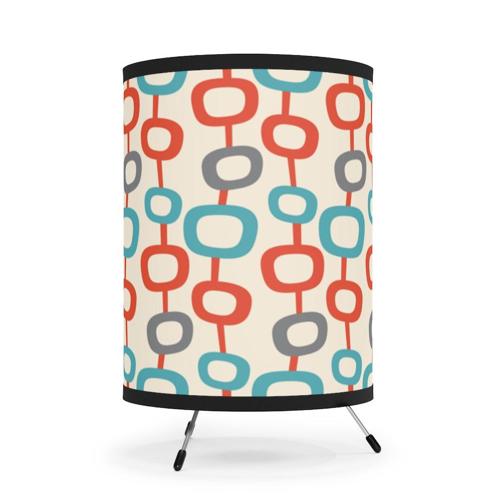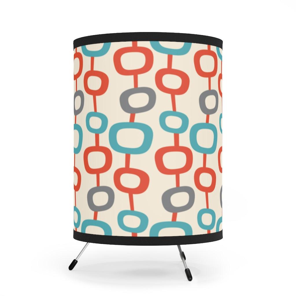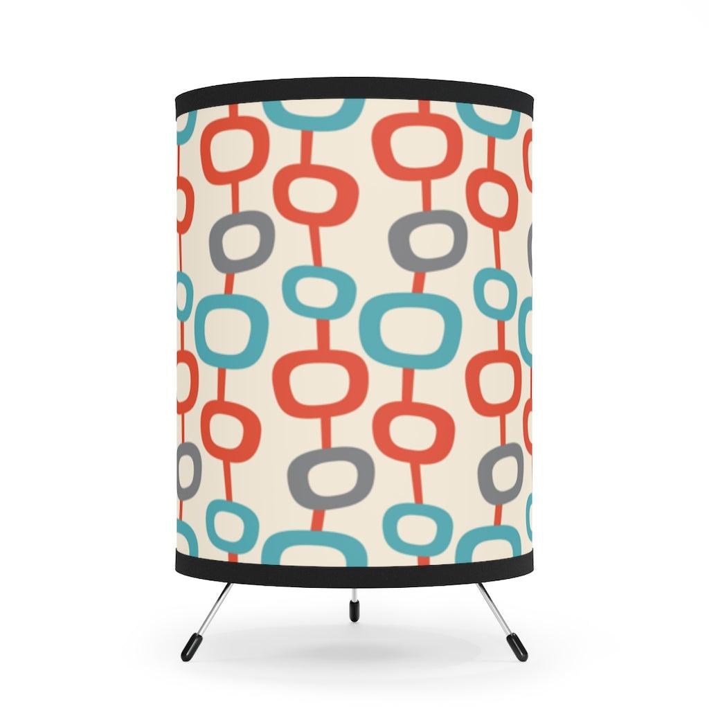 This retro style pattern on our tabletop lamp, is a fun way to decorate your space in a fresh new way! This tripod lamp provides soft lighting and is big on mid century style!