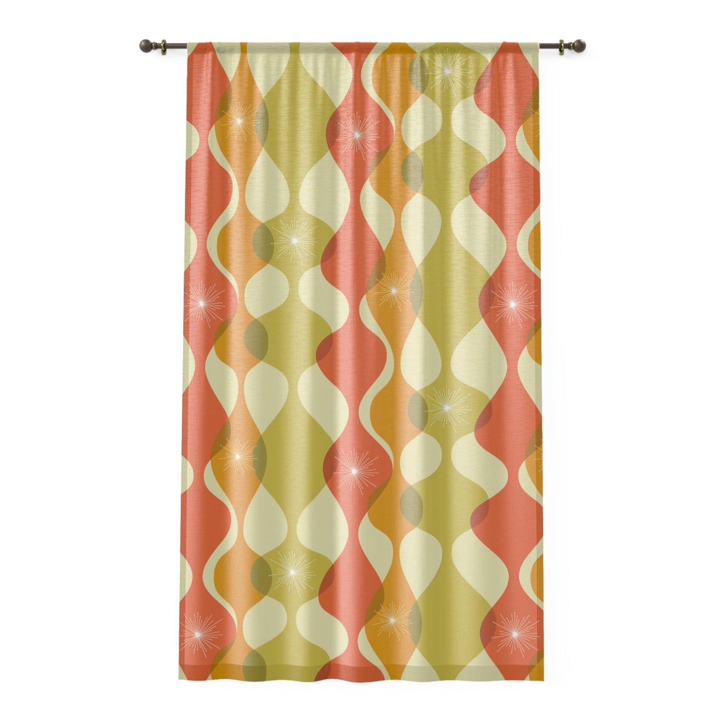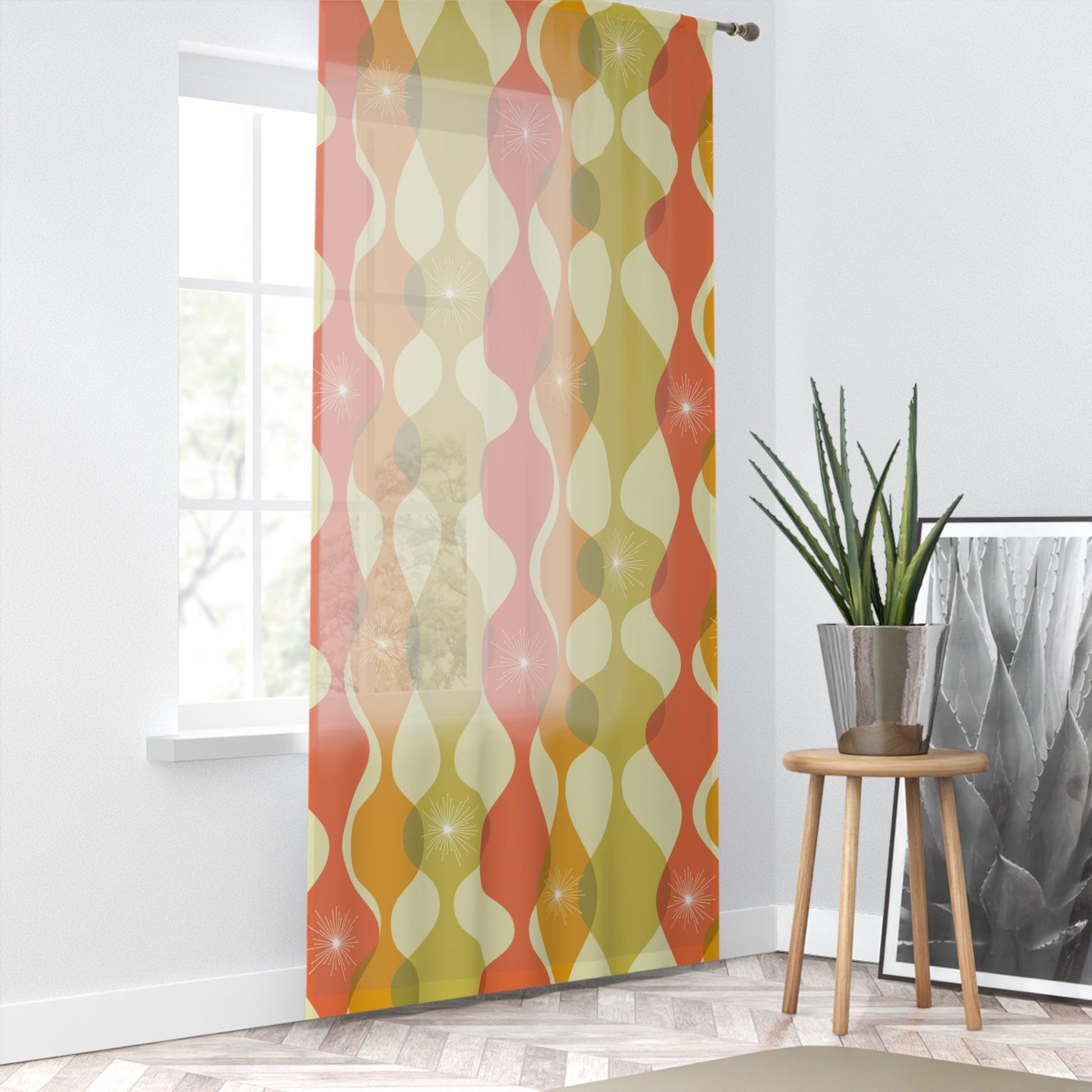 Mid Century Mod Wavy Abstract Orange, Green & Yellow Sheer Window Curtain