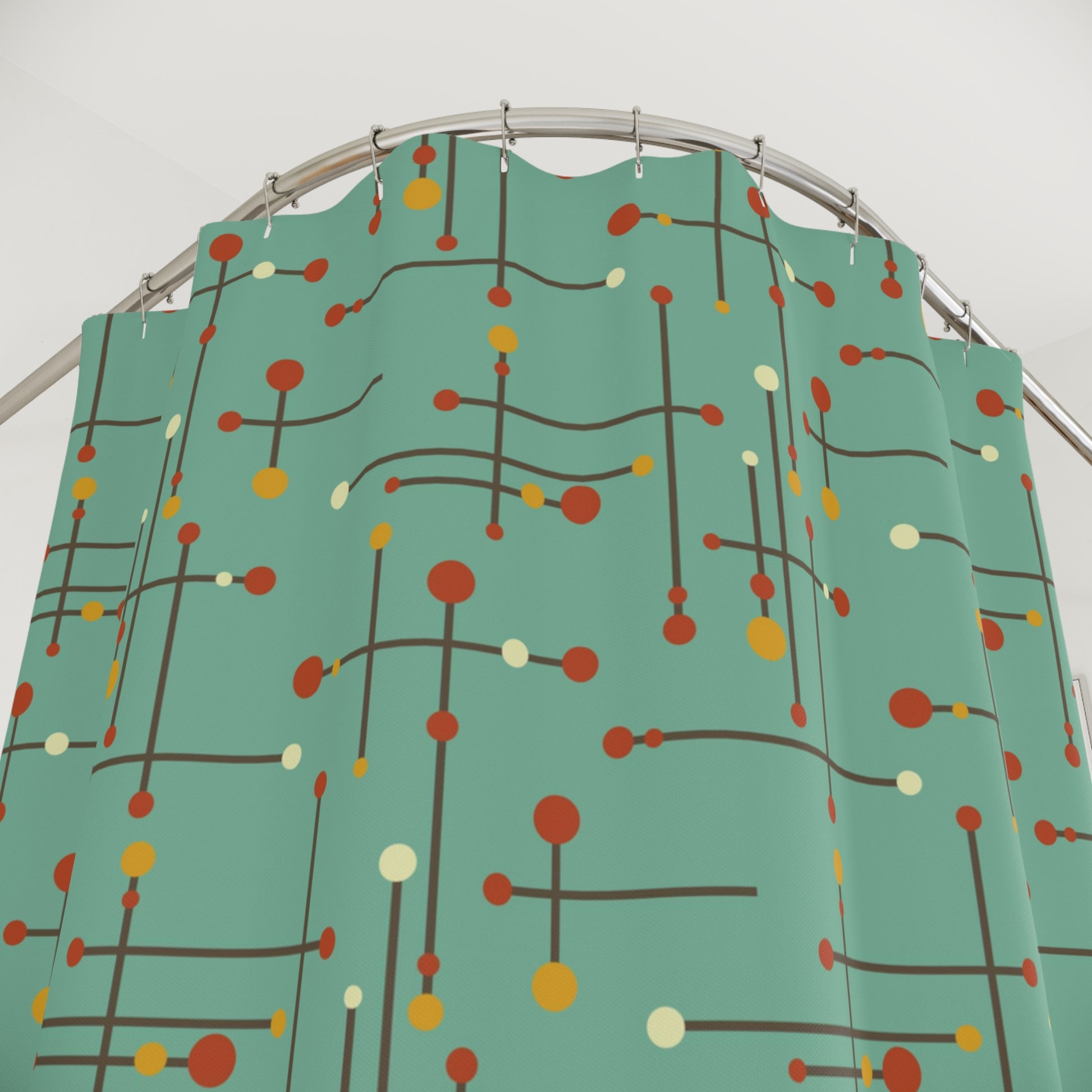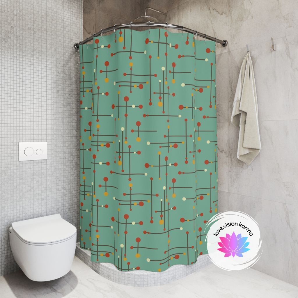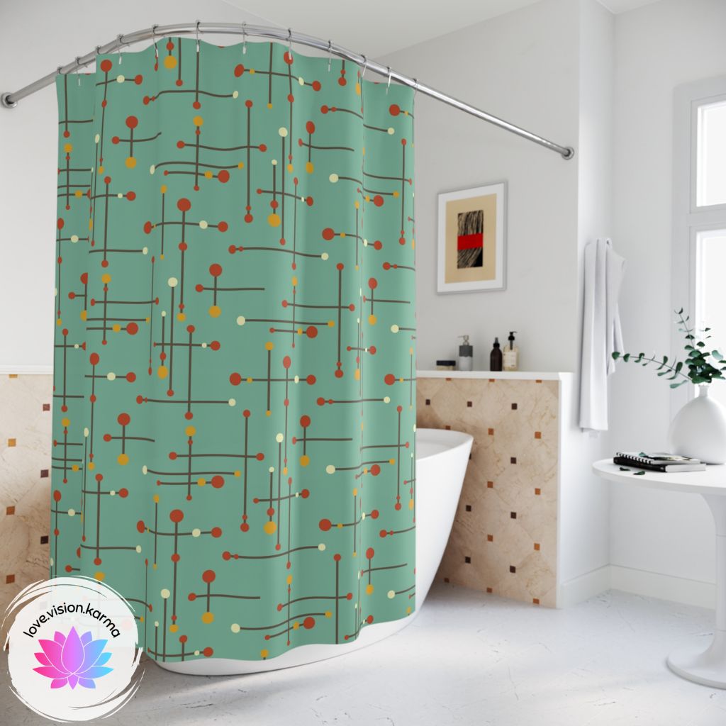 This shower curtain features a geometric design of straight, intersecting lines with colorful circles on the end of some, inspired by Eames and the mid century modern era. Update the look of your bathroom with this shower curtain and score some major retro style! Matching bath mat available.