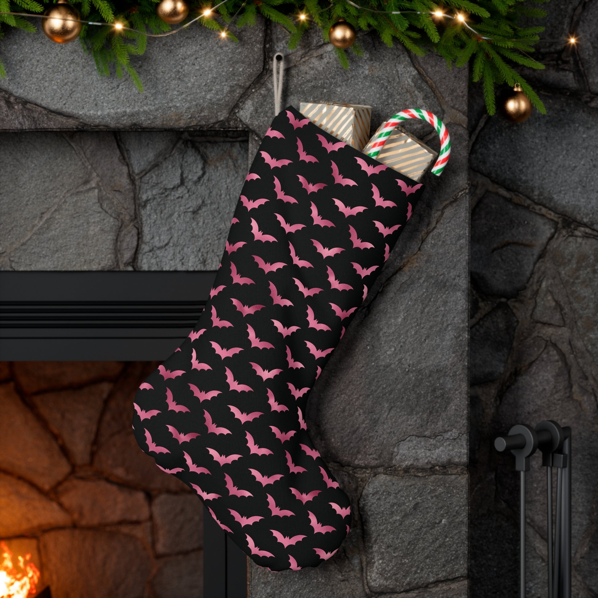 Pink Bats Glam Goth Christmas, Creepmas, Black Gothmas Holiday Stocking