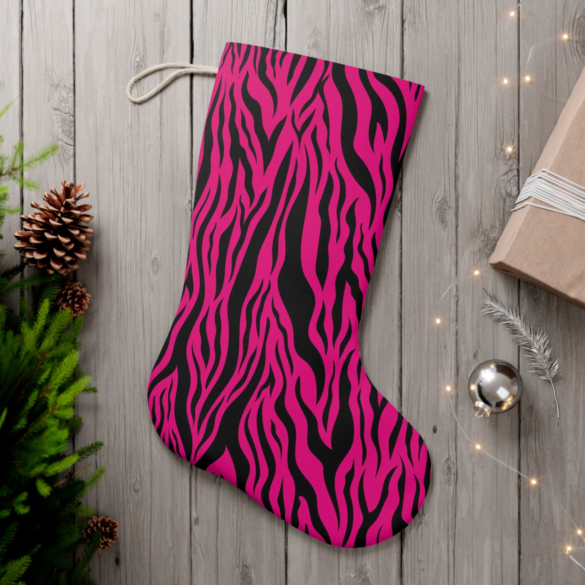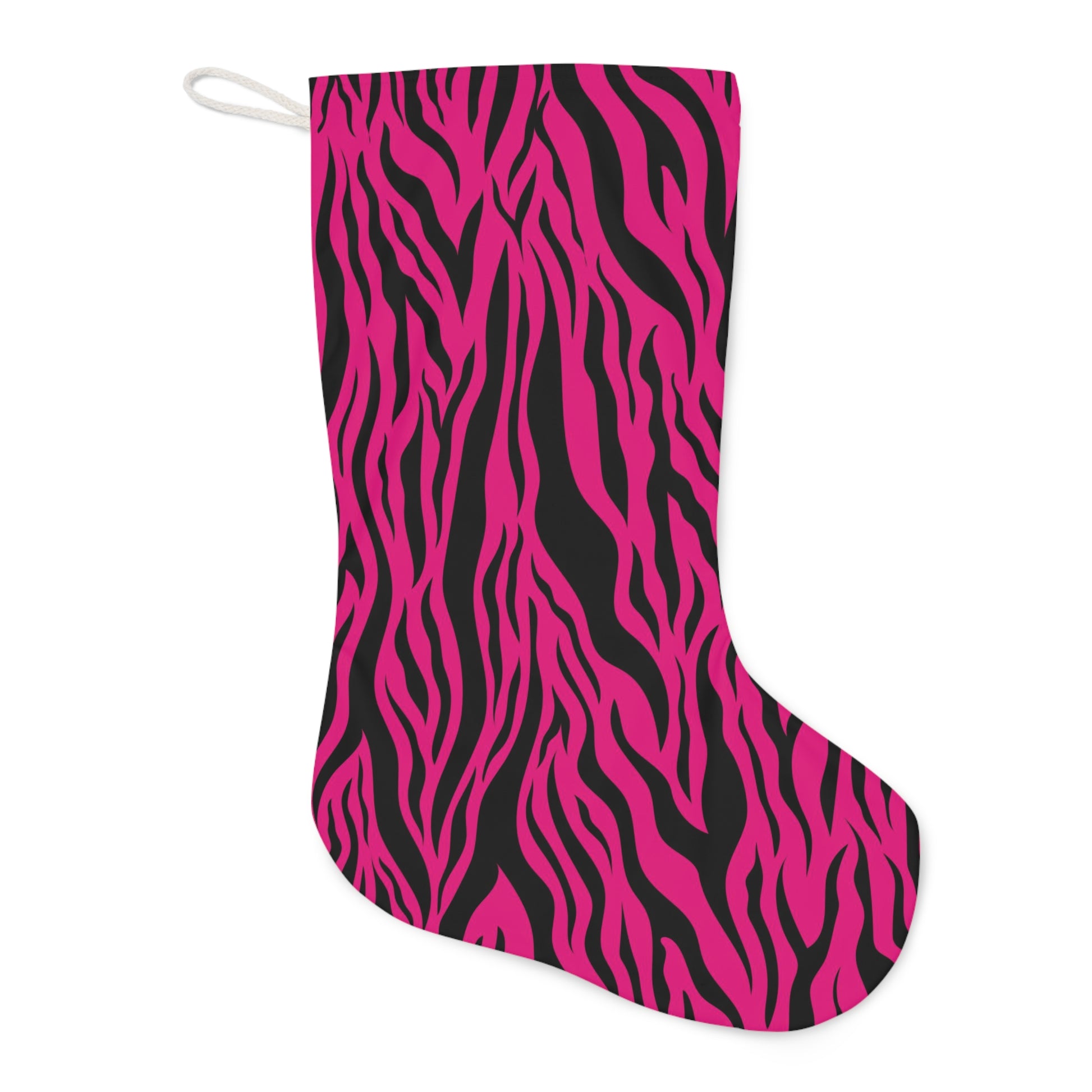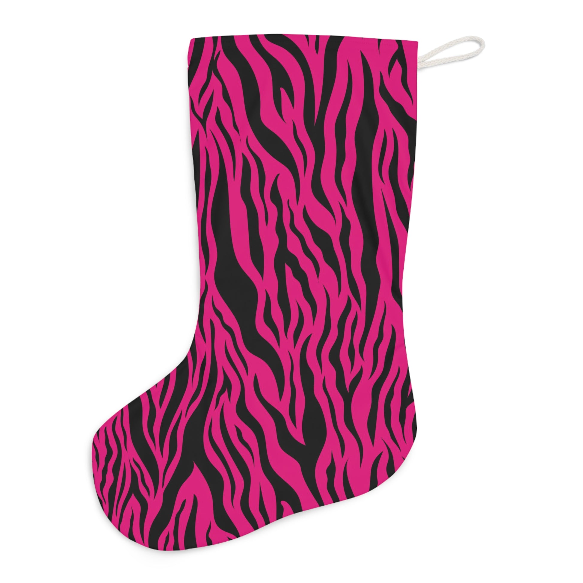 Our pink tiger stripe animal print Christmas stocking is generously sized for all your stocking stuffers! Looks fierce and fabulous hanging on your mantel as functional Christmas decor and spreads festive cheer too!