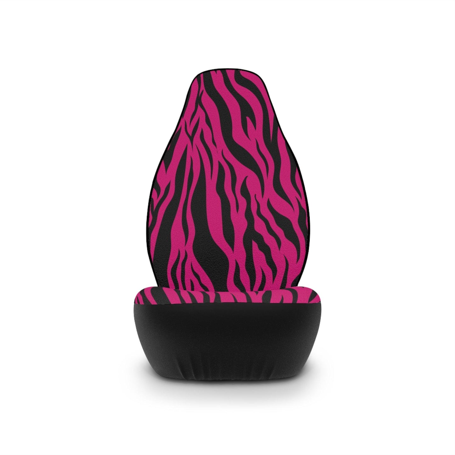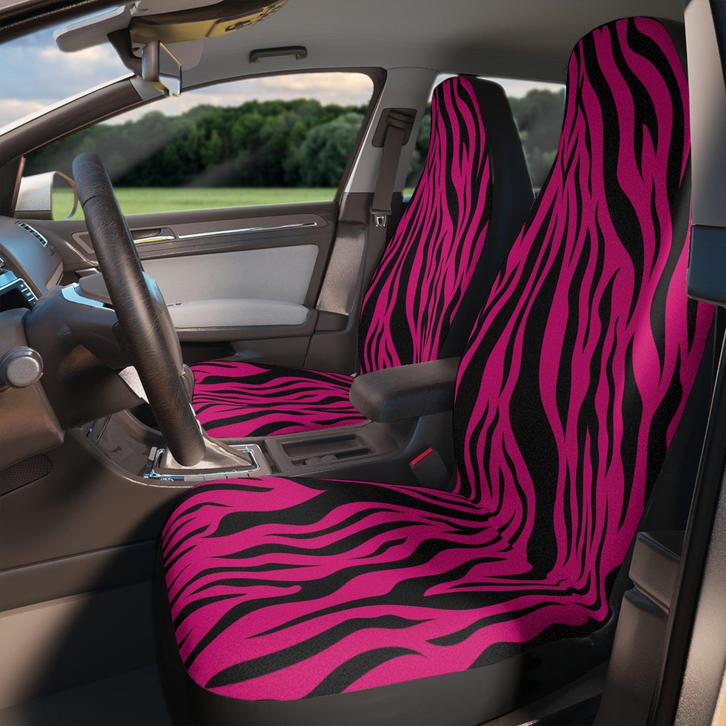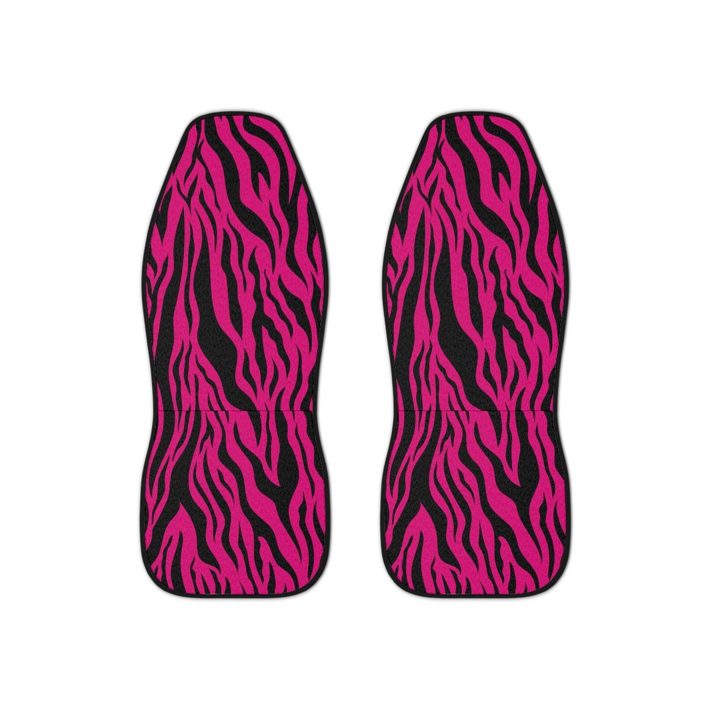 Customize your car's interior with these fun and fashionable pink tiger stripe, animal print car seat covers! Made of thick, high quality polyester fabric for durability that lasts. Sold as a set of TWO. Important to note that these covers should NOT be used on seats with side airbags or armrests.