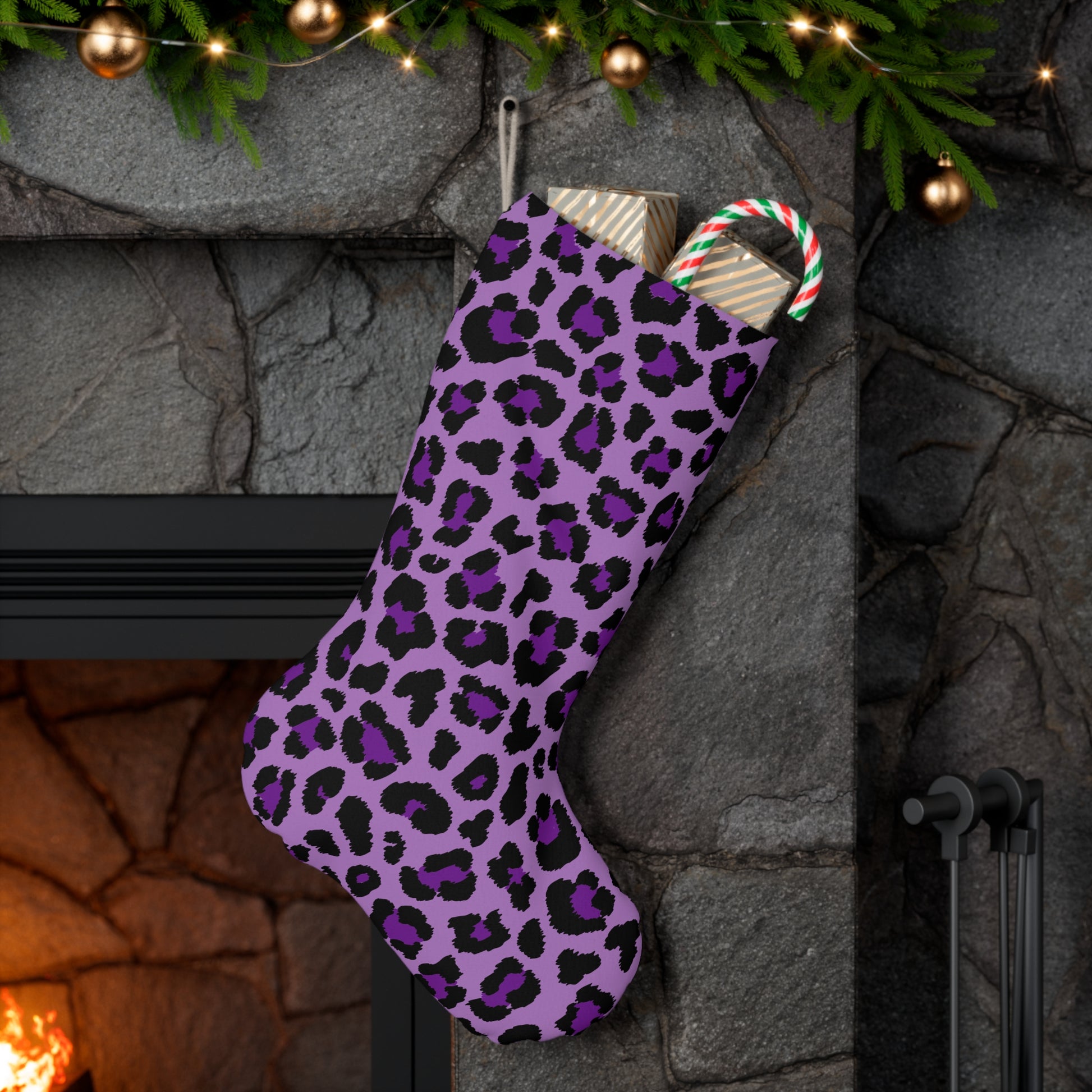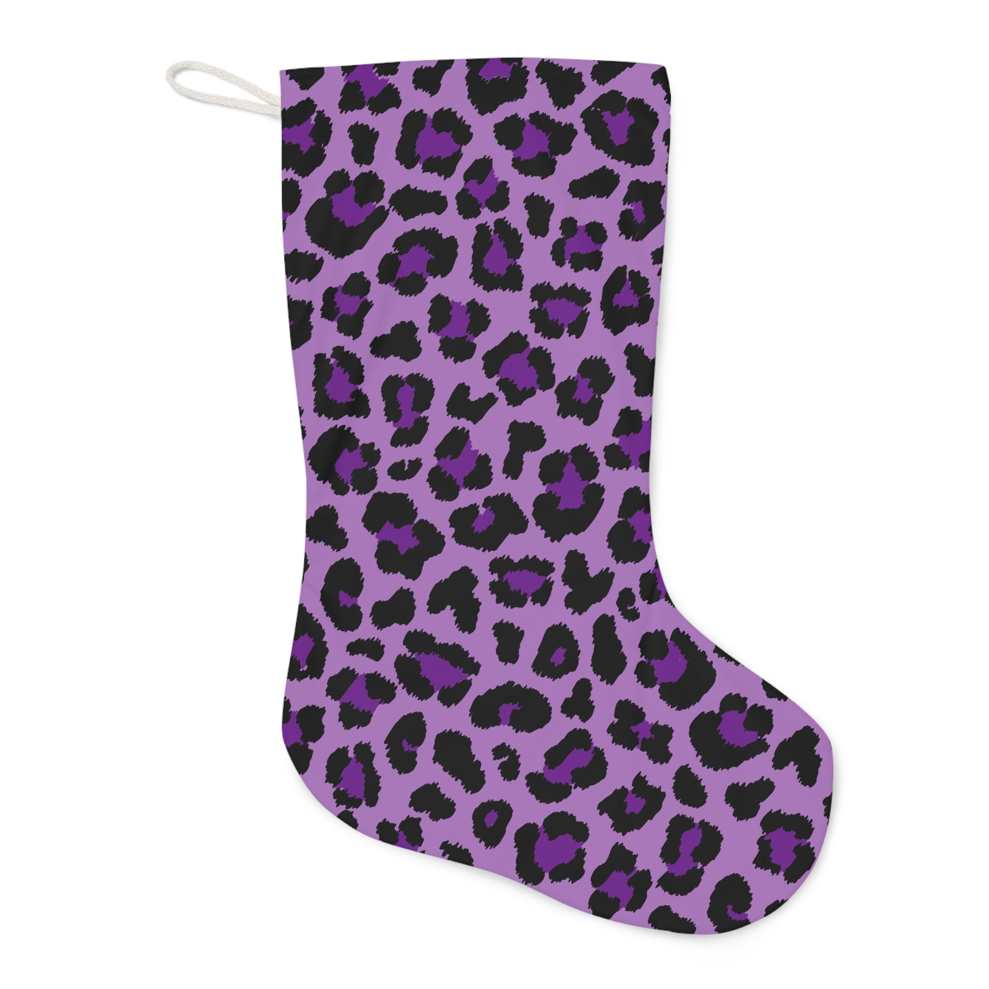 Our purple, leopard/cheetah animal print Christmas stocking is generously sized for all your stocking stuffers! Looks fierce and fabulous hanging on your mantel as functional Christmas decor and spreads festive cheer too!