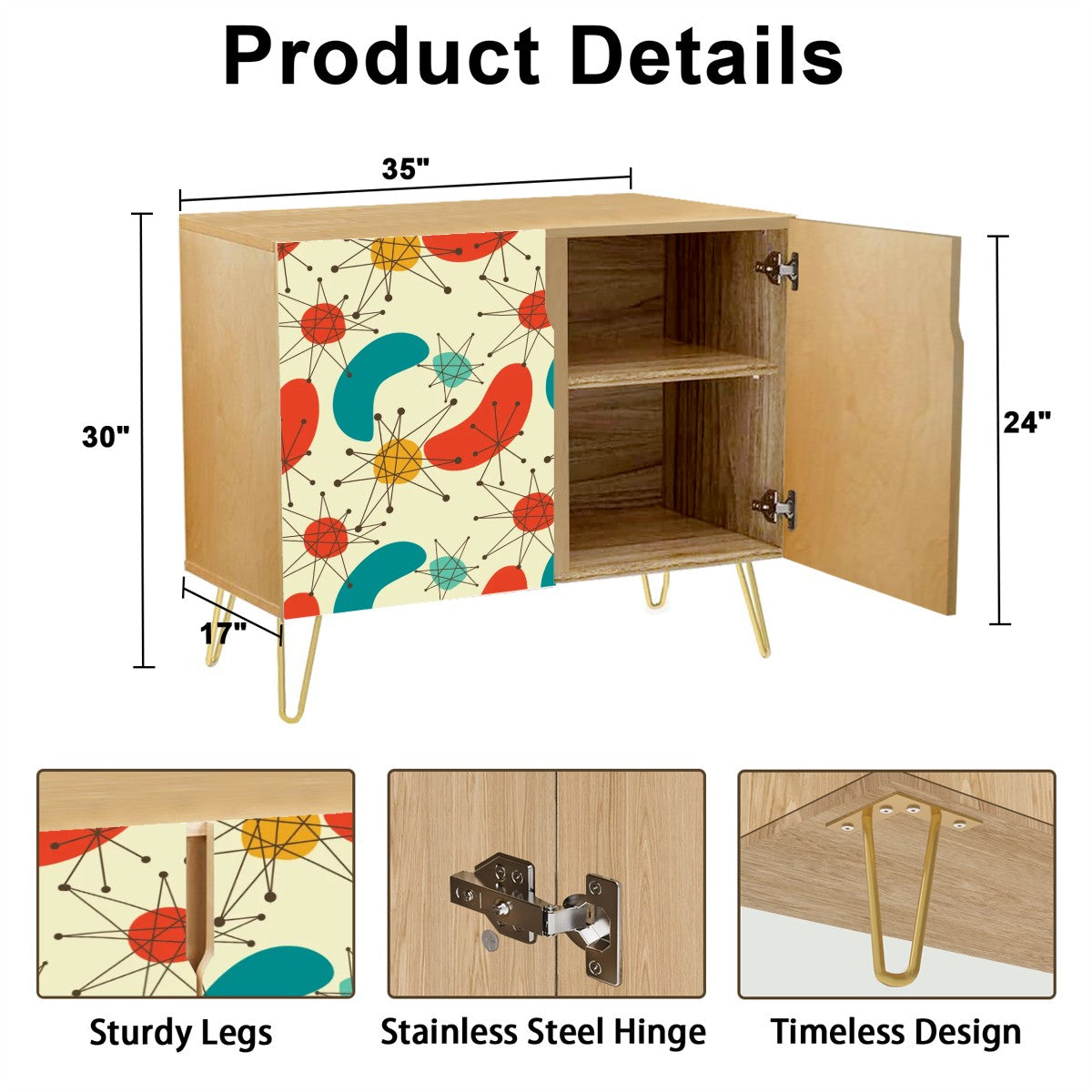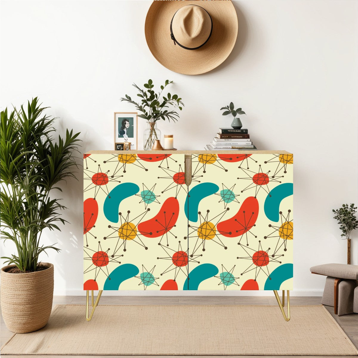 Starring clean lines and iconic gold-tone hairpin legs, our 50's and 60's atomic burst and boomerang sideboard cabinet brings timeless mid century modern style to any space! Behind the two doors, an interior shelf keeps your essentials organized; from dishware and bar tools in the dining room, to vinyl records and board games in the living room.