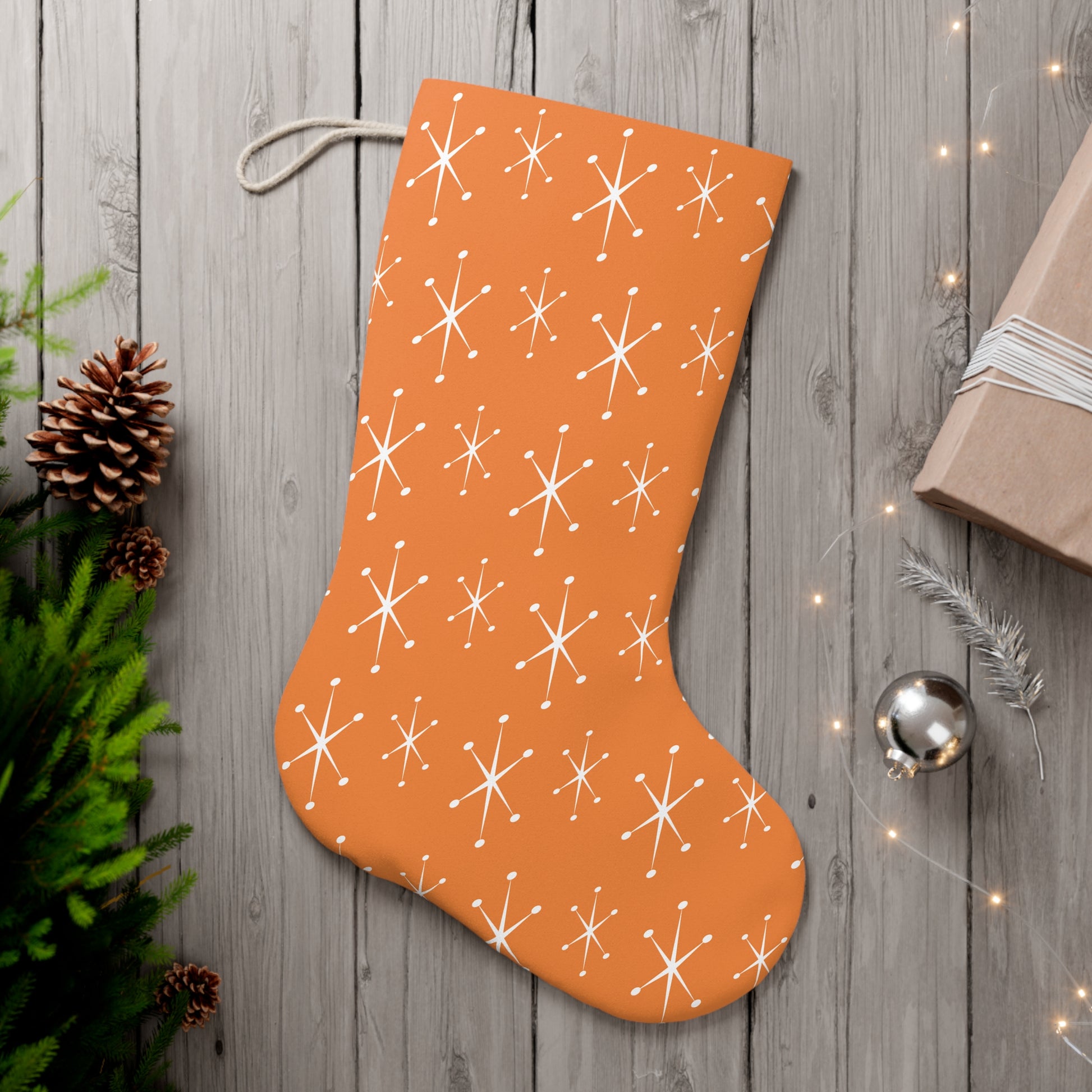 Our bright tangerine orange, 50's atomic starburst Christmas stocking is the perfect addition to your retro 50's and 60's mid century modern holiday decor, in a modern accent color. Beautiful functional decor that adds retro mod style to your home and spreads festive cheer too!