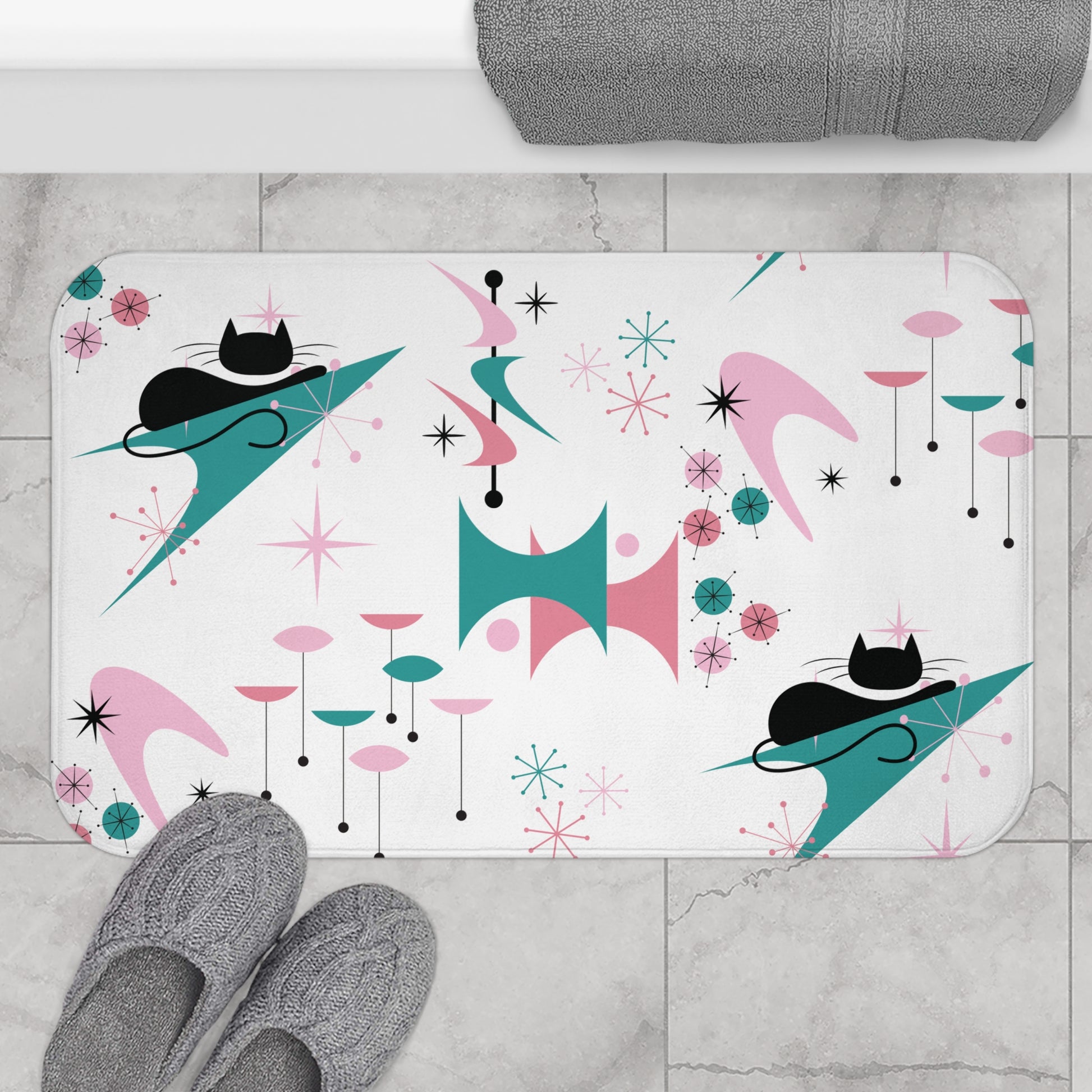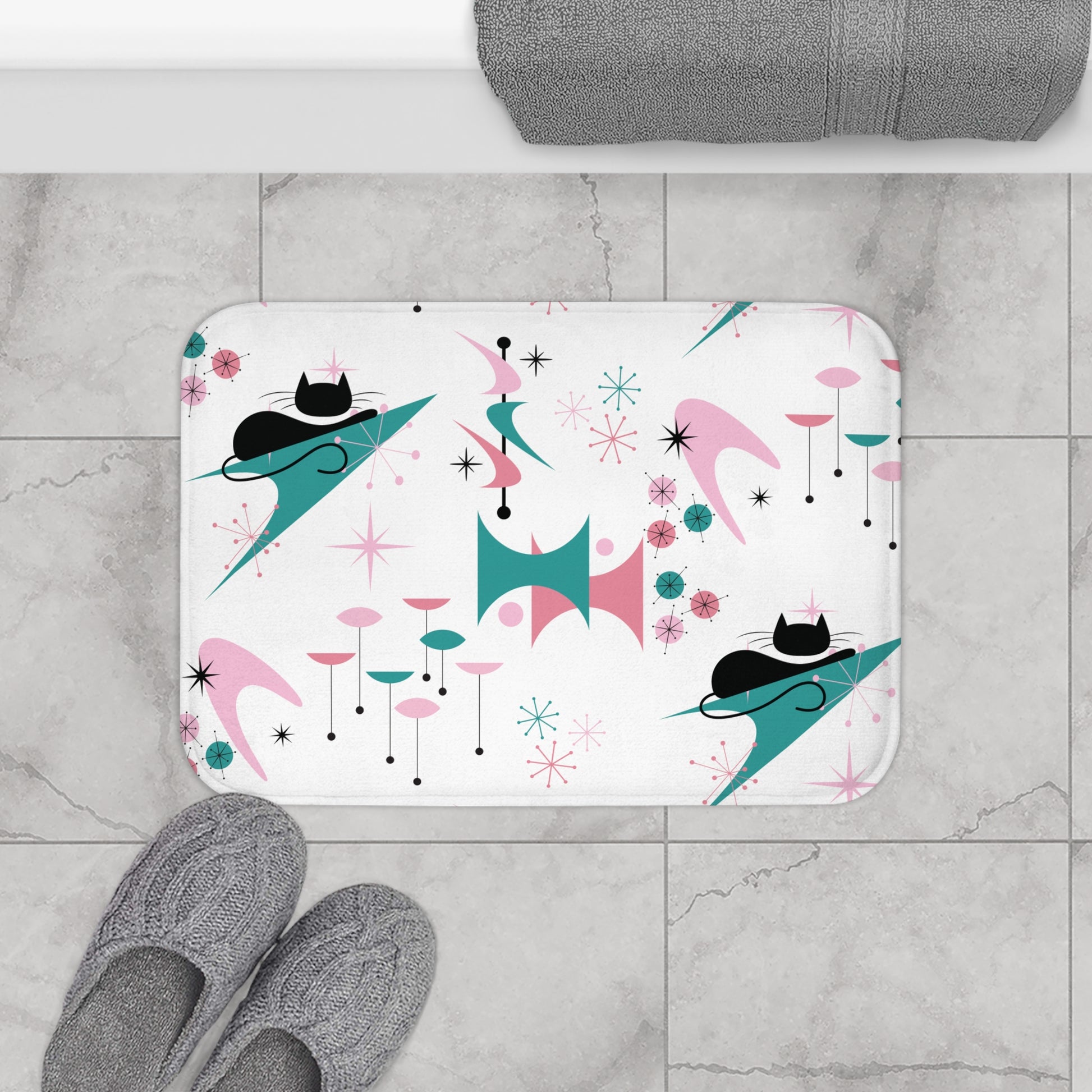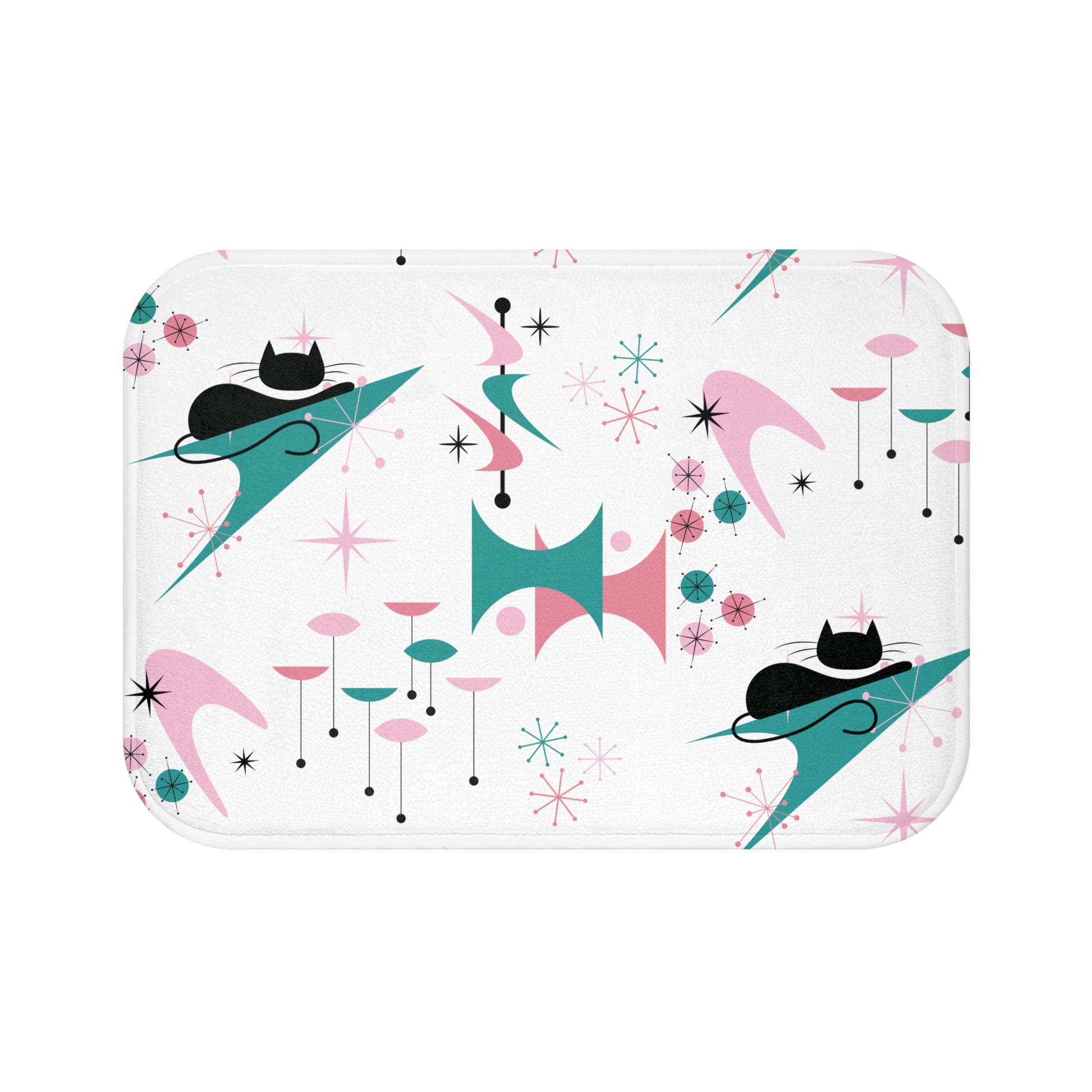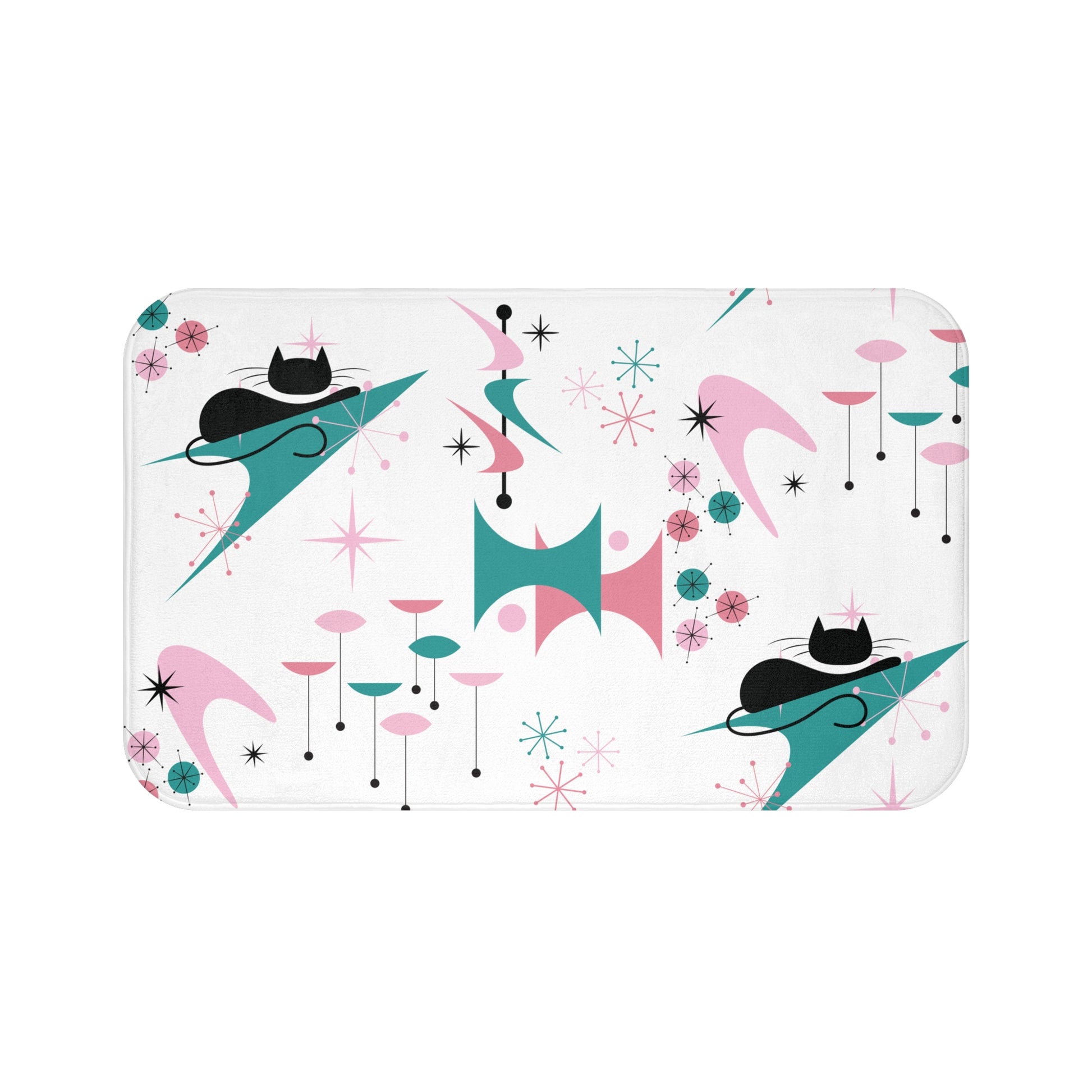 Retro 50s Atomic Black Cat, Boomerang & Starburst MCM Pink, Teal-Green & White Bath Mat