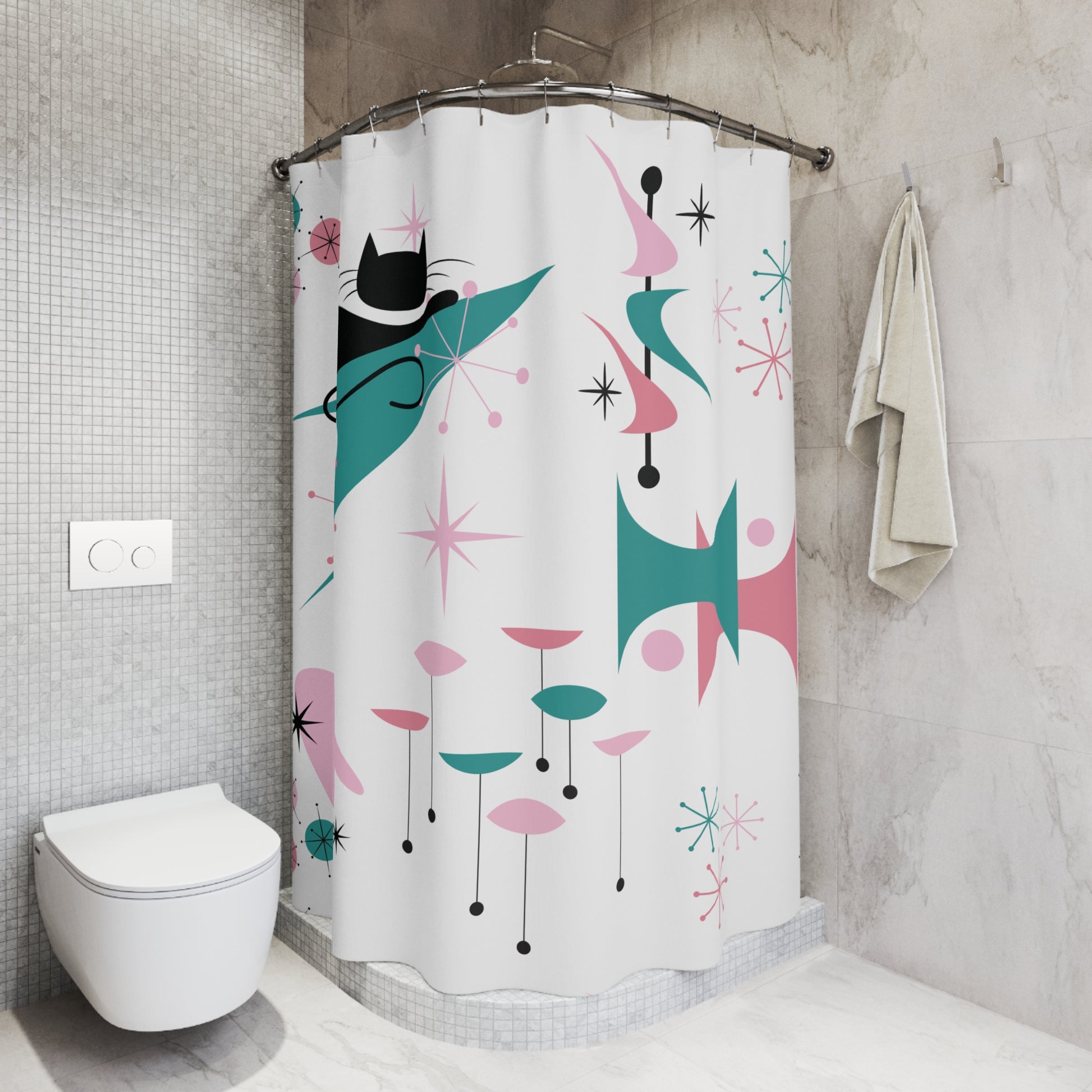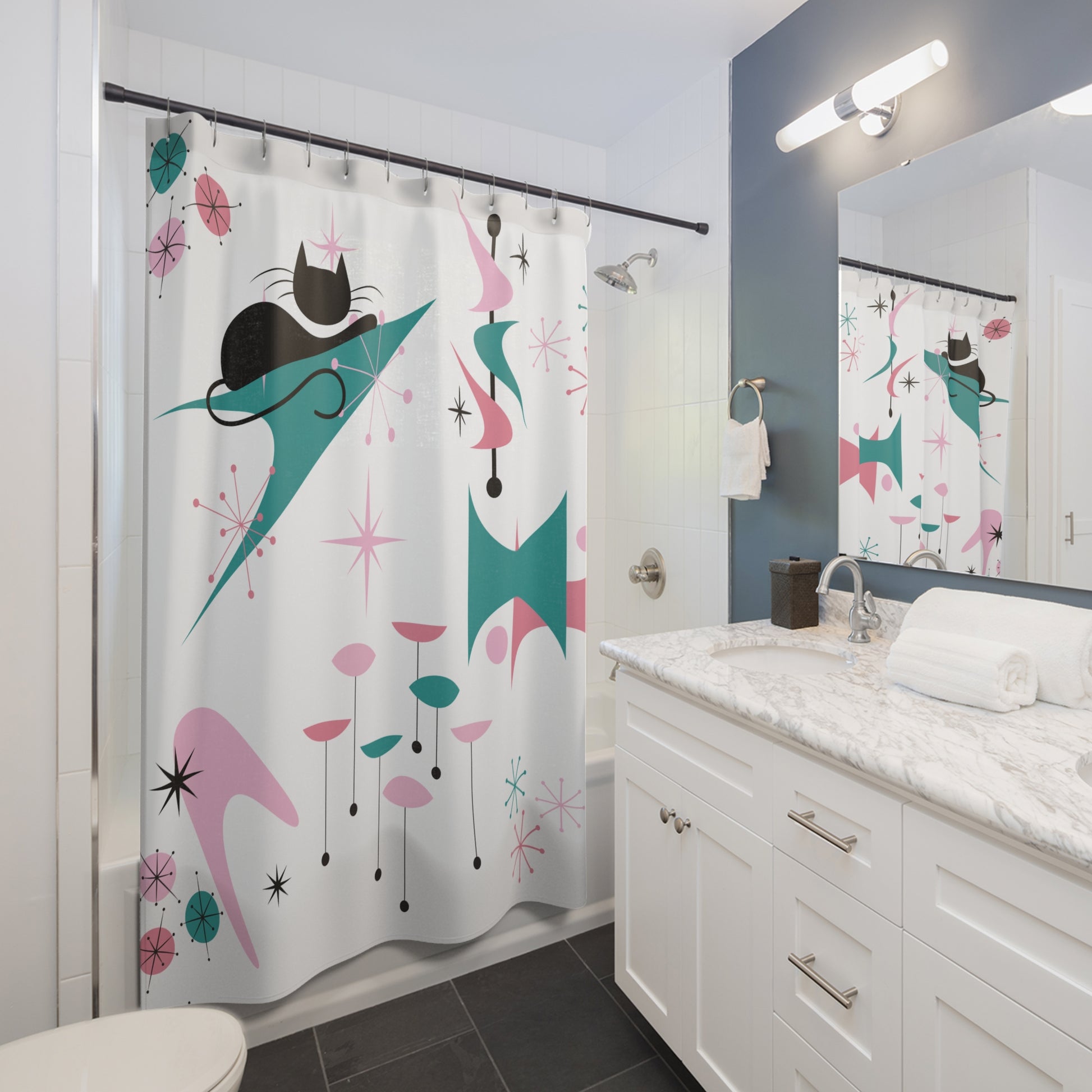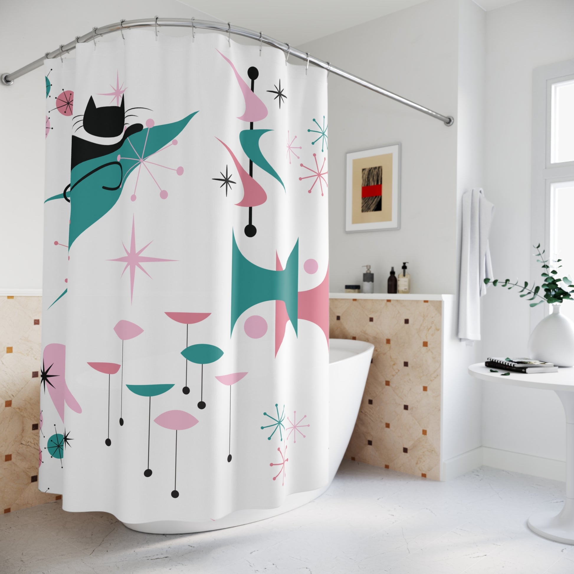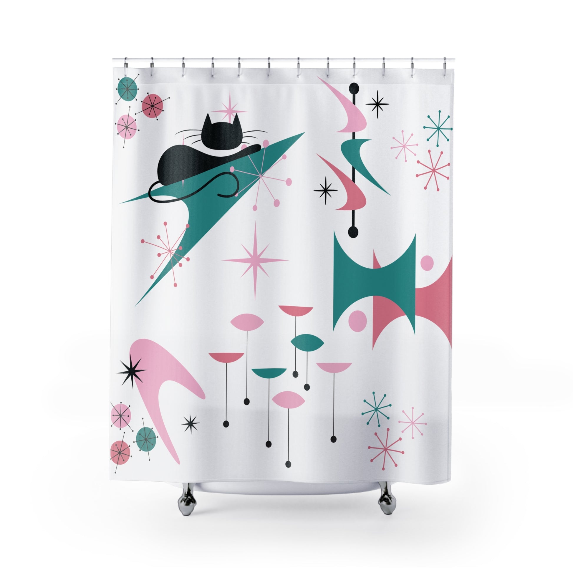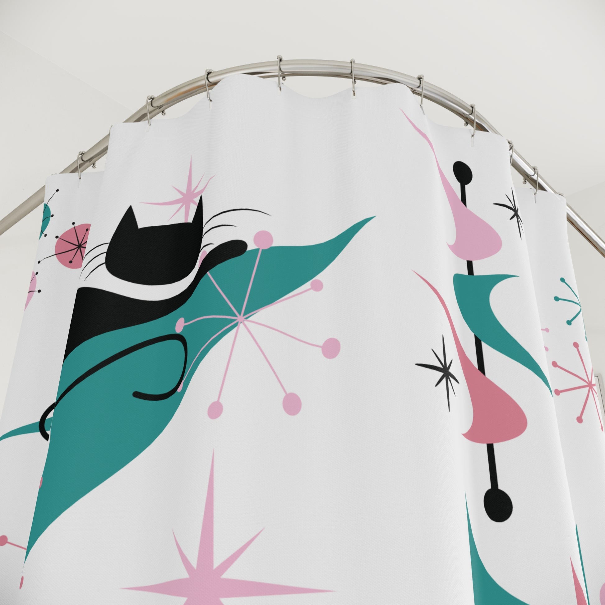 Retro 50s Atomic Black Cat, Boomerang & Starburst MCM Pink, Teal-Green & White Shower Curtain