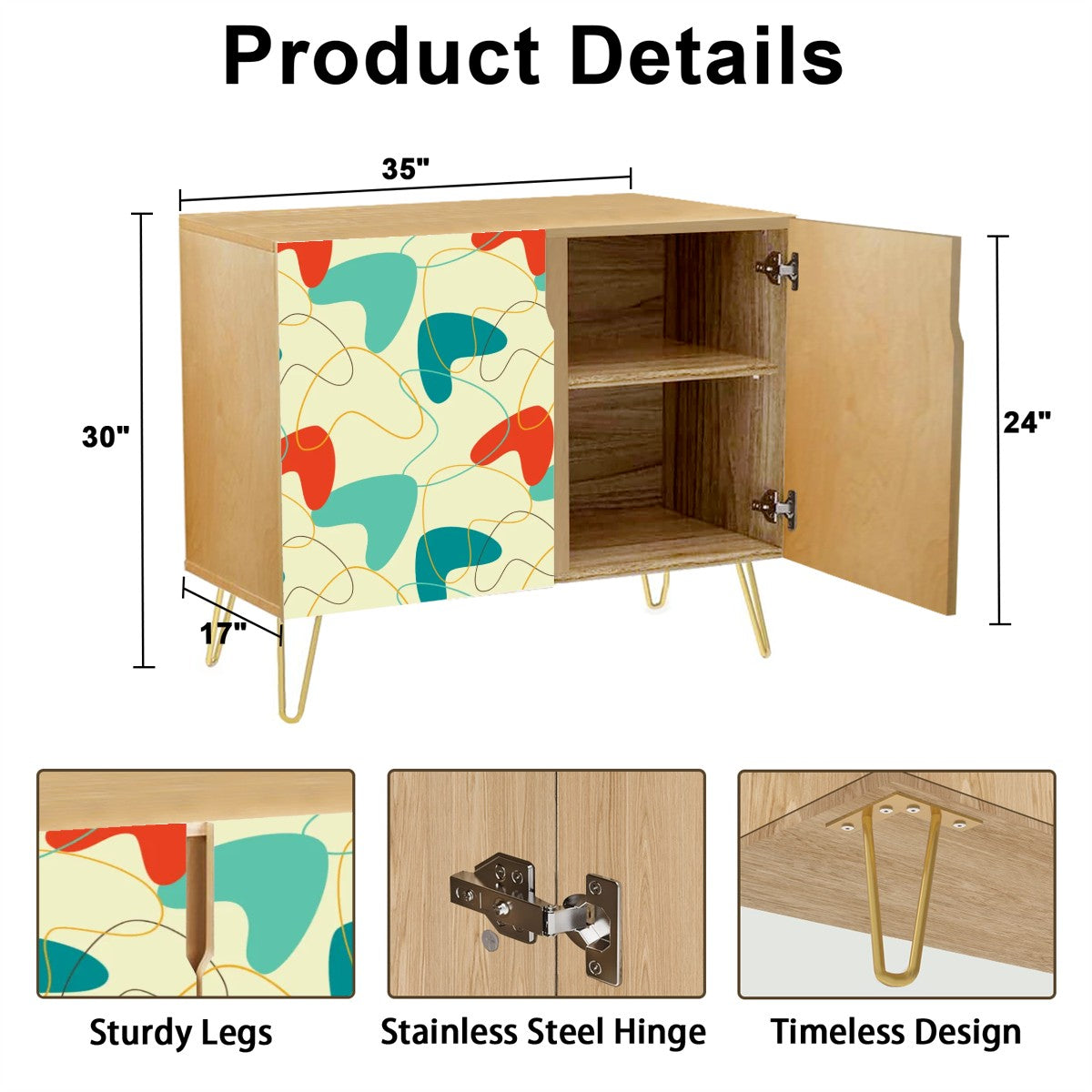 Starring clean lines and iconic gold-tone hairpin legs, our retro 50's atomic boomerang cabinet brings chic mid century modern style to any space! Behind the two doors, an interior shelf keeps your essentials organized; from dishware and bar tools in the dining room, to vinyl records and board games in the living room.