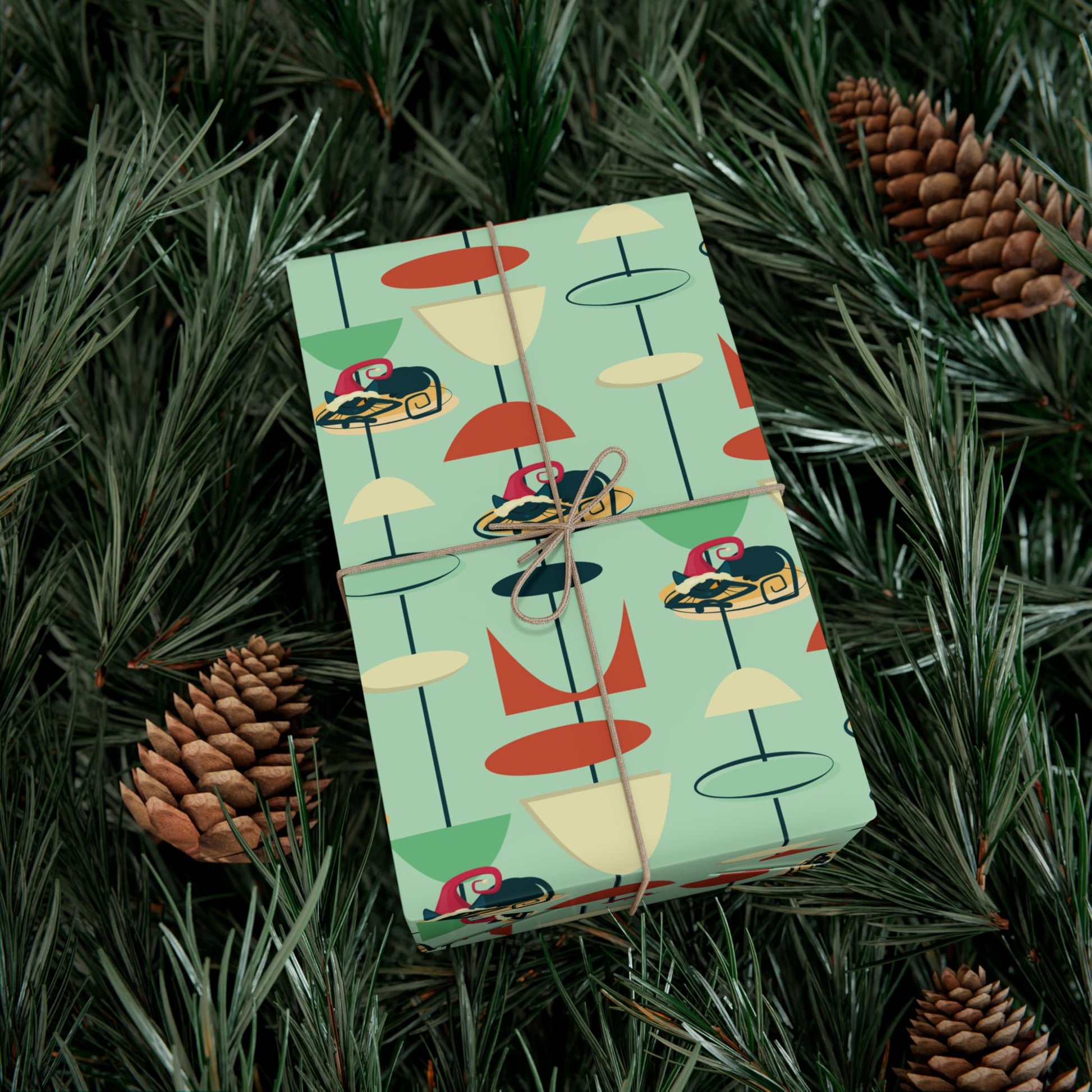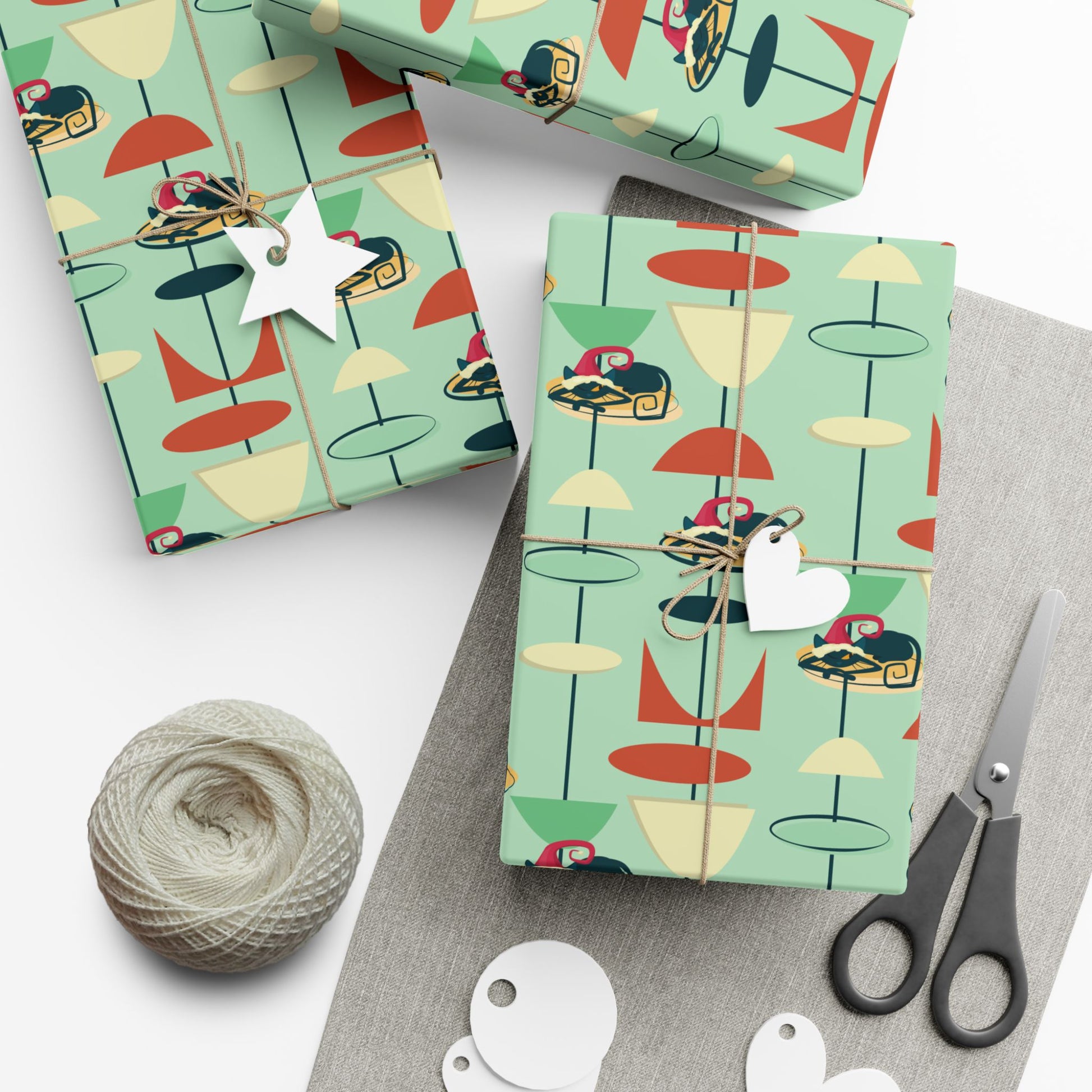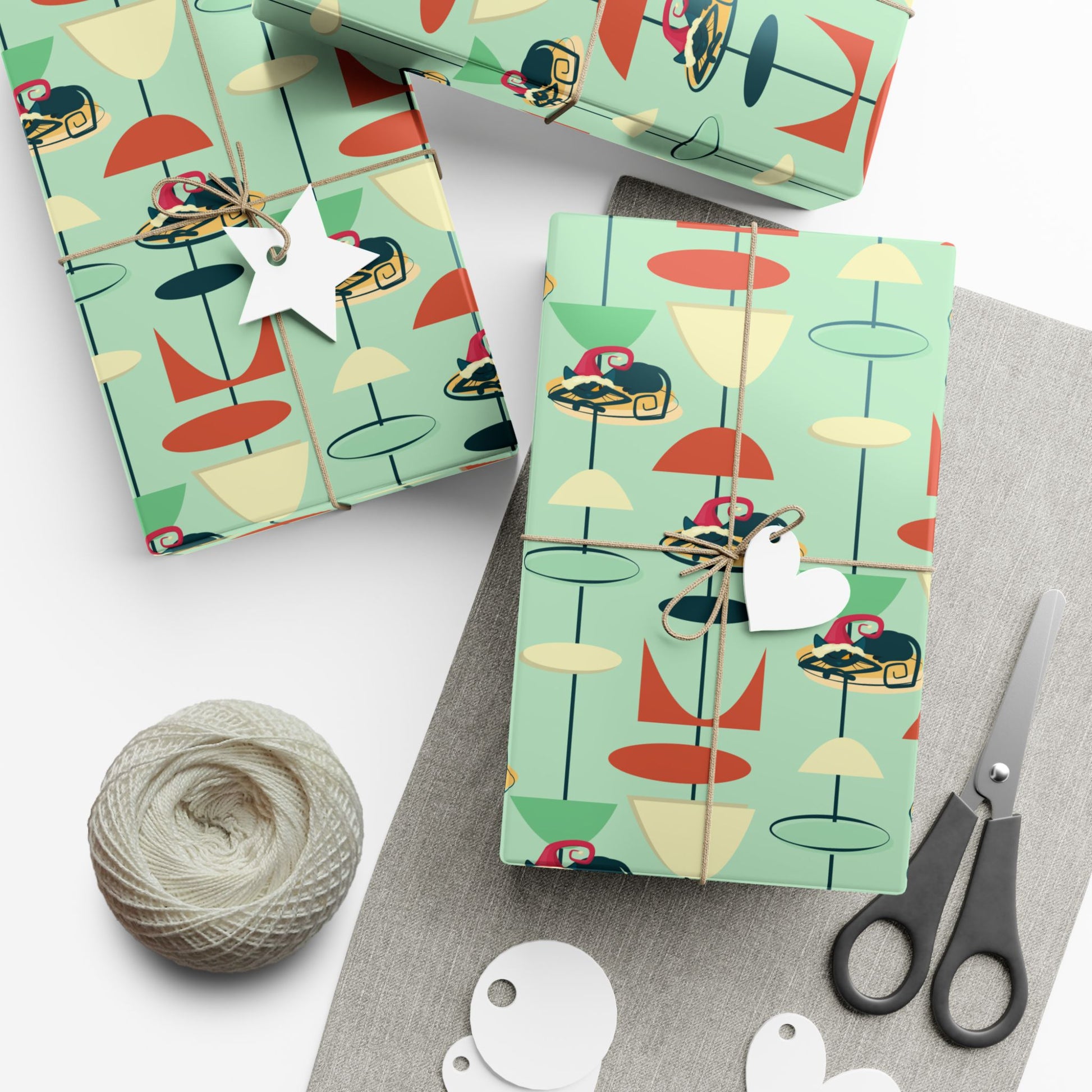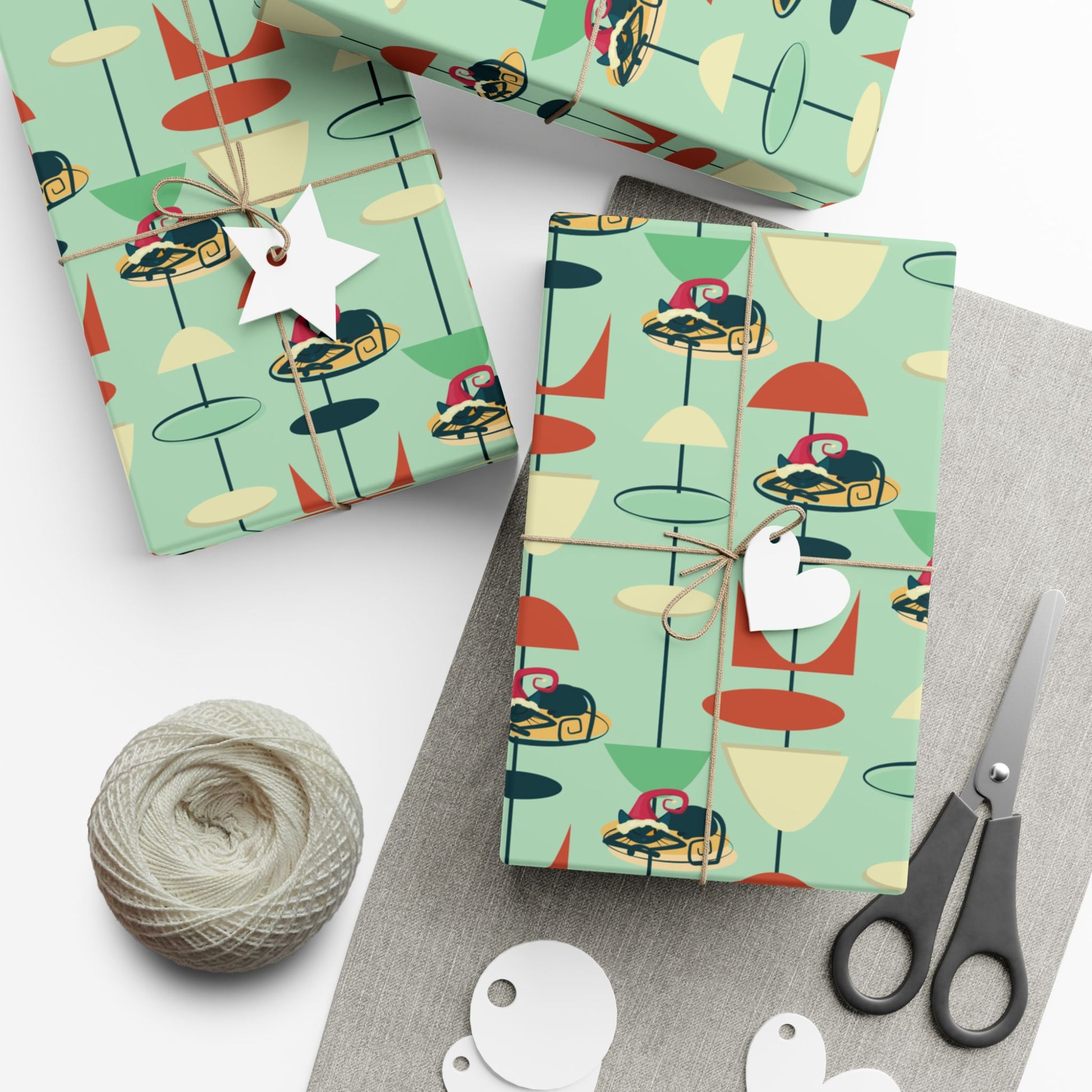 This holiday season, make your gifts pop with personality, style, and a dash of nostalgia, with our retro 50's atomic cat Christmas wrapping paper. Our green, eco-friendly wrapping paper adds a kitschy and playful touch to your presents that's sure to delight the cat lovers and vintage enthusiasts in your life!