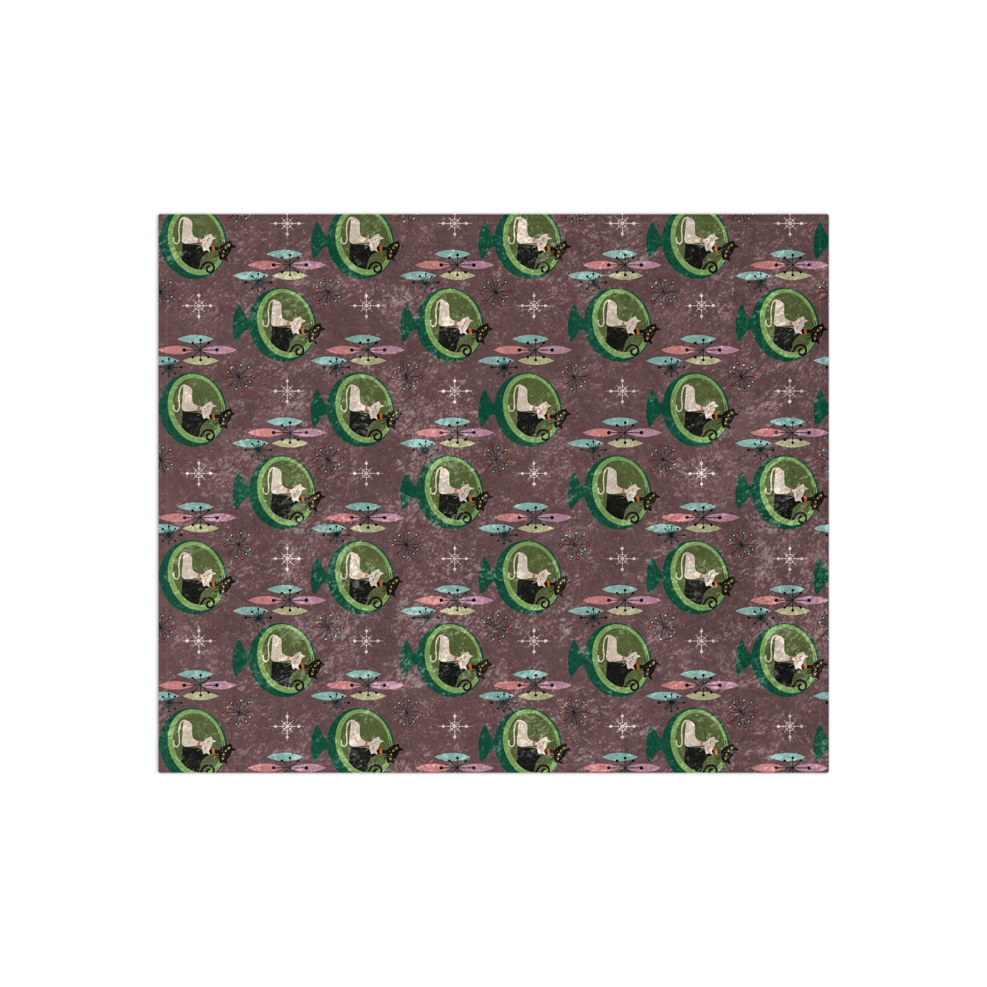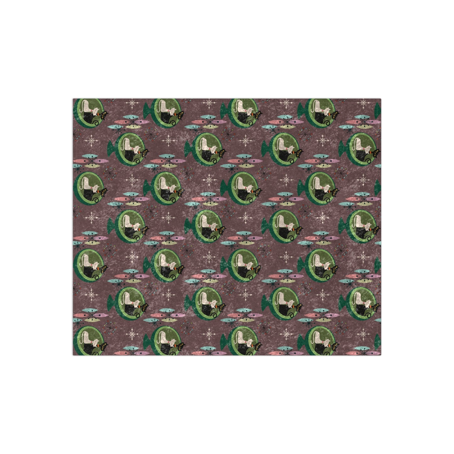 Our taupe mid century mod 50's atomic cat crushed velvet blanket will be your new cozy go-to, when you're getting snuggly during your downtime. Great for a cuddle-sesh AND looks beautiful tossed carelessly into a heap (thanks to the texture of crushed velvet and its shiny finish!)