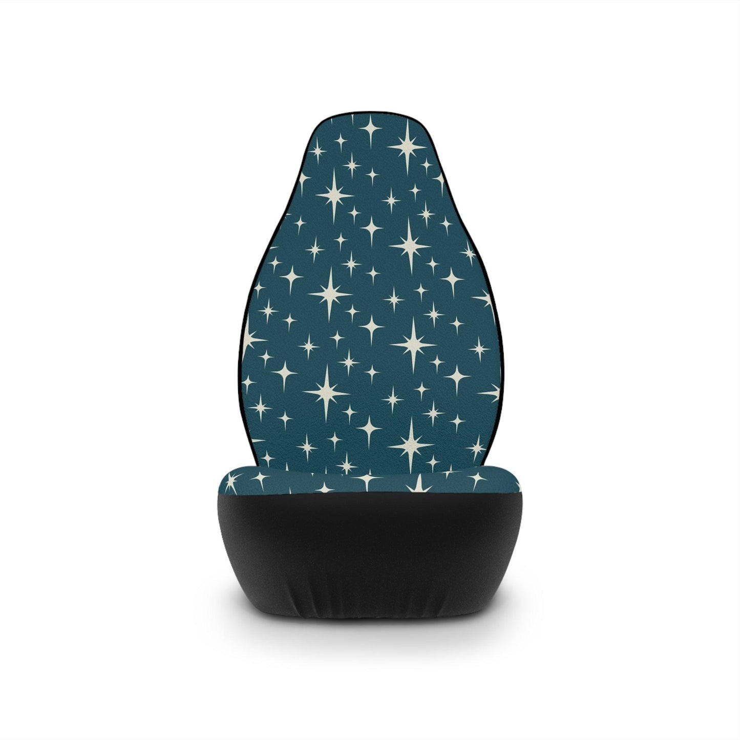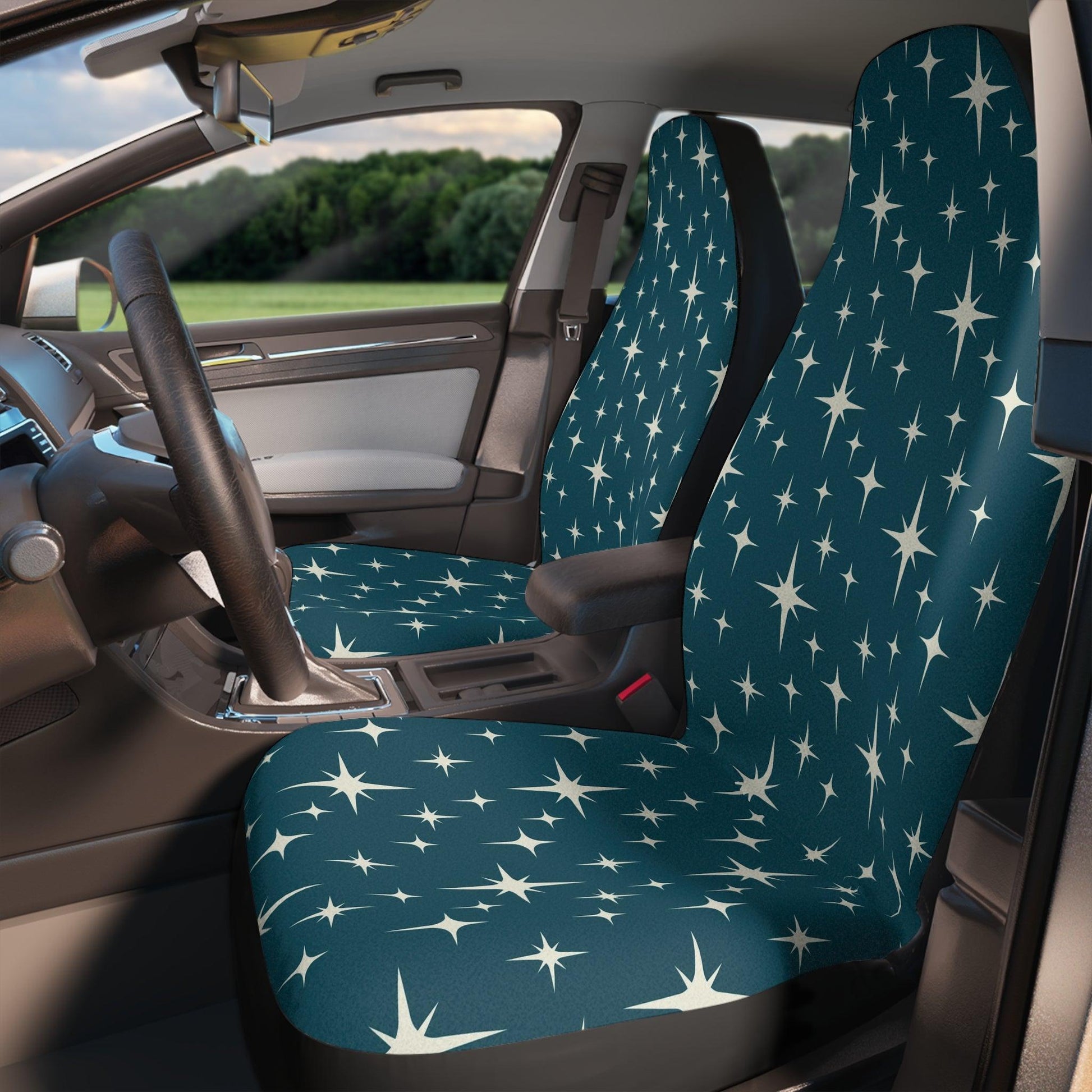Transform your car's interior into a mesmerizing time capsule of retro 50's chic, with our fun mid century atomic starburst car seat covers that reflect your fabulous style! Made of thick, high quality polyester fabric for durability that lasts. Sold as a set of TWO. Important to note that these covers should NOT be used on seats with side airbags or armrests.