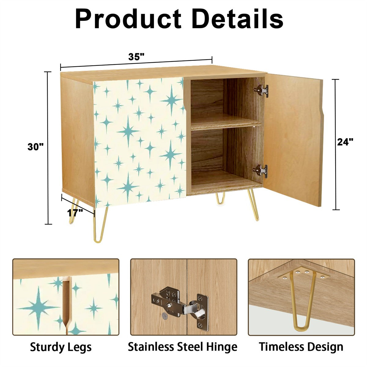 Starring clean lines and iconic gold-tone hairpin legs, our blue and off-white retro 50's atomic starburst sideboard cabinet brings timeless mid century modern style to any space! Behind the two doors, an interior shelf keeps your essentials organized; from dishware and bar tools in the dining room, to vinyl records and board games in the living room.