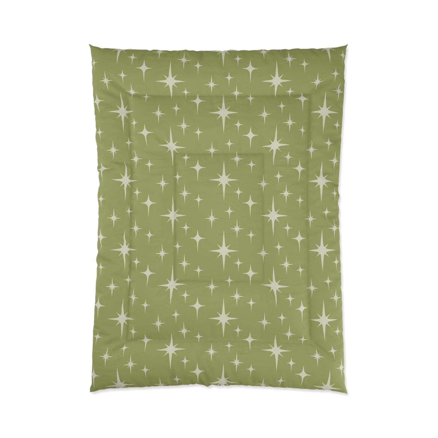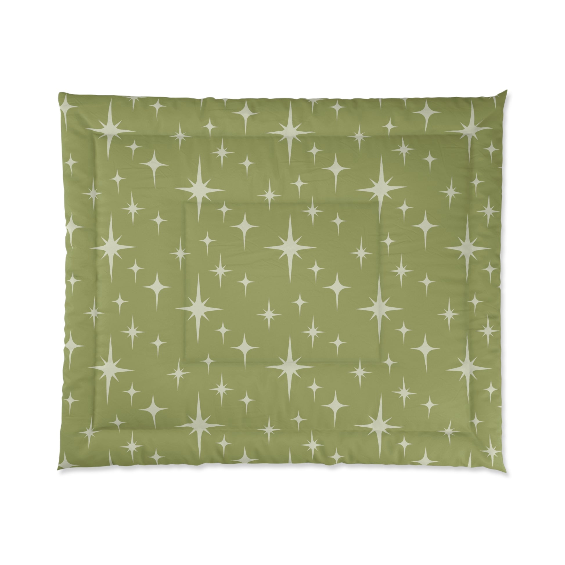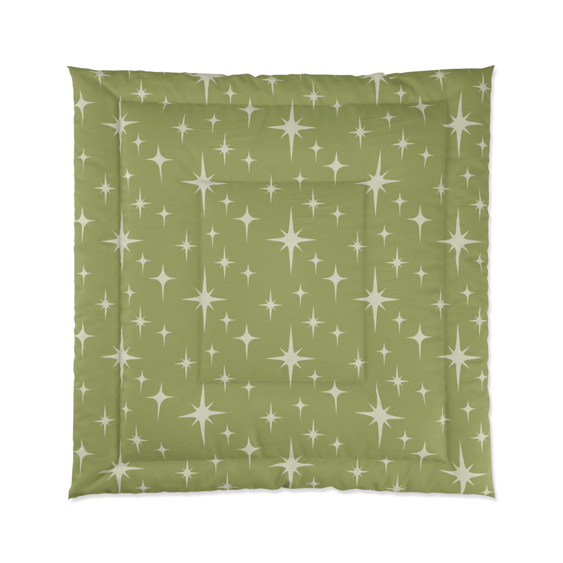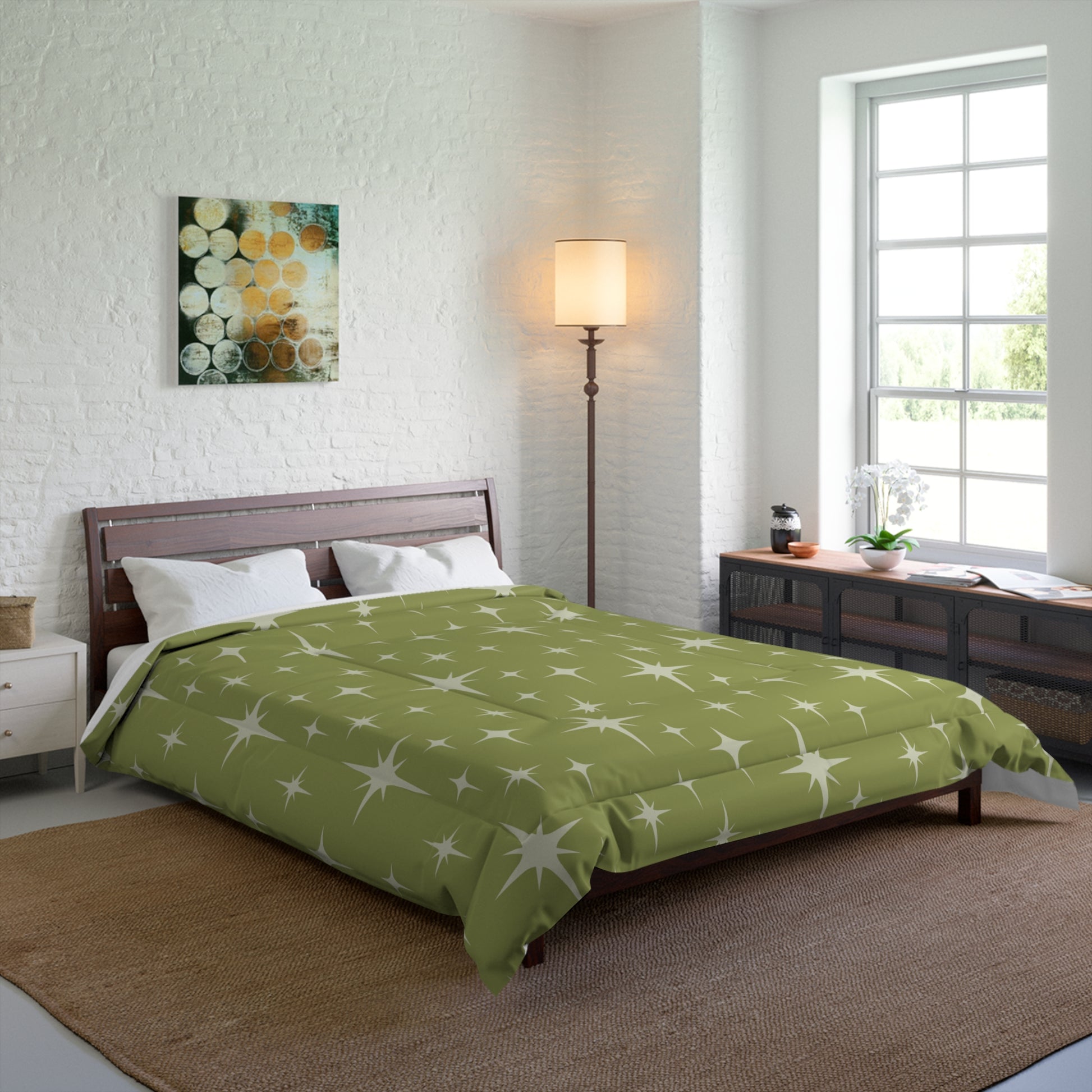 The chic atomic starburst design gives this lightweight comforter 1950's mid century style, with a chartreuse green color palette! This gorgeous comforter looks like it came right out of the mcm era, which is perfect for your retro aesthetic bedroom or guest room!