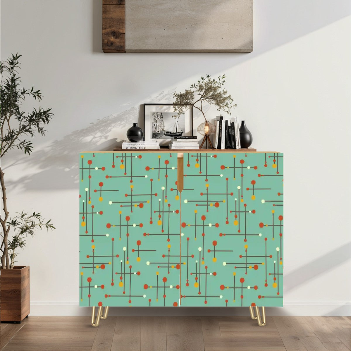 Starring clean lines and iconic gold-tone hairpin legs, our retro 50's Eames lines inspired, teal blue sideboard cabinet brings timeless mid century modern style to any space! Behind the two doors, an interior shelf keeps your essentials organized; from dishware and bar tools in the dining room, to vinyl records and board games in the living room.