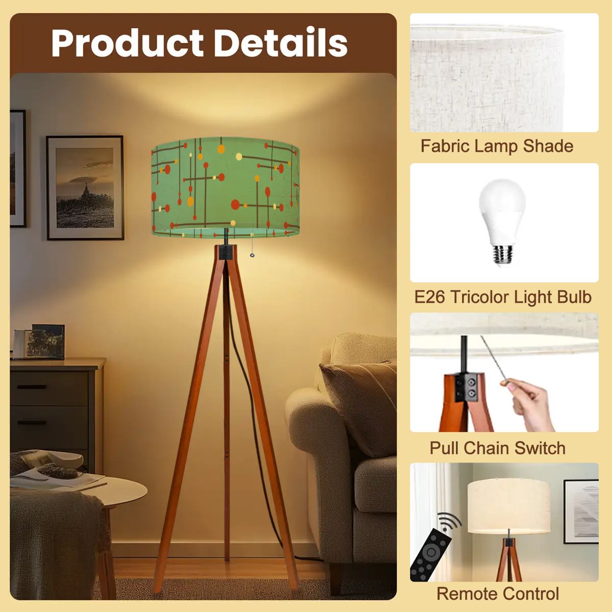 - Includes tripod base, lampshade, LED smart bulb, remote and assembly instructions
