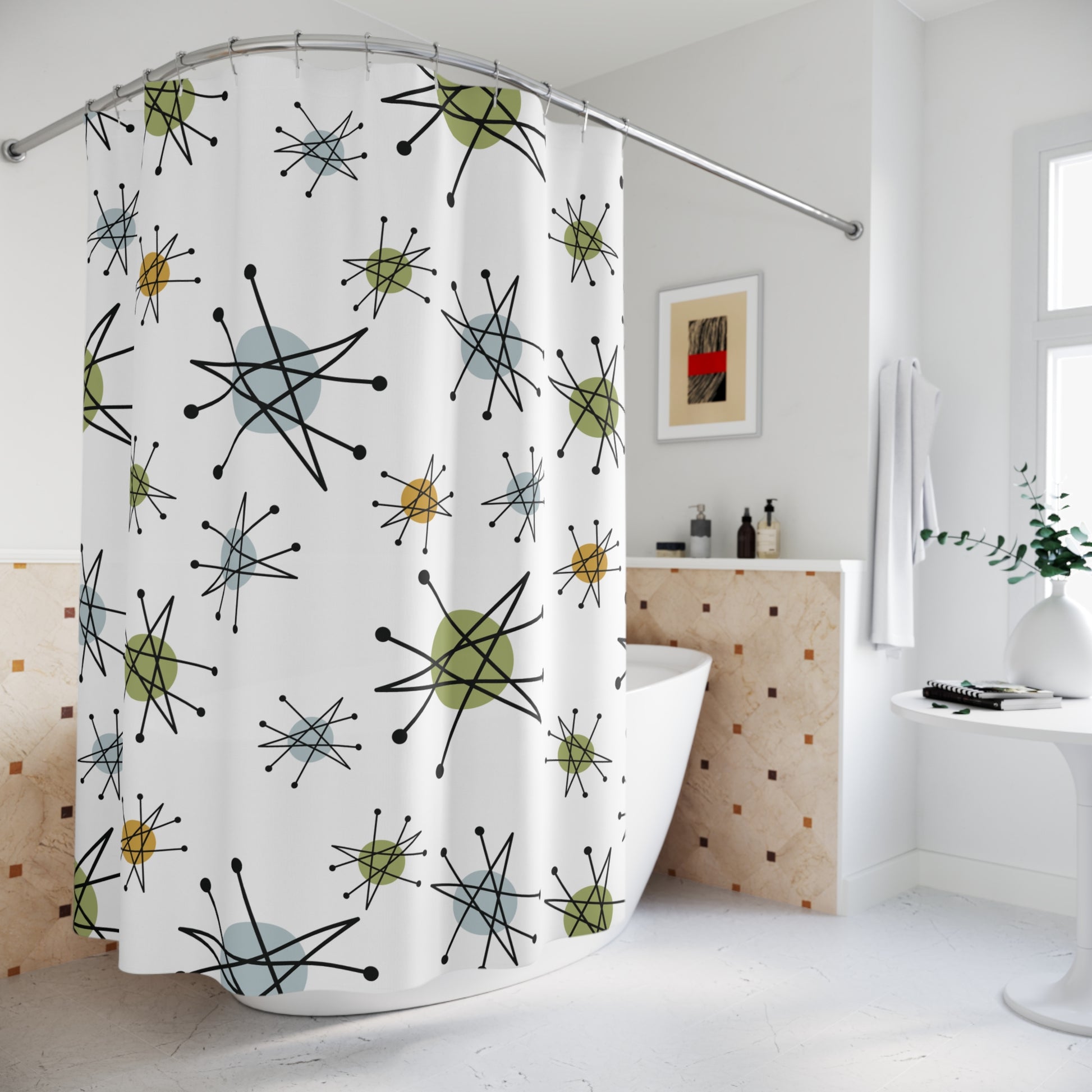 Bring some 1950's mid century inspired design to your bathroom, with our Franciscan starburst inspired shower curtain, that features atomic bursts in chartreuse green, mustard and blue, giving it a fresh, yet retro feel. Changing your shower curtain is an easy way to bring some 50's style to your bathroom! Matching bath mat also available.