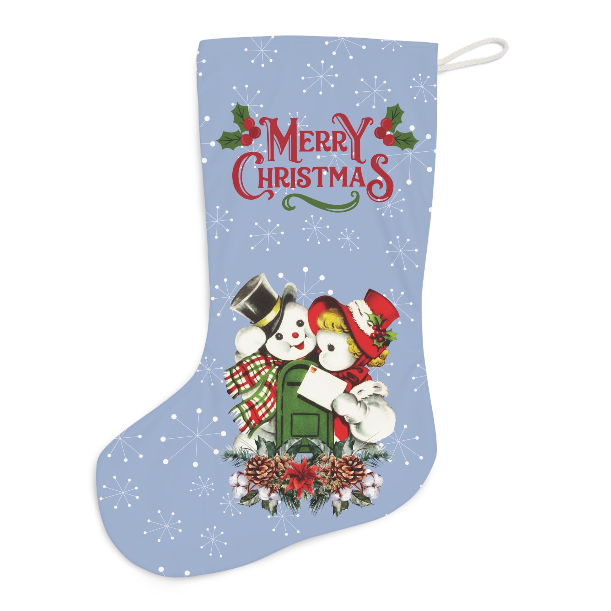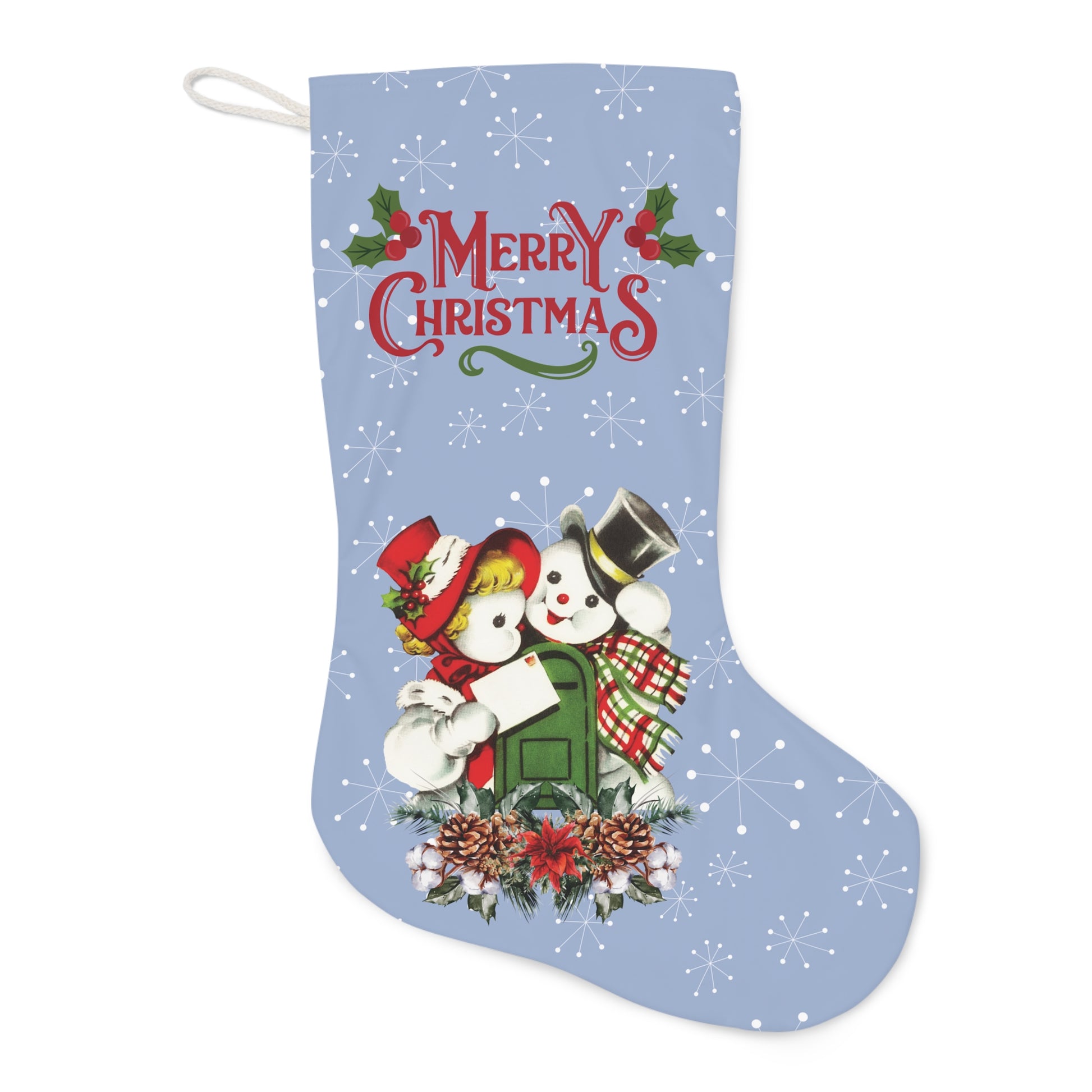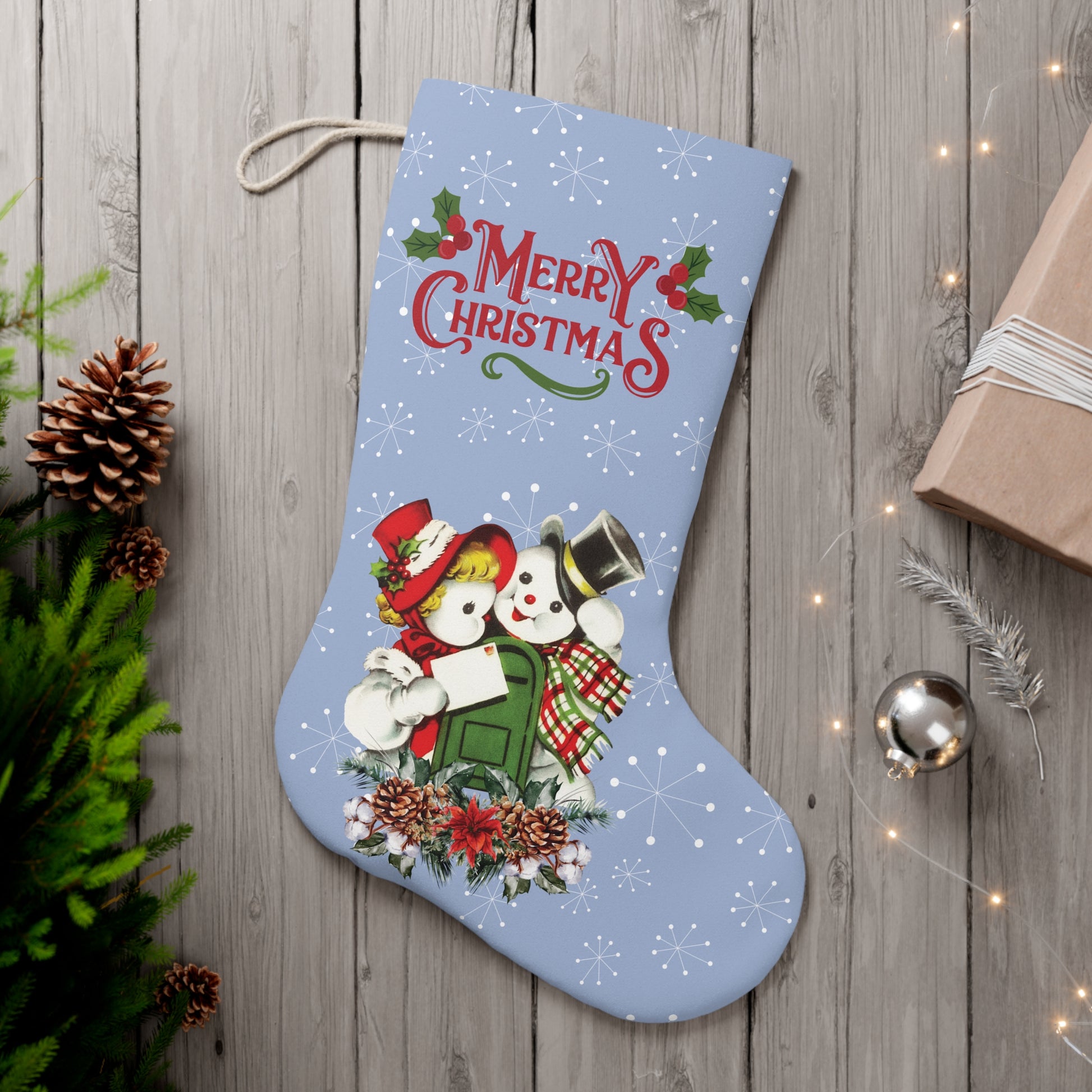 Our charmingly retro, blue 1950's style Christmas stocking is adorned with the sweetest vintage snowman couple sending you wishes to have a Merry Christmas! It's the perfect addition to your retro 50's and 60's mid century modern holiday decor. Beautiful functional decor that adds nostalgic mcm style to your home, and spreads smiles & festive cheer too!
