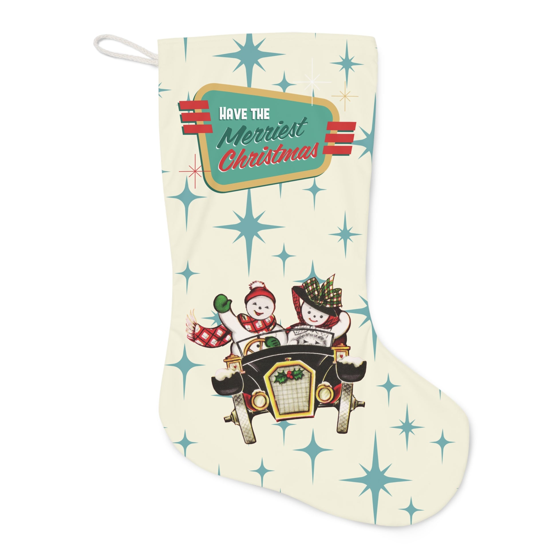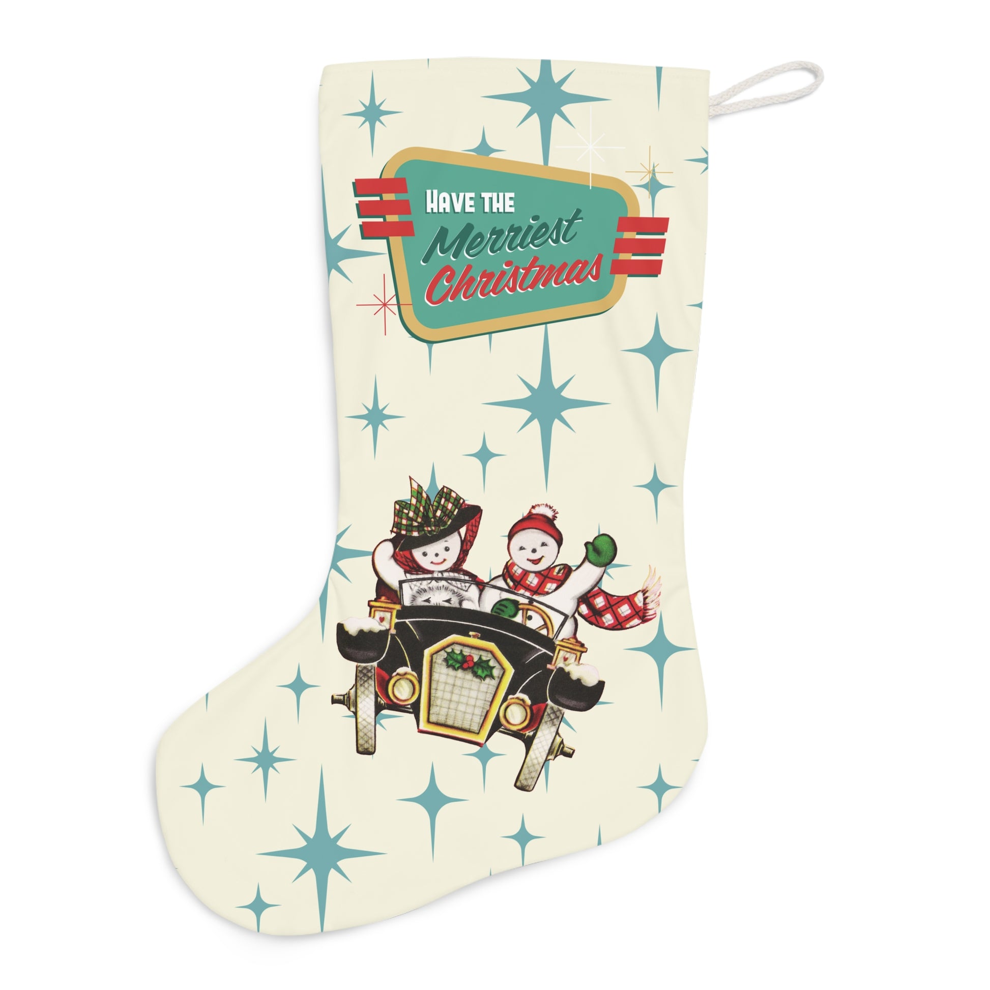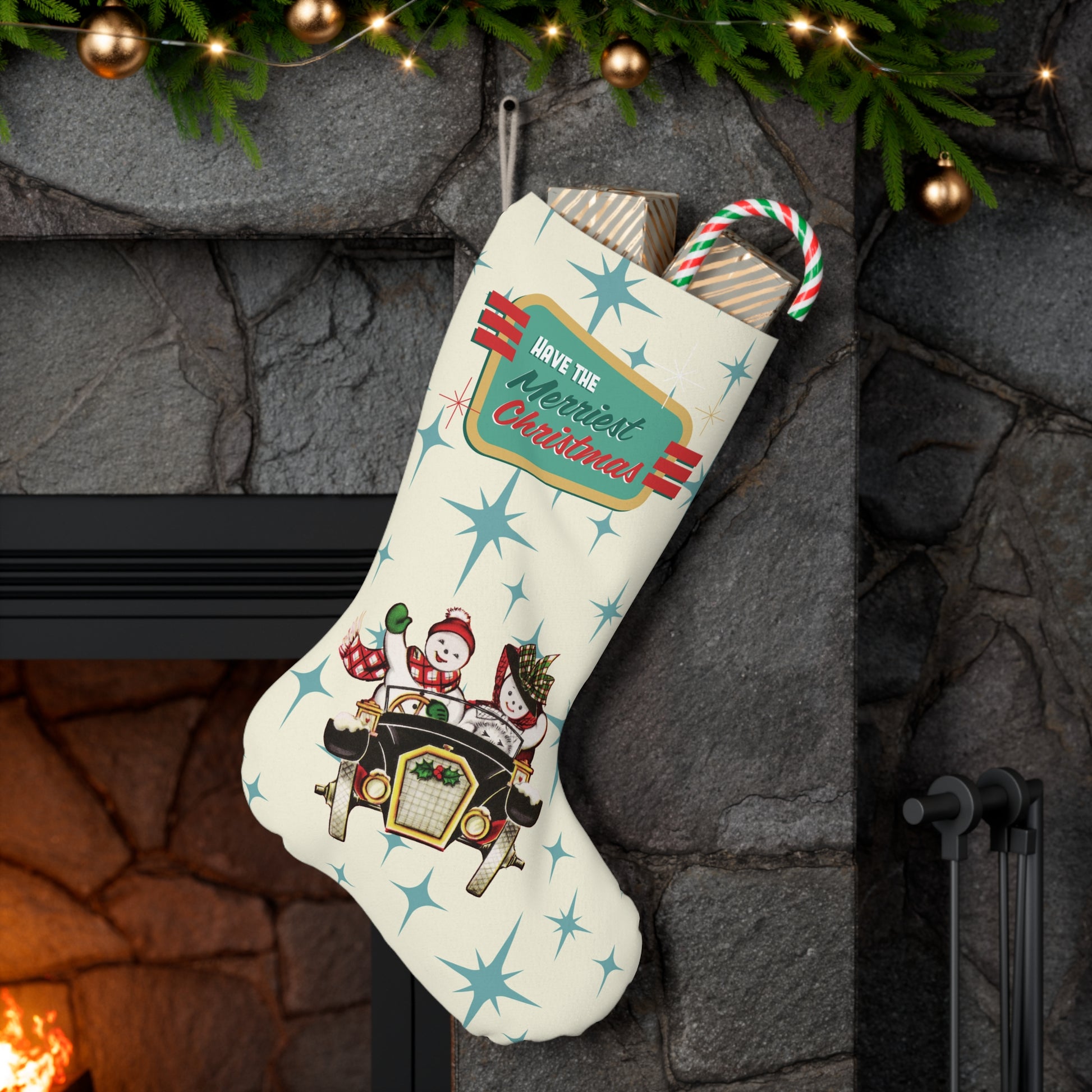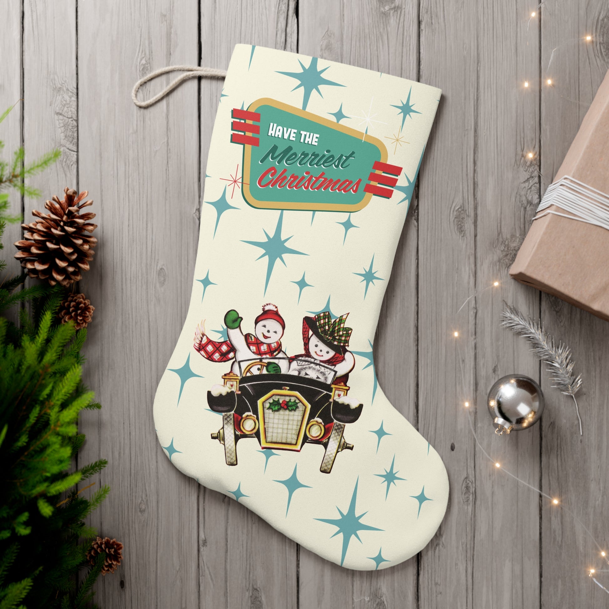 Retro 50s Vintage Snowman Couple, Atomic Starburst Mid Century Cream & Blue Christmas Stocking