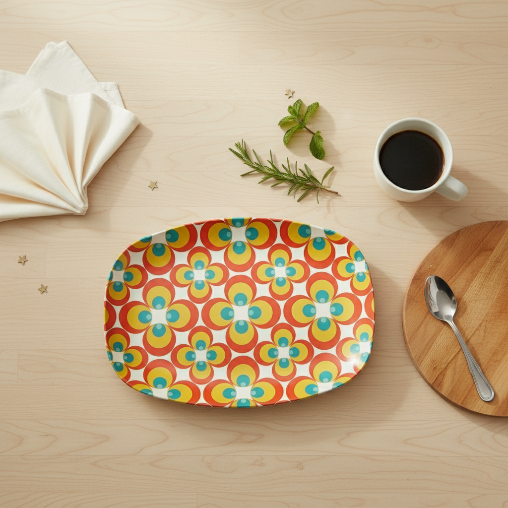 Our retro 60's and 70's serving platter brings the charm of the atomic era straight to your table; with its bold flower design, bright colors, and that effortless mcm cool that makes even crackers and cheese feel like a moment!
