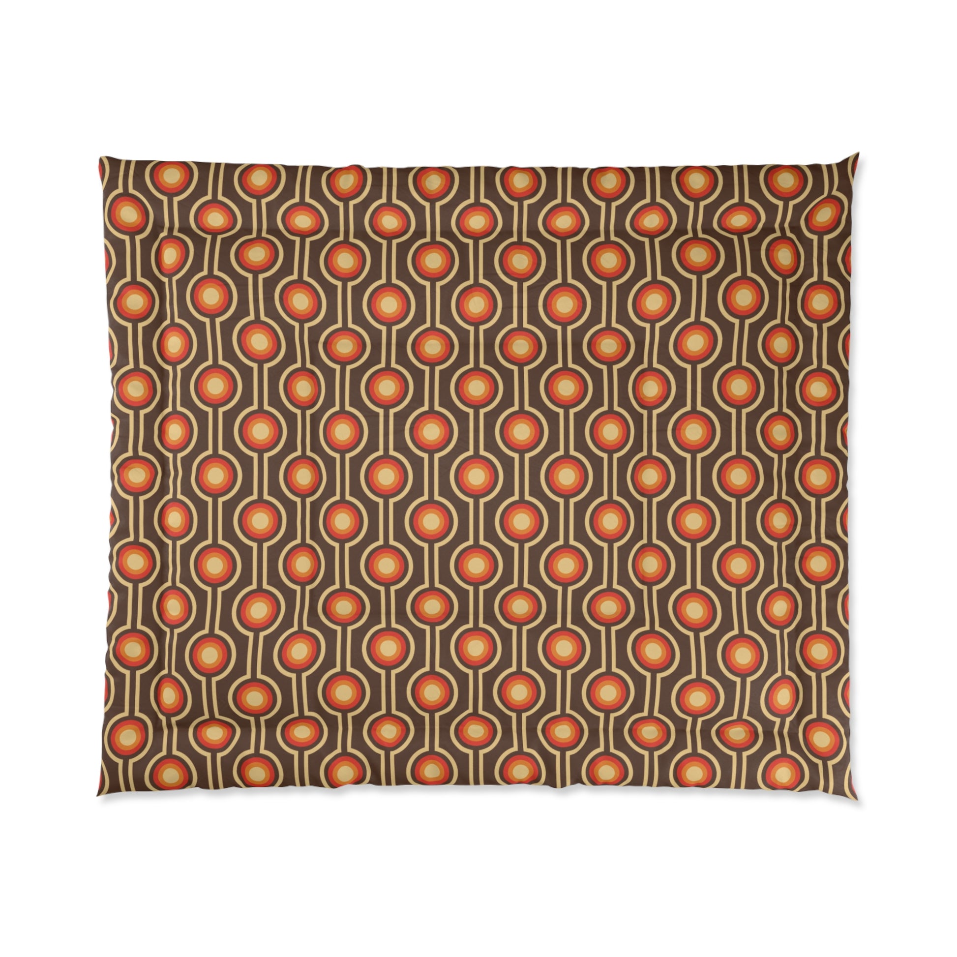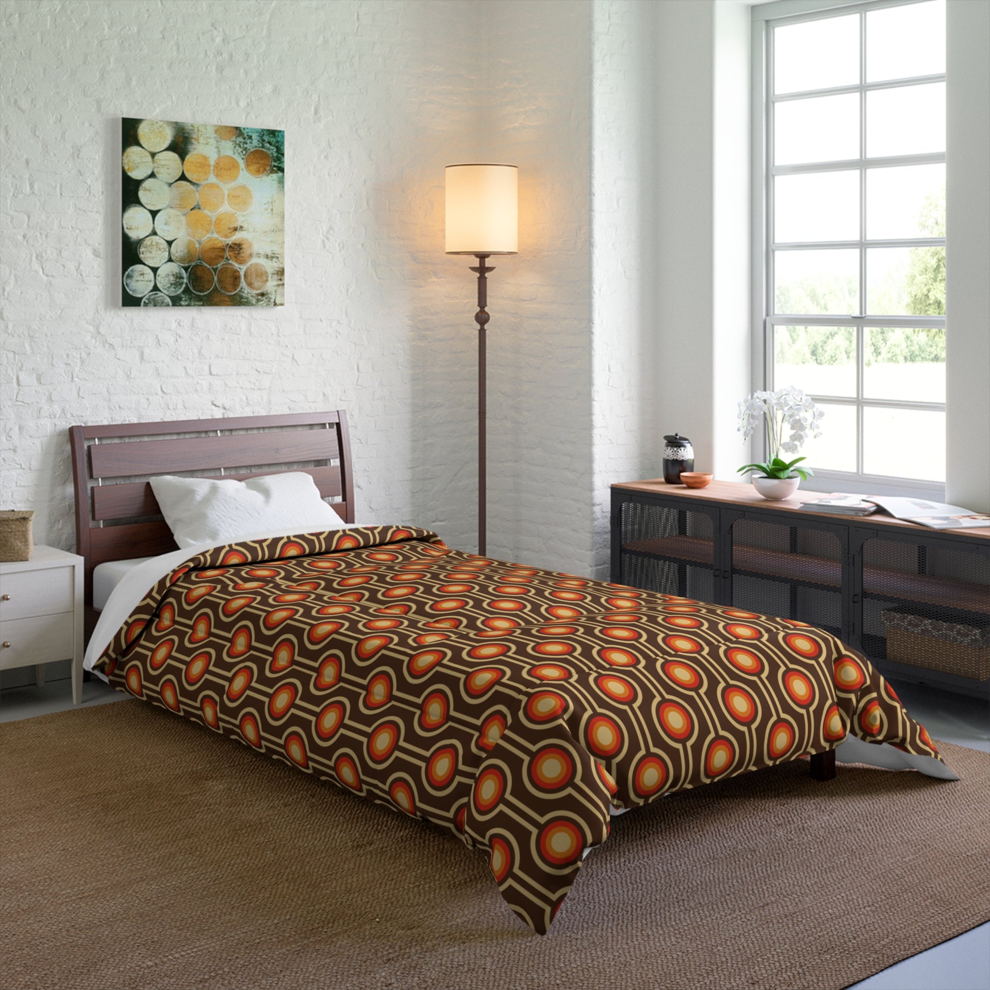 The funky geometric pattern gives this lightweight comforter a lot of fun, retro style with a mid century mod brown and orange color palette! This gorgeously funky comforter looks like it came right out of the 1960's or 70's, which is perfect for your retro aesthetic!