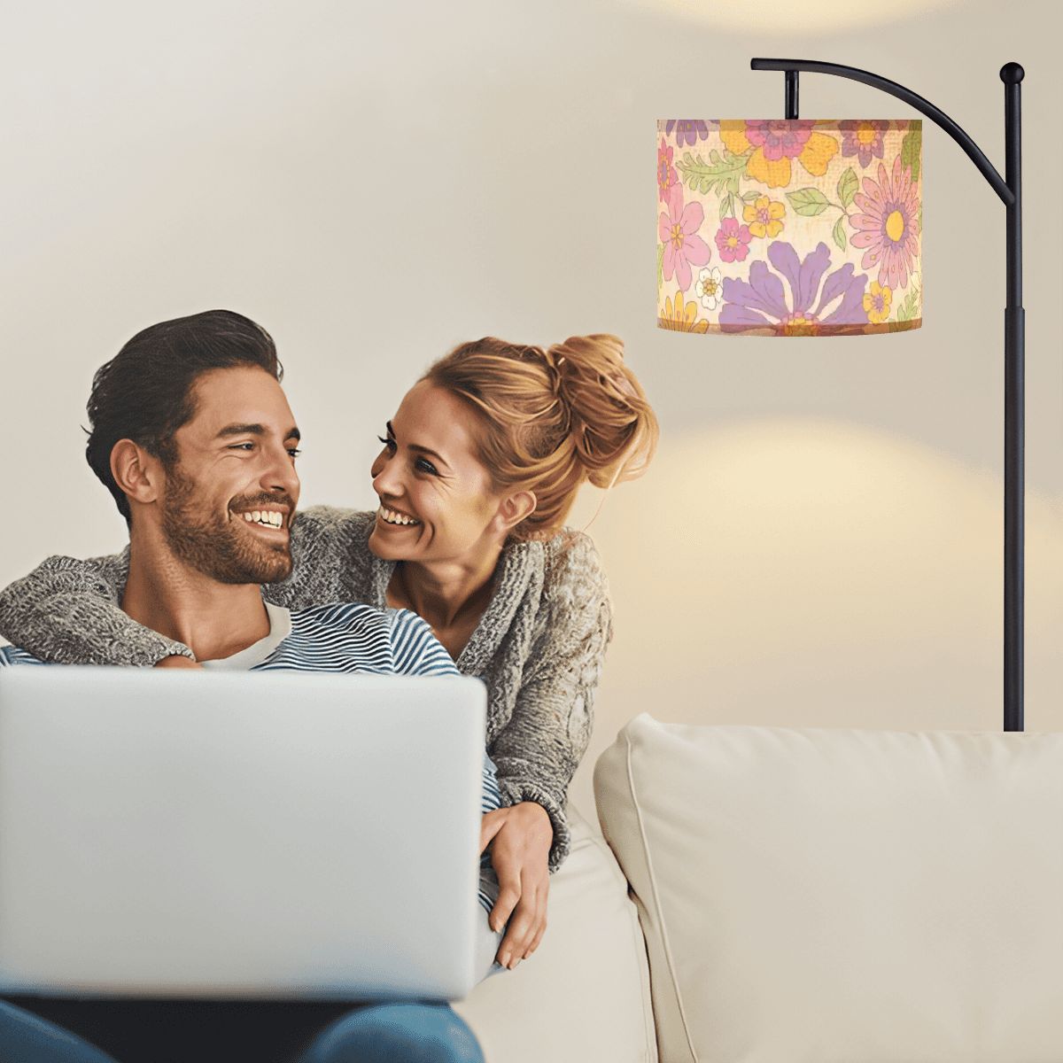 Retro 60s 70s Groovy Boho Flowers Pink, Yellow & Purple Mid Century Modern Arc Floor Lamp