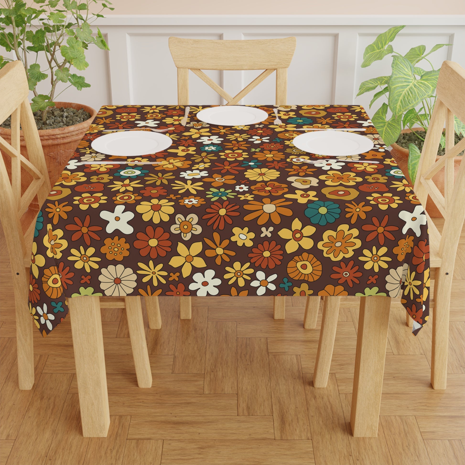 Dress your table with our retro floral mid century tablecloth for some groovy style and a pop of color! This bold and funky color palette and fun flower power design will bring some 60's and 70's vibes to your table. Dining in has never looked so stylish!