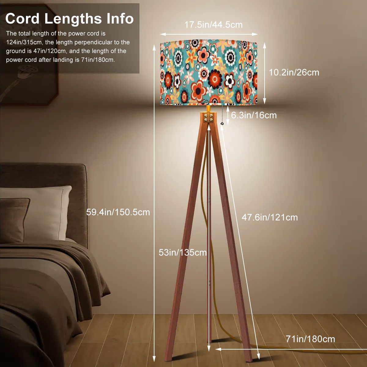 Our groovy boho 60's / 70's blue, coral and yellow floral tripod floor lamp blends retro mid century charm with smart functionality, allowing you to enjoy the best of both worlds! Use the classic pull-cord switch for a nostalgic touch or the included remote to switch effortlessly between cool, warm, and neutral light. Whether you’re curling up with a book or setting the mood for a gathering, this lamp delivers the perfect ambiance.