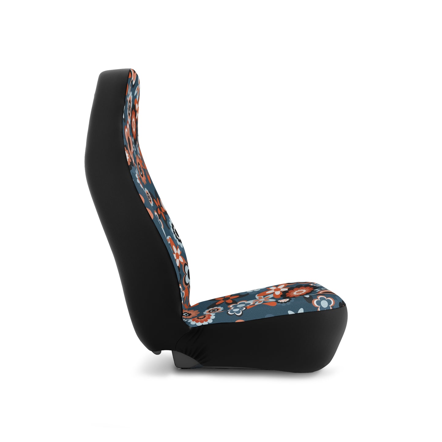 Customize your car's interior with fab 60's and 70's boho flower car seat covers that reflect your groovy mid century hippie style in a fun coral and blue color palette! Made of thick, high quality polyester fabric for durability that lasts. Sold as a set of TWO. Important to note that these covers should NOT be used on seats with side airbags or armrests.