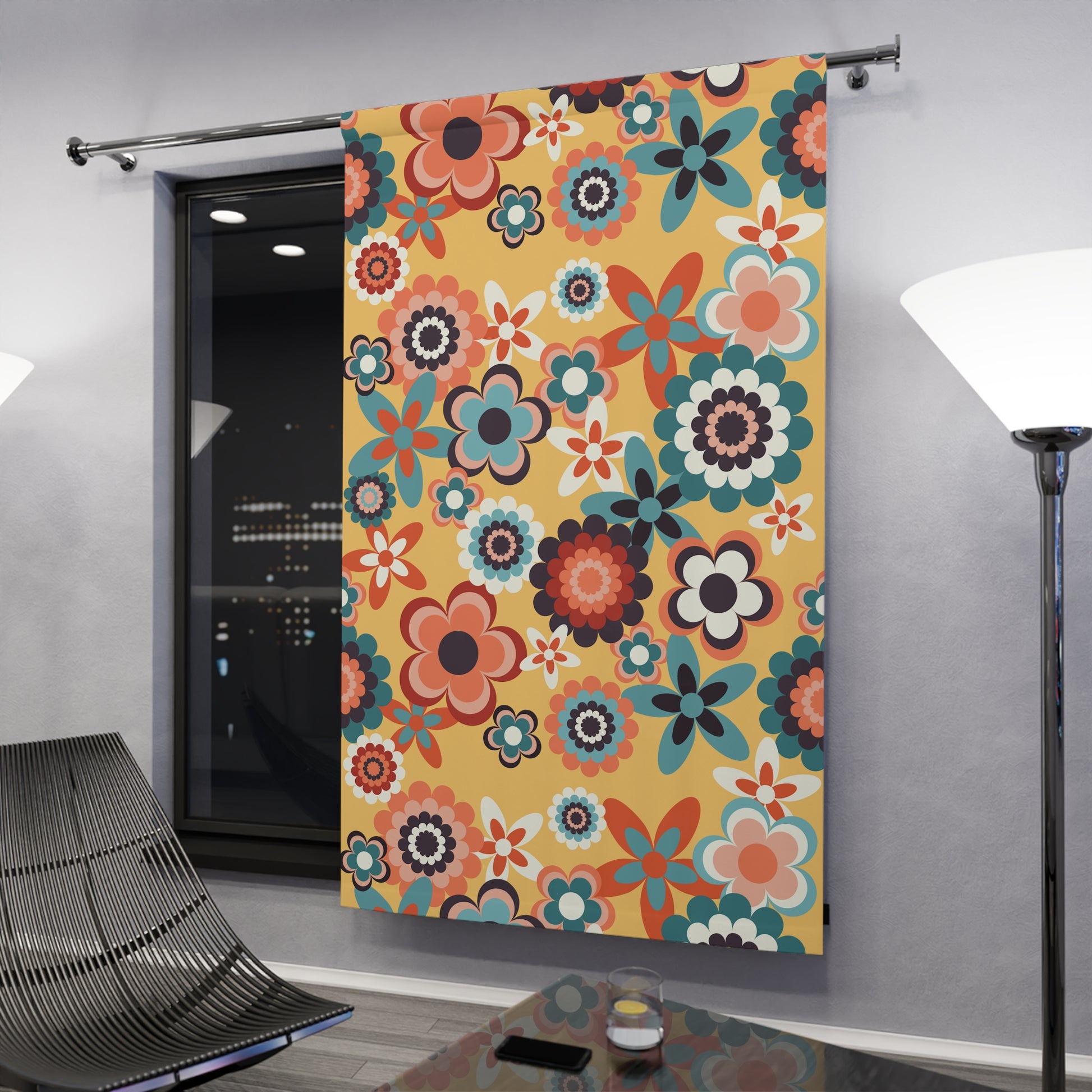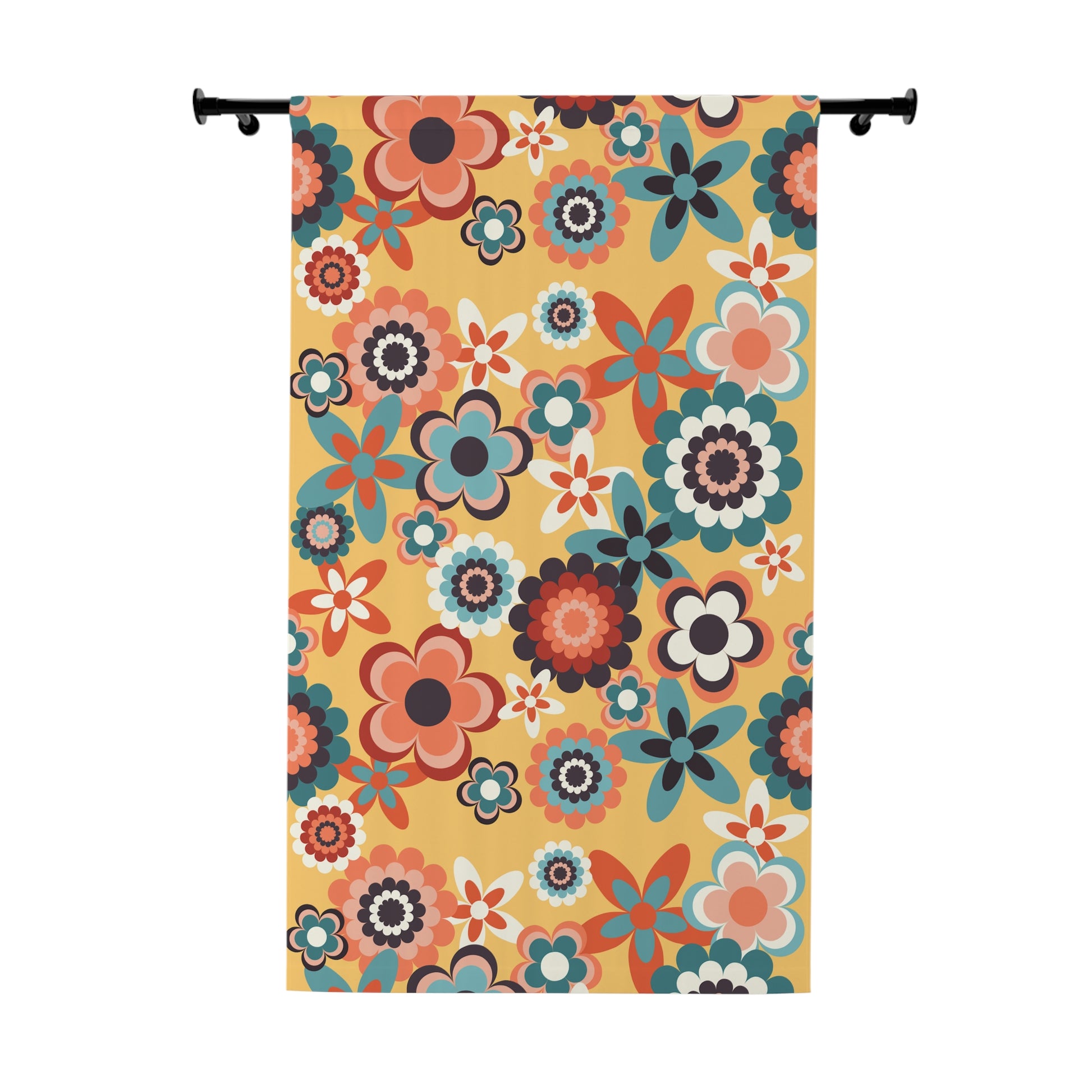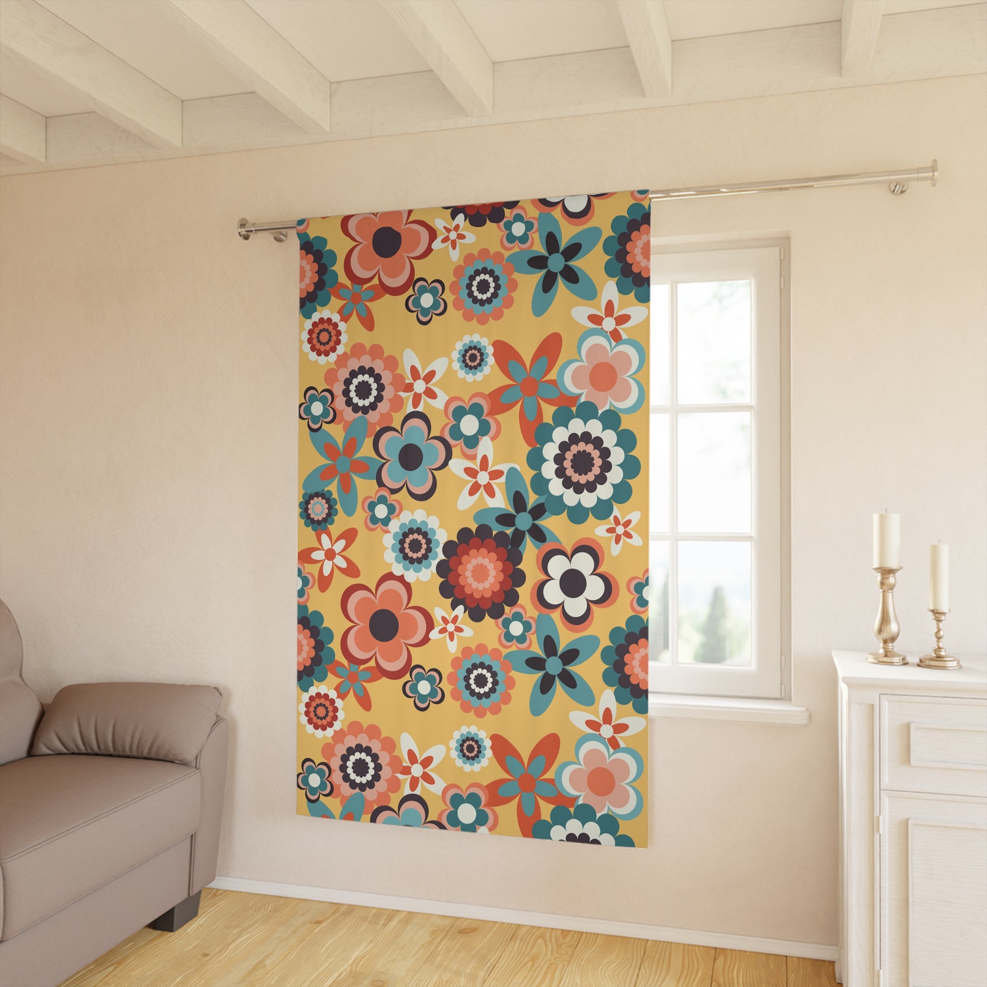 Retro 60s 70s Groovy Flowers Boho Mid Century Mod Yellow, Coral & Blue Blackout Window Curtain