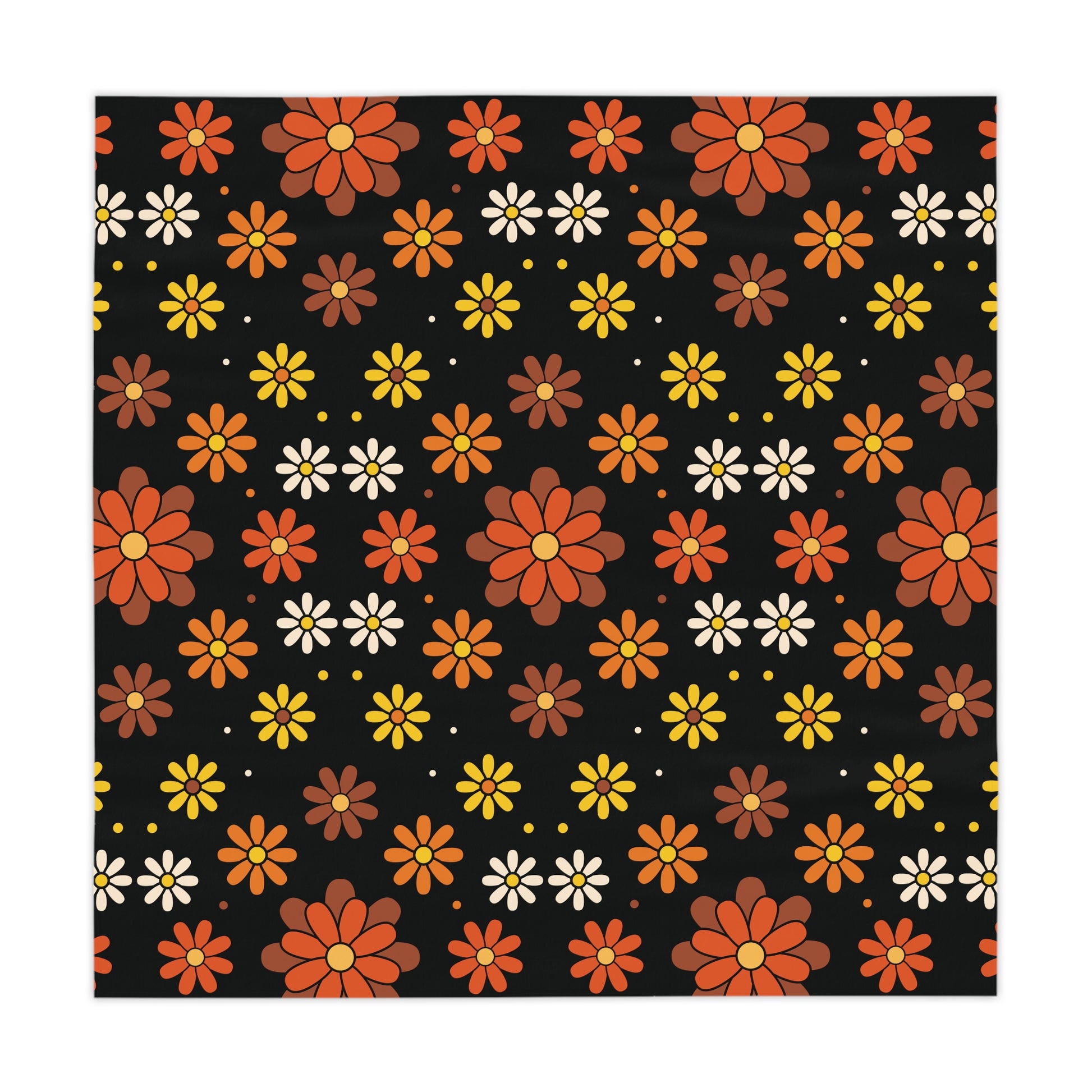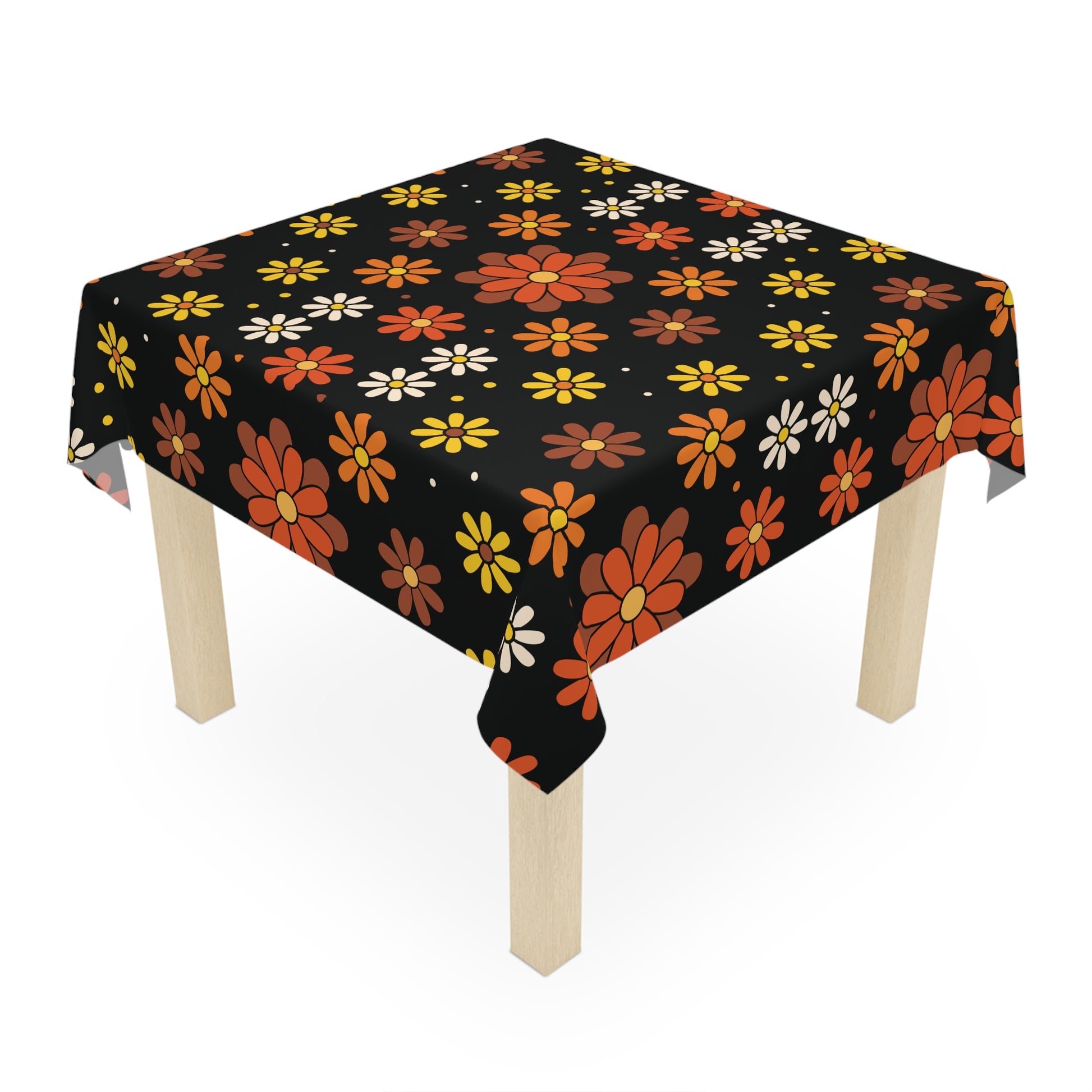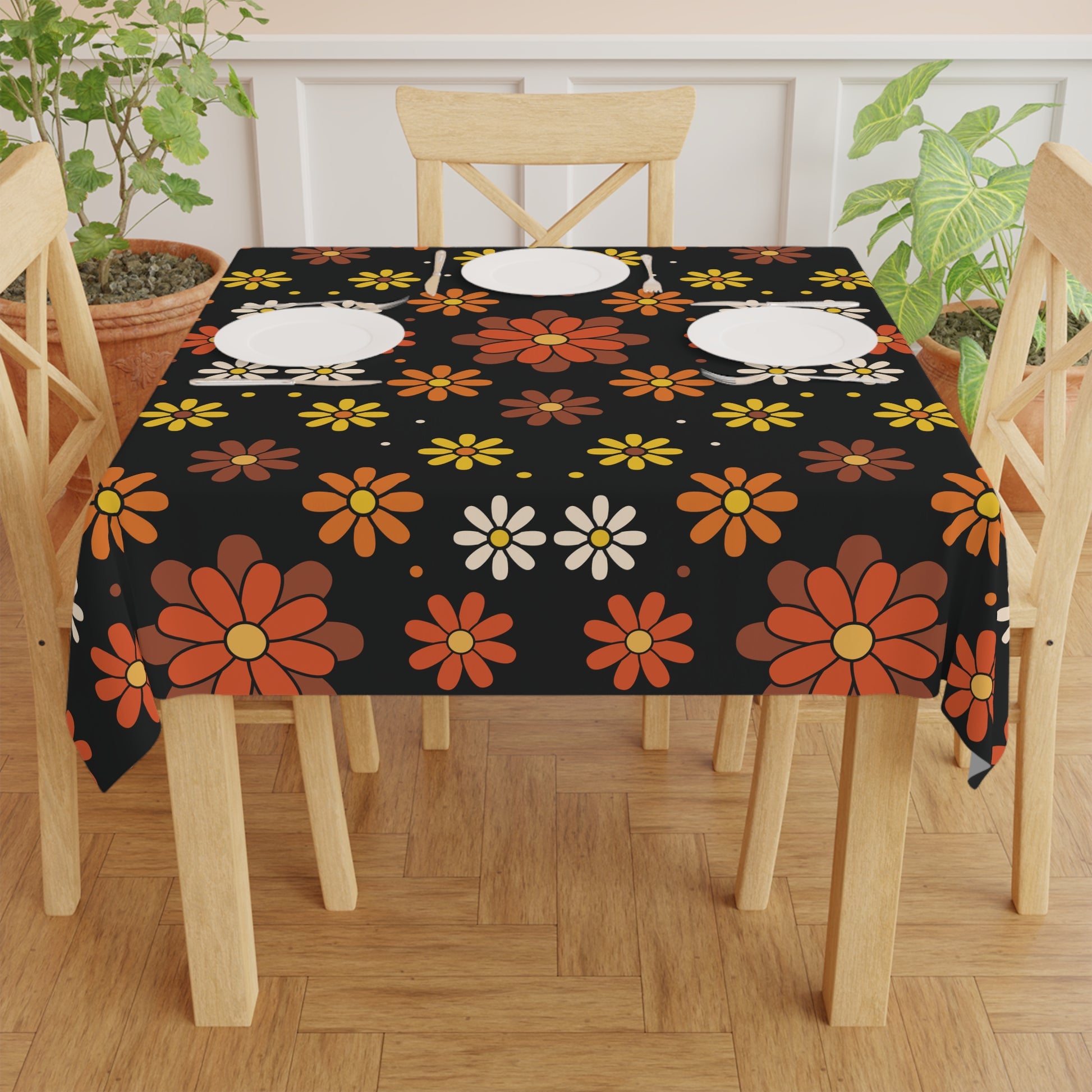 Retro 60s 70s Groovy Mod Daisy Floral Mid Century Black, Brown & Orange Tablecloth
