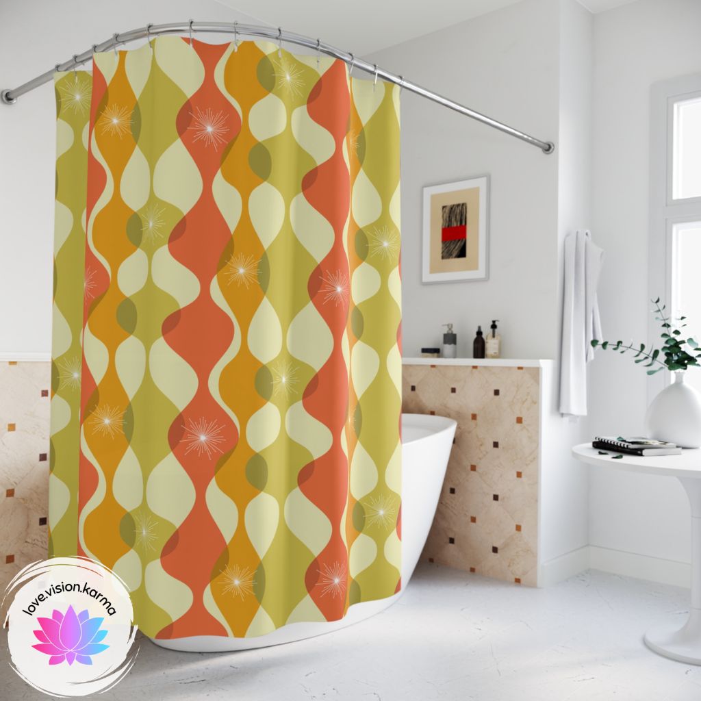 The 60s mid century mod abstract design on this shower curtain, combined with its 70s retro color palette, will give your bathroom a hip retro vibe, without having to take a hammer to it! Matching bath mat available.