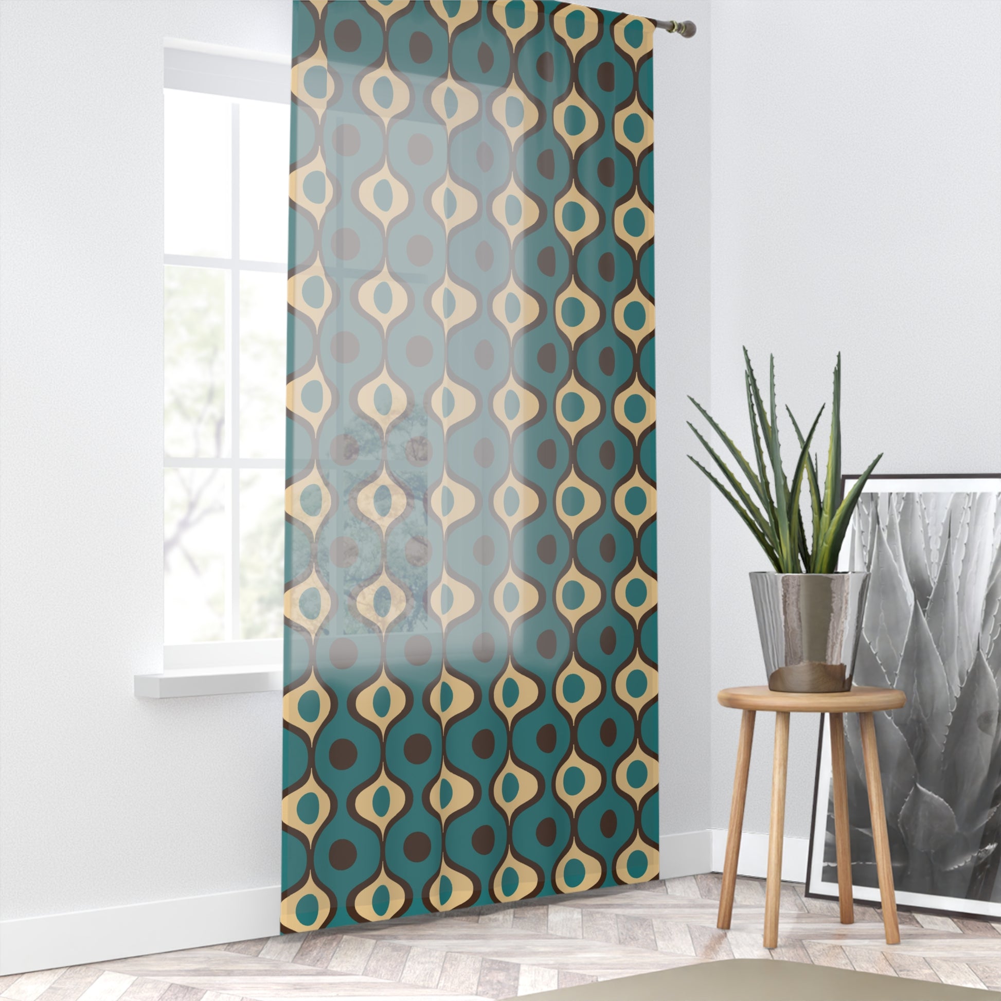 Retro 60s 70s Mid Century Mod Funky Geometric Blue, Cream & Brown Sheer Window Curtain