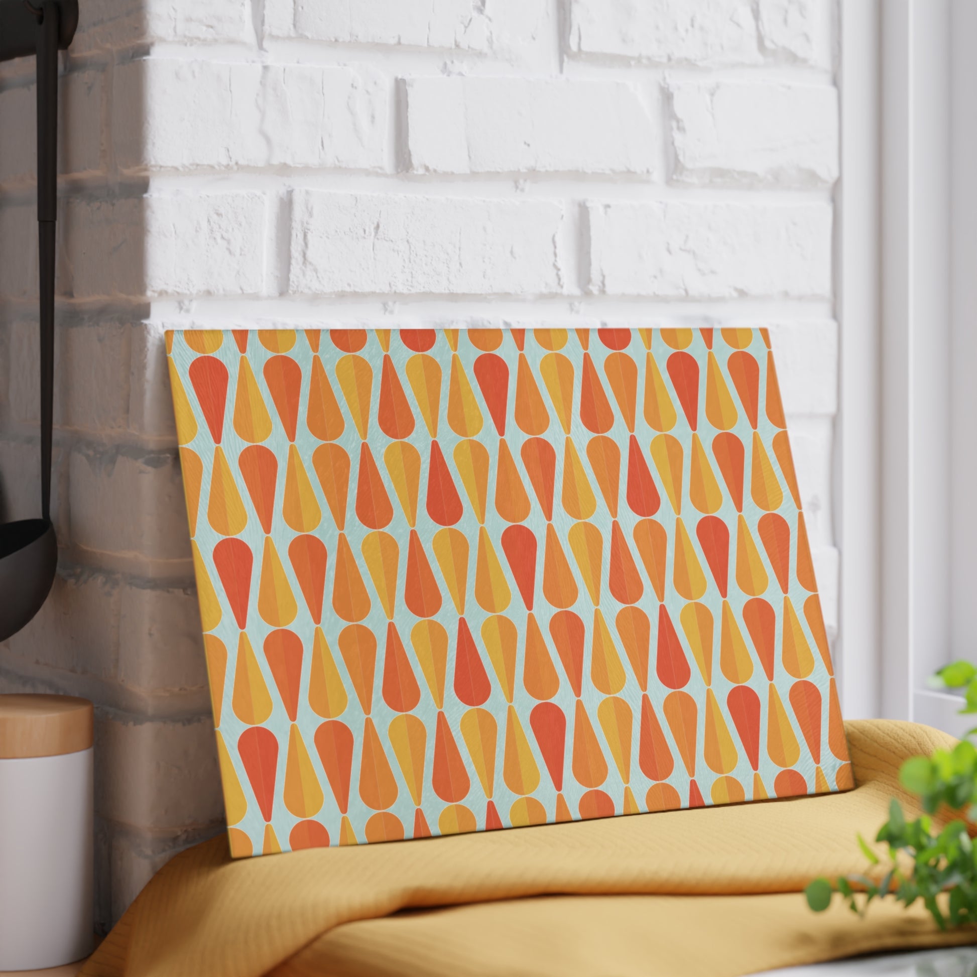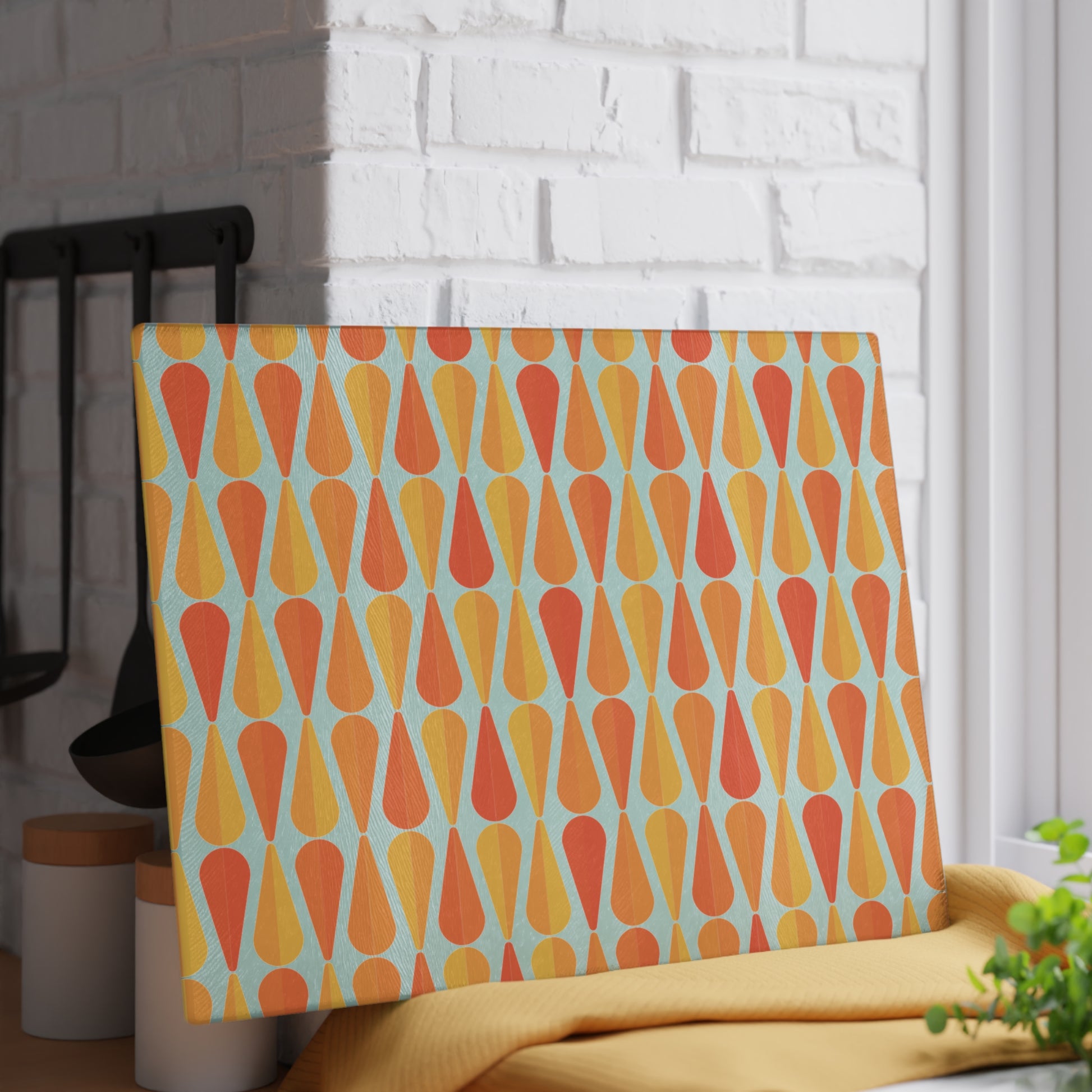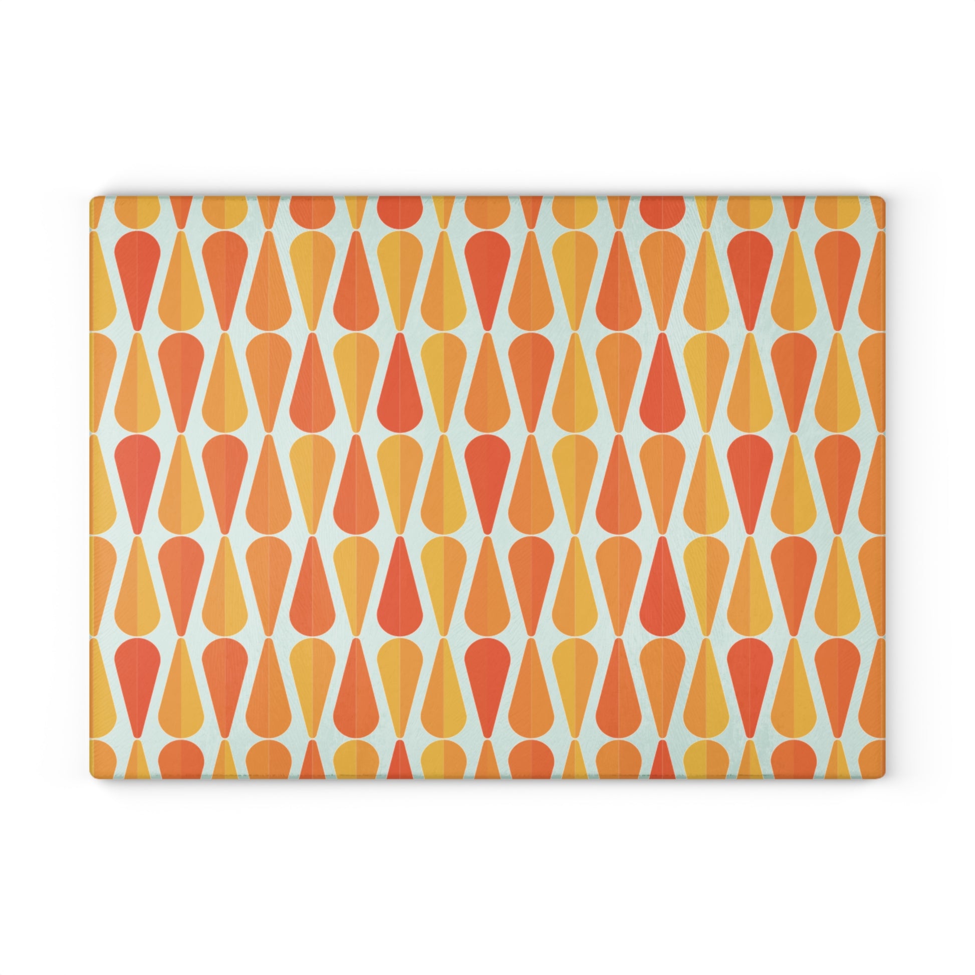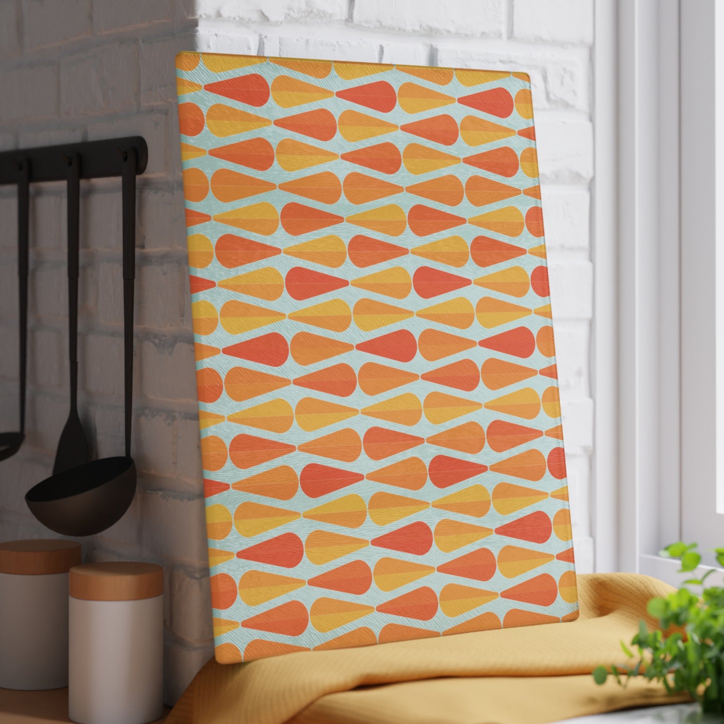 Bring some cheery 60s and 70s vibes to your kitchen, with our mid century modern inspired glass cutting board, featuring a retro geometric design in a fun mcm color palette of orange and yellow!