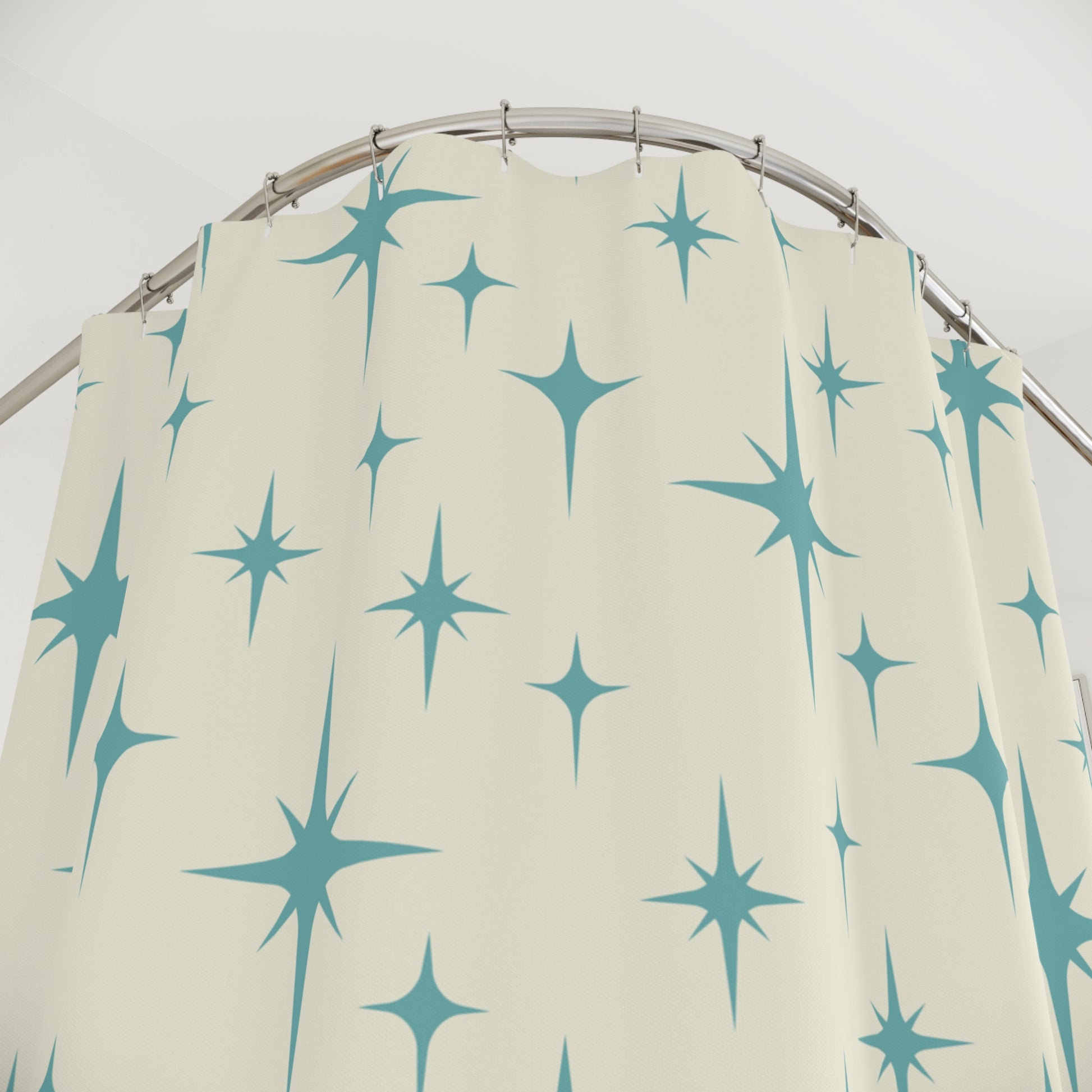 The starbursts featured on this shower curtain are synonymous with mid century modern design. Changing your shower curtain is an easy way to bring the retro style of the 50s and 60s to your bathroom! Matching bath mat available.