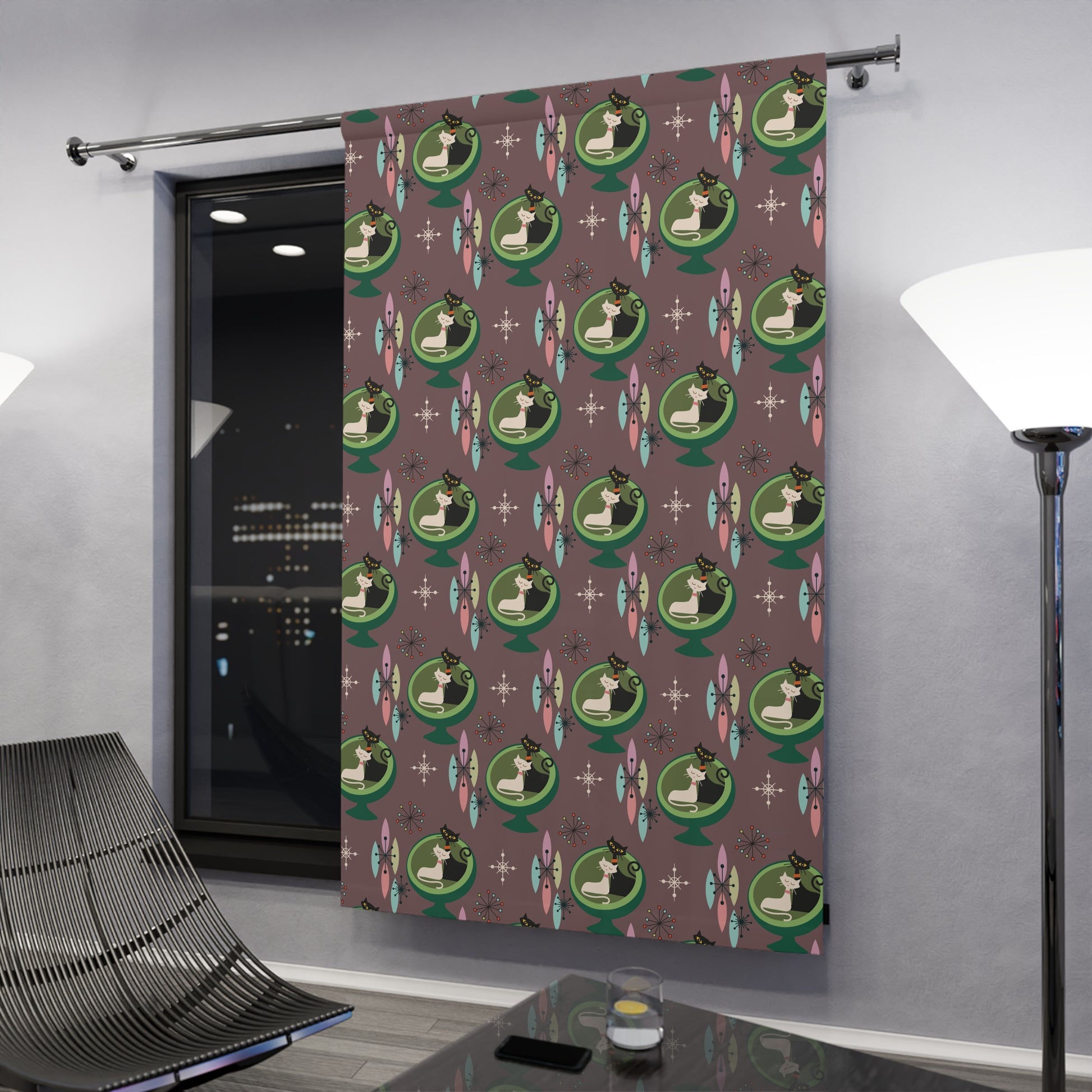 This taupe and green blackout window curtain design features a fun atomic cat couple snuggling in a retro-futuristic ball chair, that adds 50's mid century flair to your space, while blocking most light coming through the window. Changing your curtains is one of the most cost effective ways to make a dramatic impact on the look of your room! These curtains are blackout which means they are medium weight and block out most of the sun and street lights...which is great for light sleepers and those rooms that require more privacy!