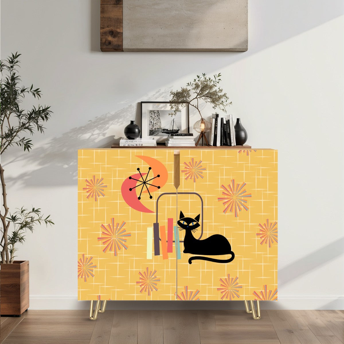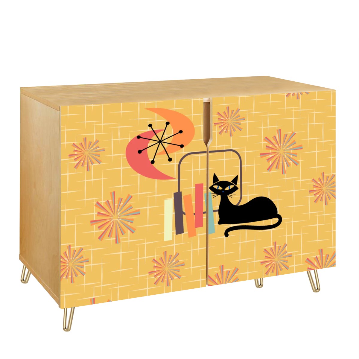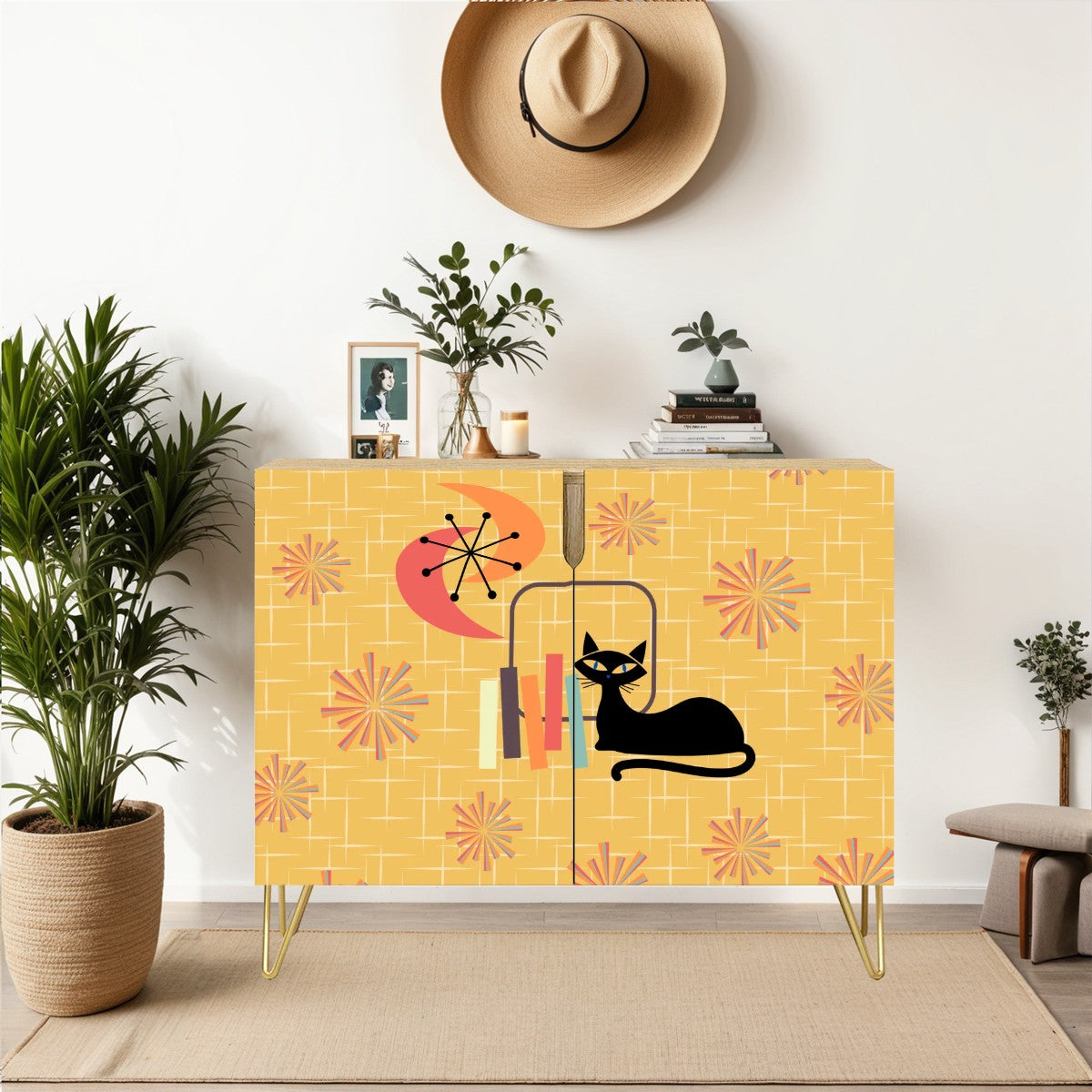 Retro Atomic Cat & 50's Starbursts Yellow Mid Century Modern Sideboard, Credenza, Wooden Storage Cabinet
