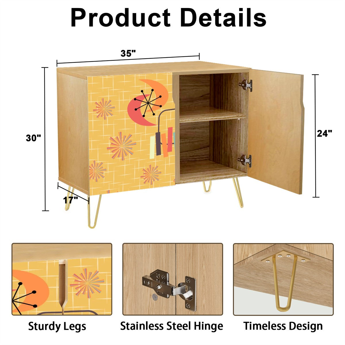 Perched atop iconic gold-tone hairpin legs, our retro atomic cat and starbursts yellow sideboard cabinet brings 50's mid century modern style to any space in your home! Behind the two doors, an interior shelf keeps your essentials organized; from dishware and bar tools in the dining room, to vinyl records and board games in the living room.