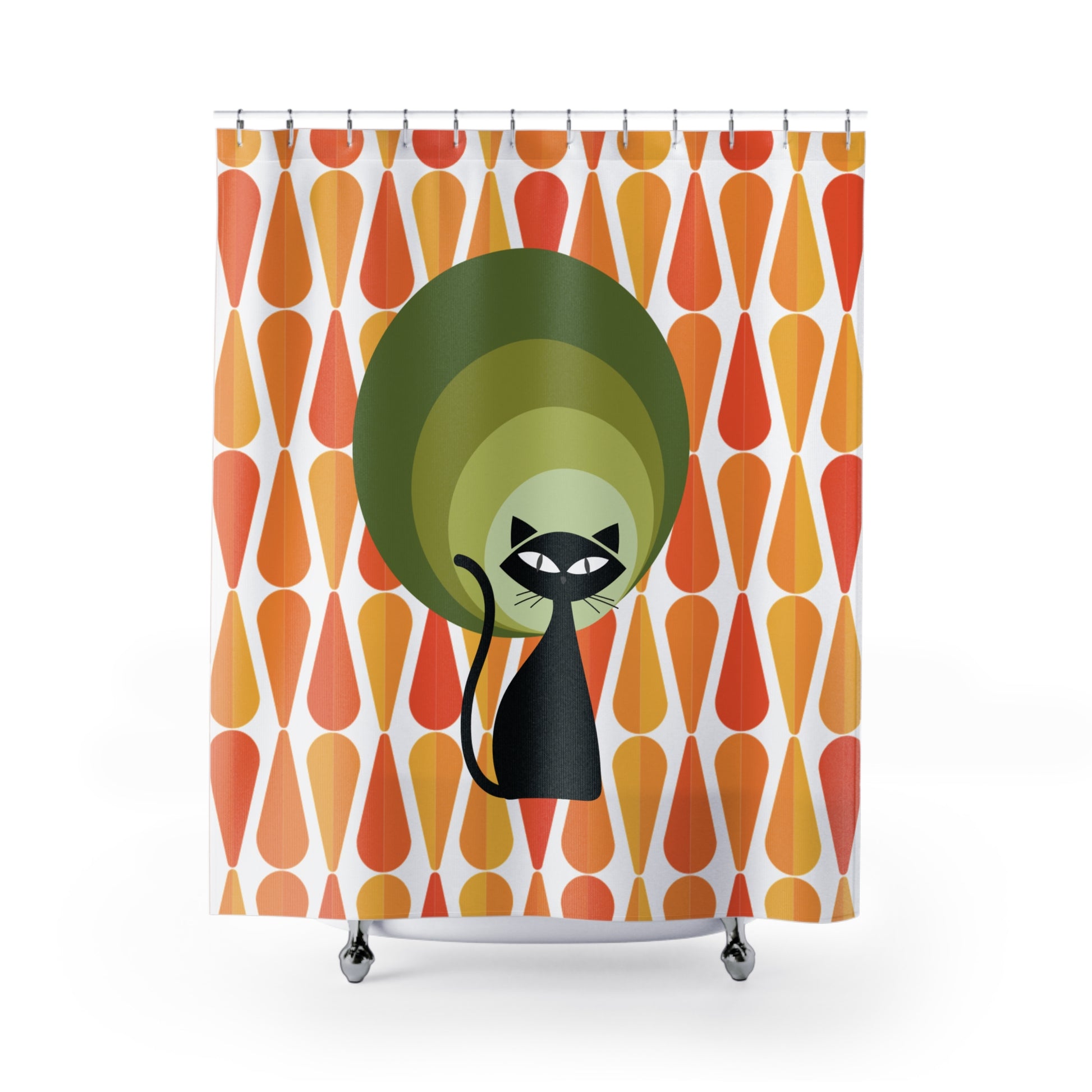 Retro Atomic Cat 60s 70s Mid Century Modern Geometric Orange, Yellow & Green Shower Curtain