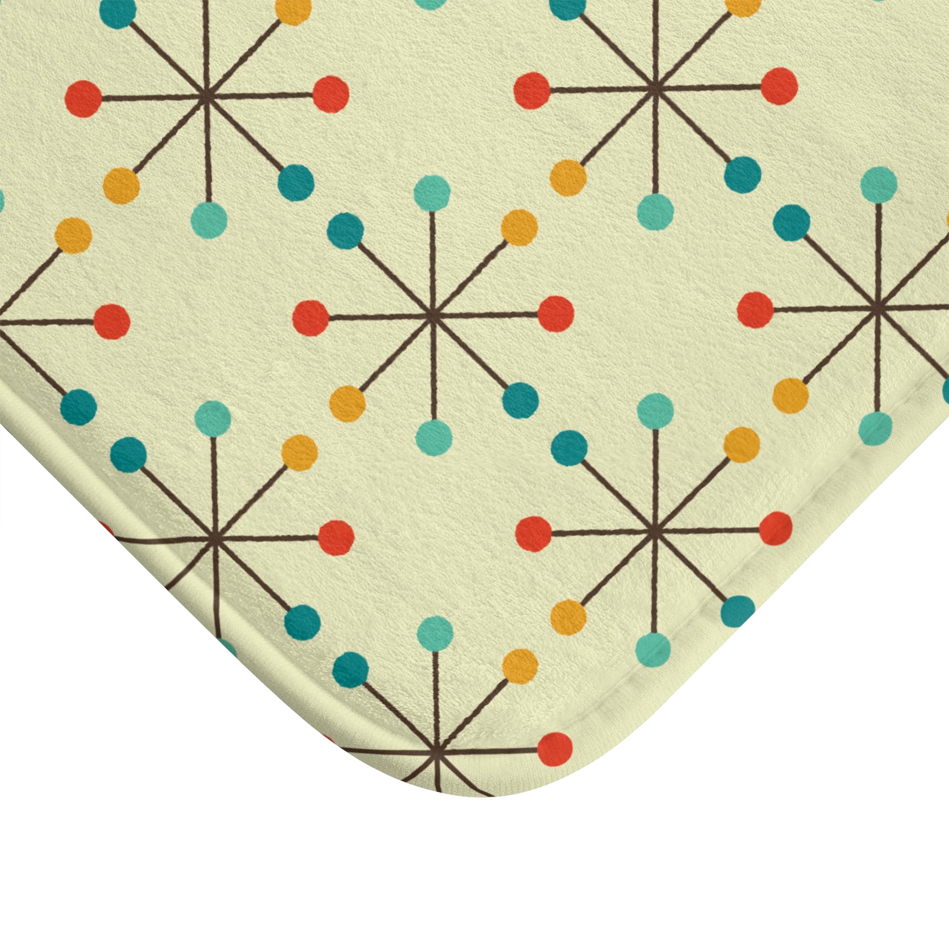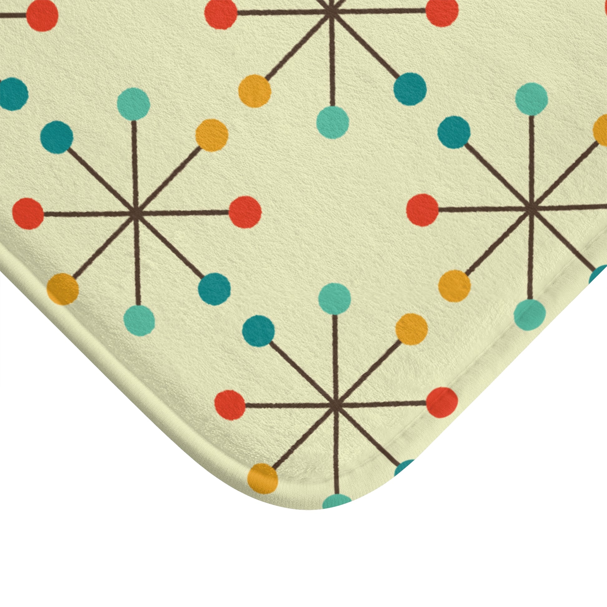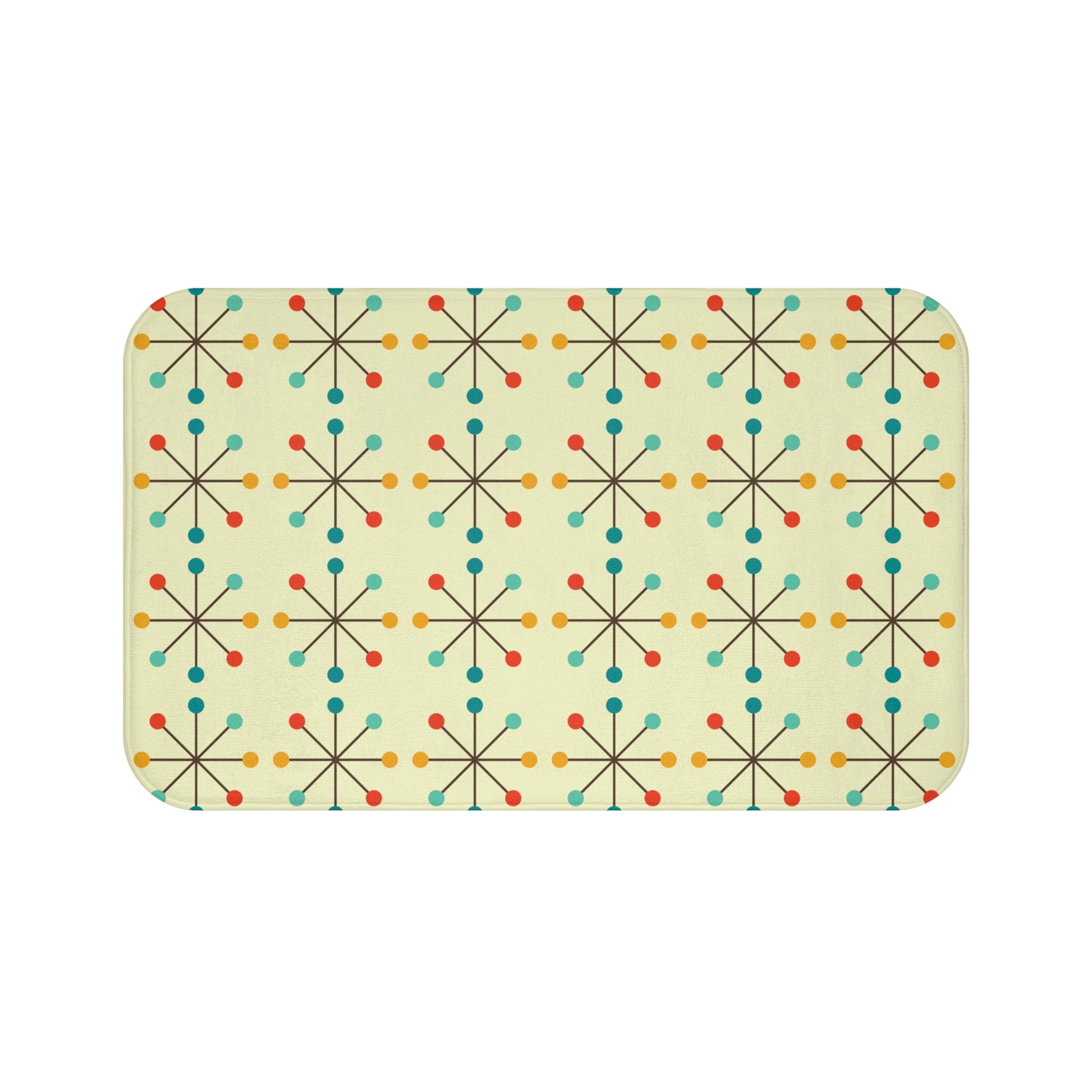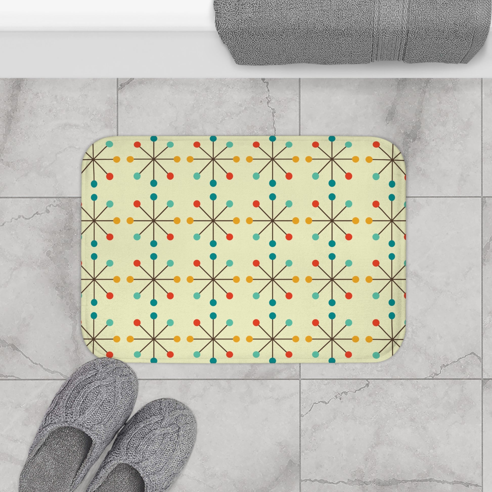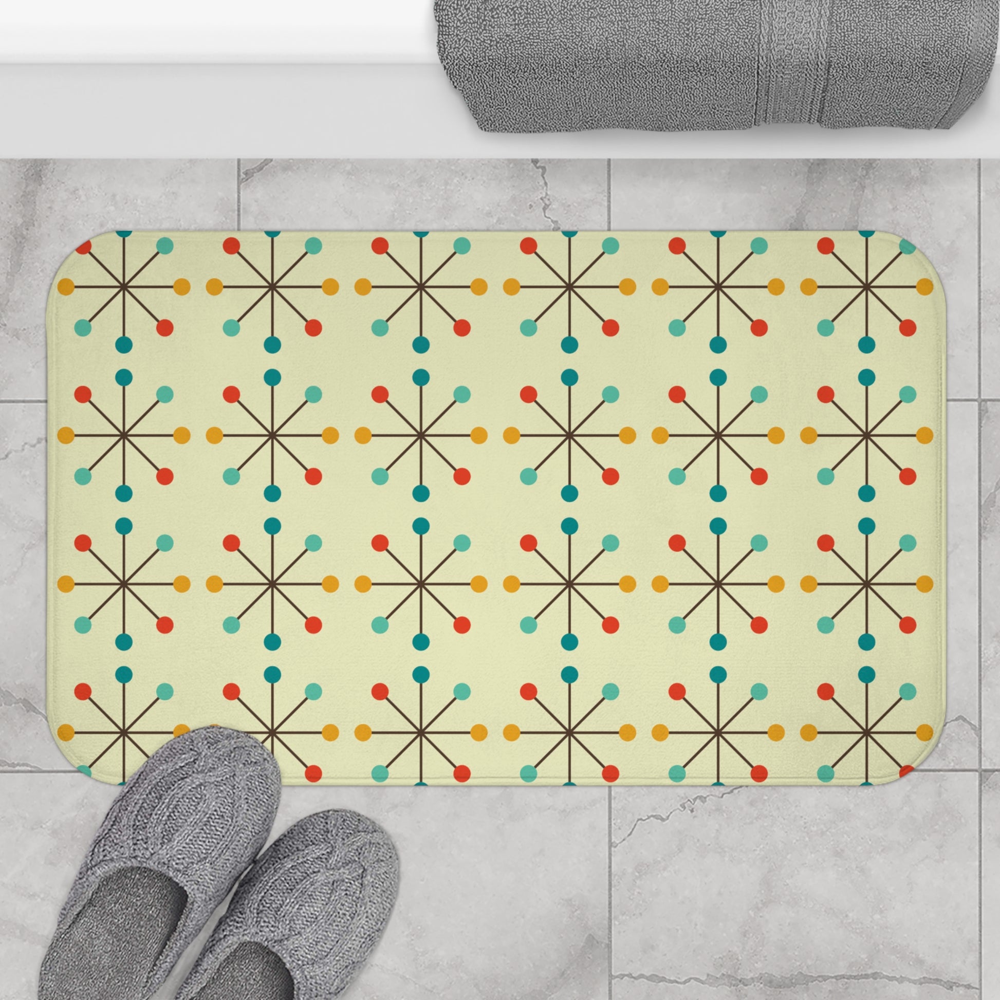 A vintage 1950's inspired, mid century mod atomic burst is the "star" of this soft and absorbent bath mat. It's easy to bring 50's style to your bathroom with our bath mat and the coordinating shower curtain (available here).