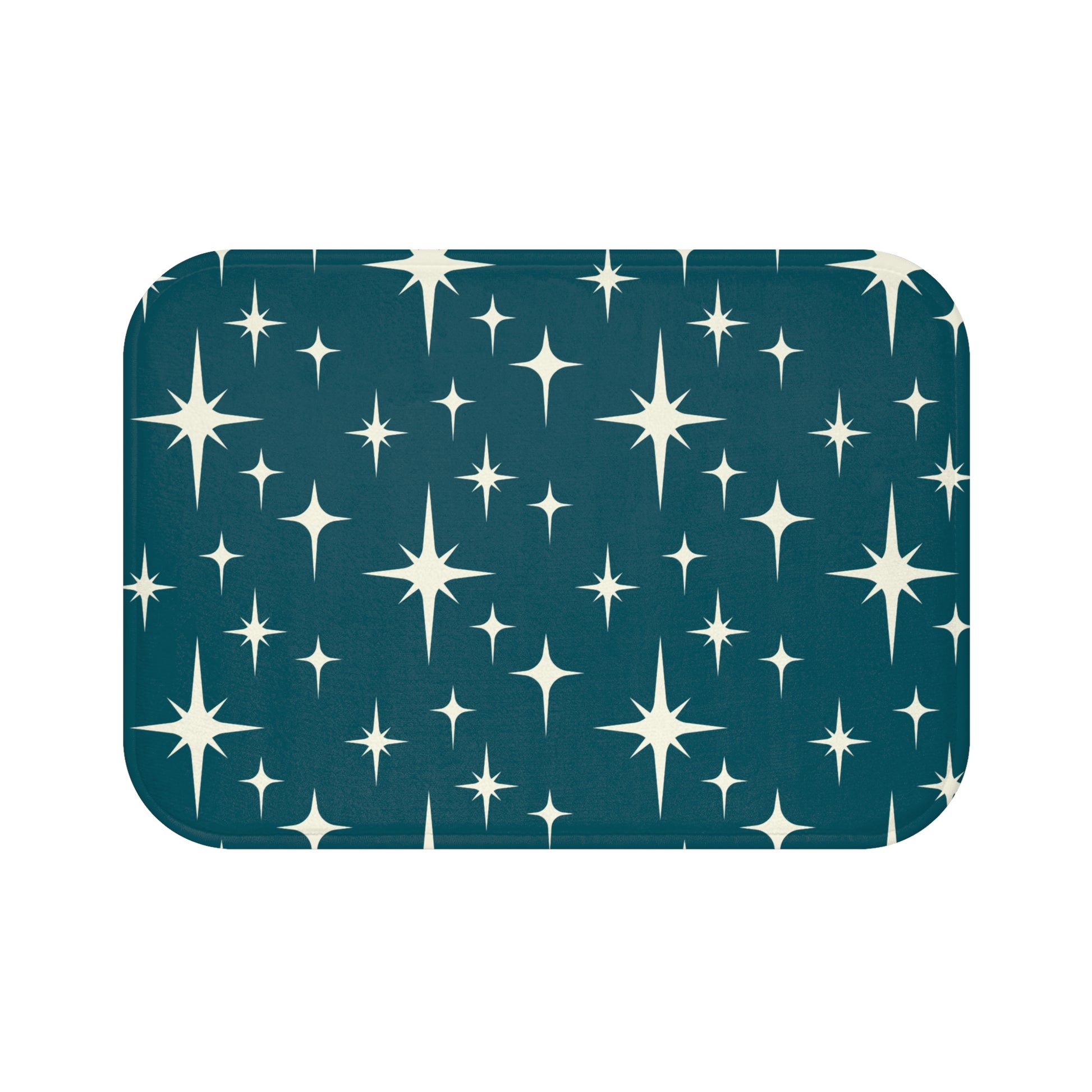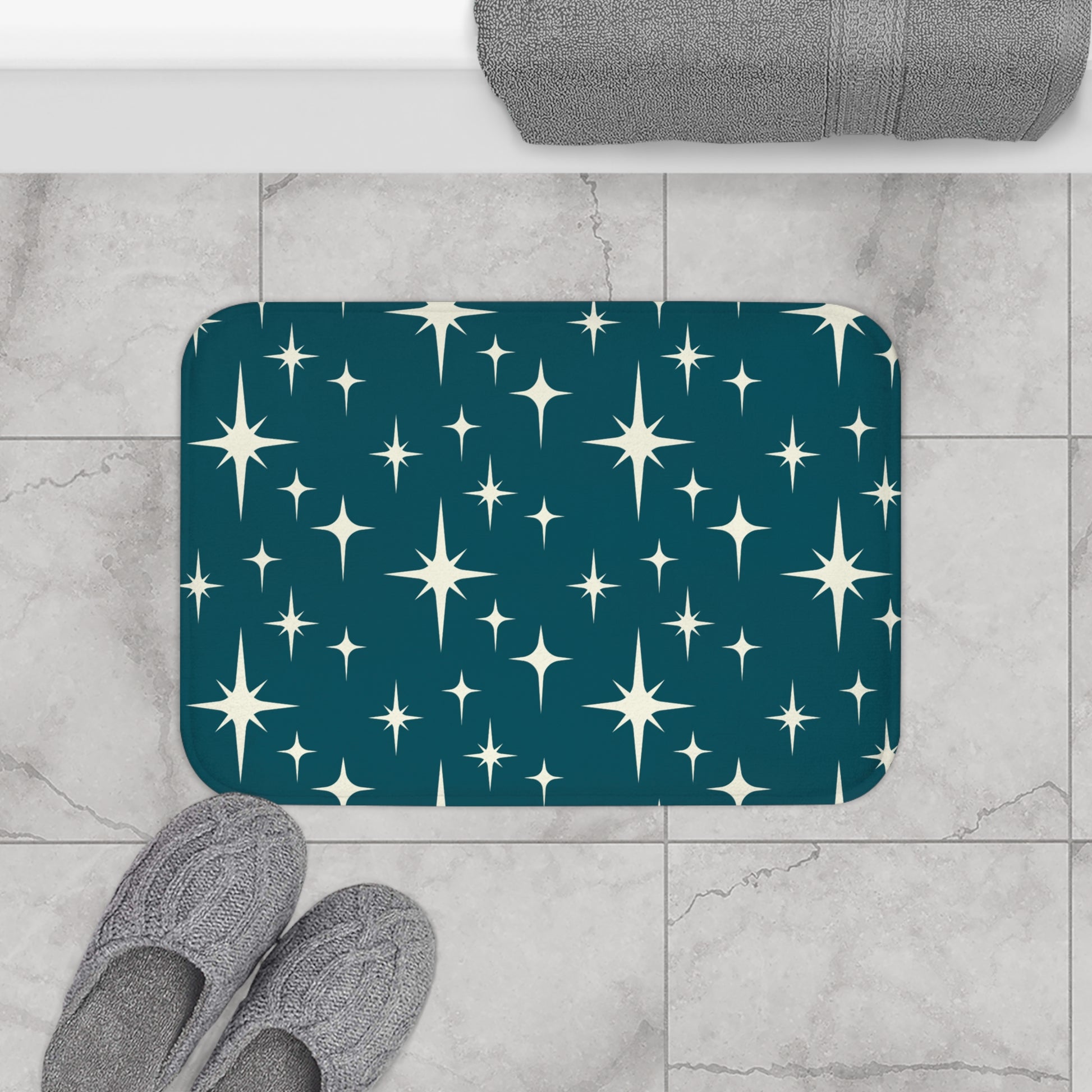 This bath mat features a 50's starburst design from the mid century mod era in a stunning color combo of deep blue and off-white. A quick change of your bath mat is an easy way to refresh your bathroom! Matching shower curtain available.
