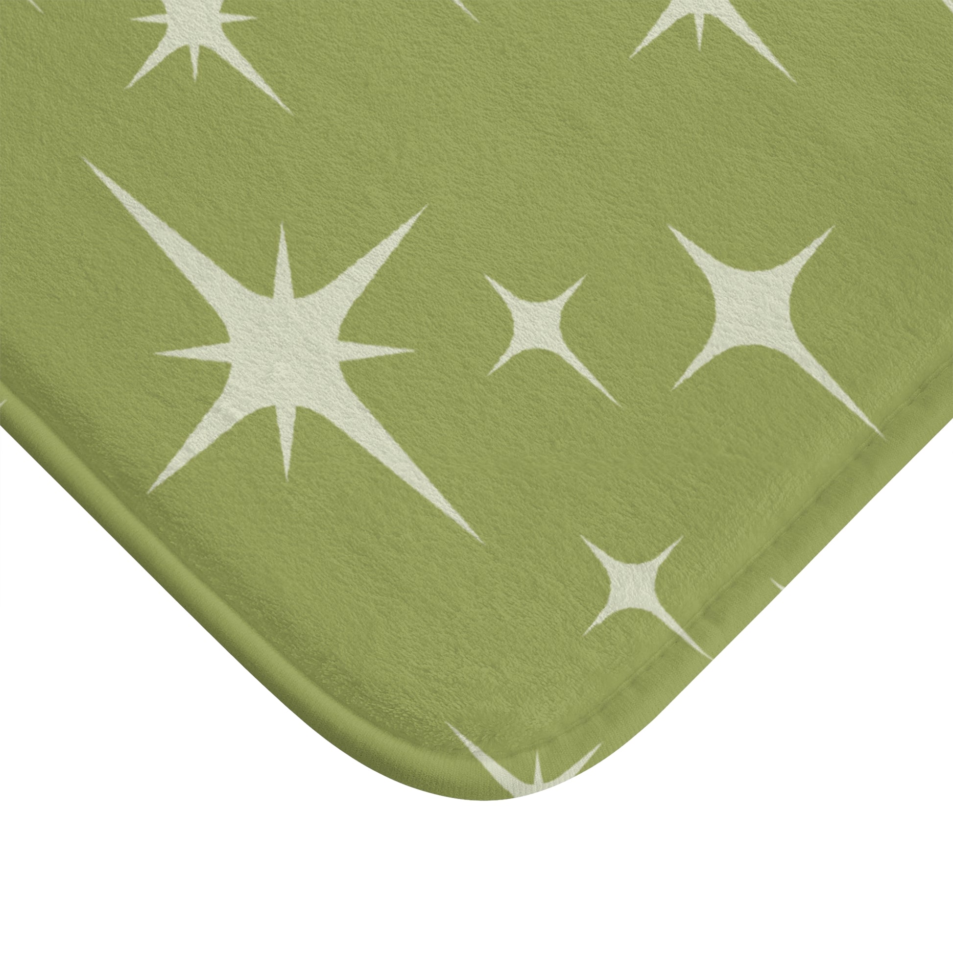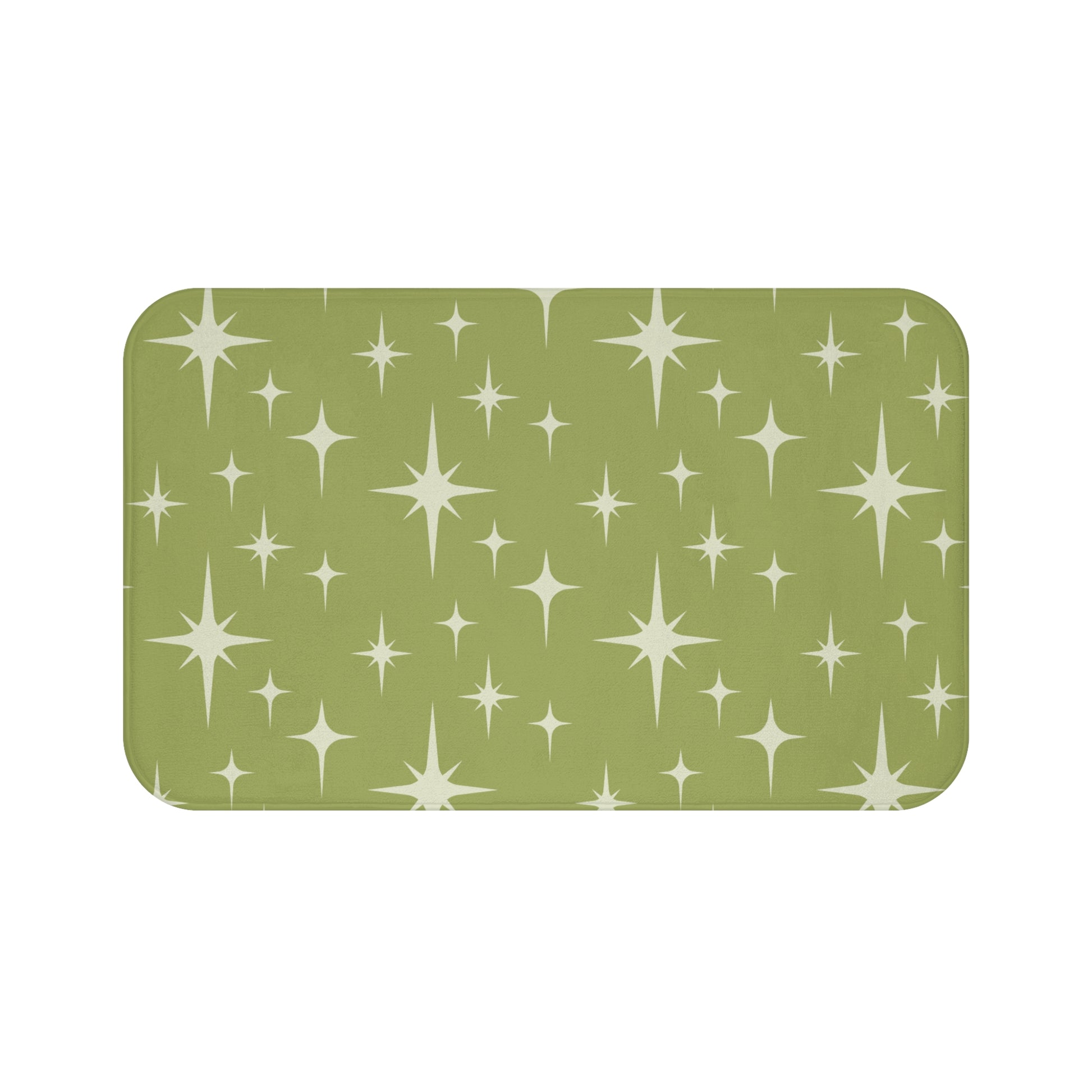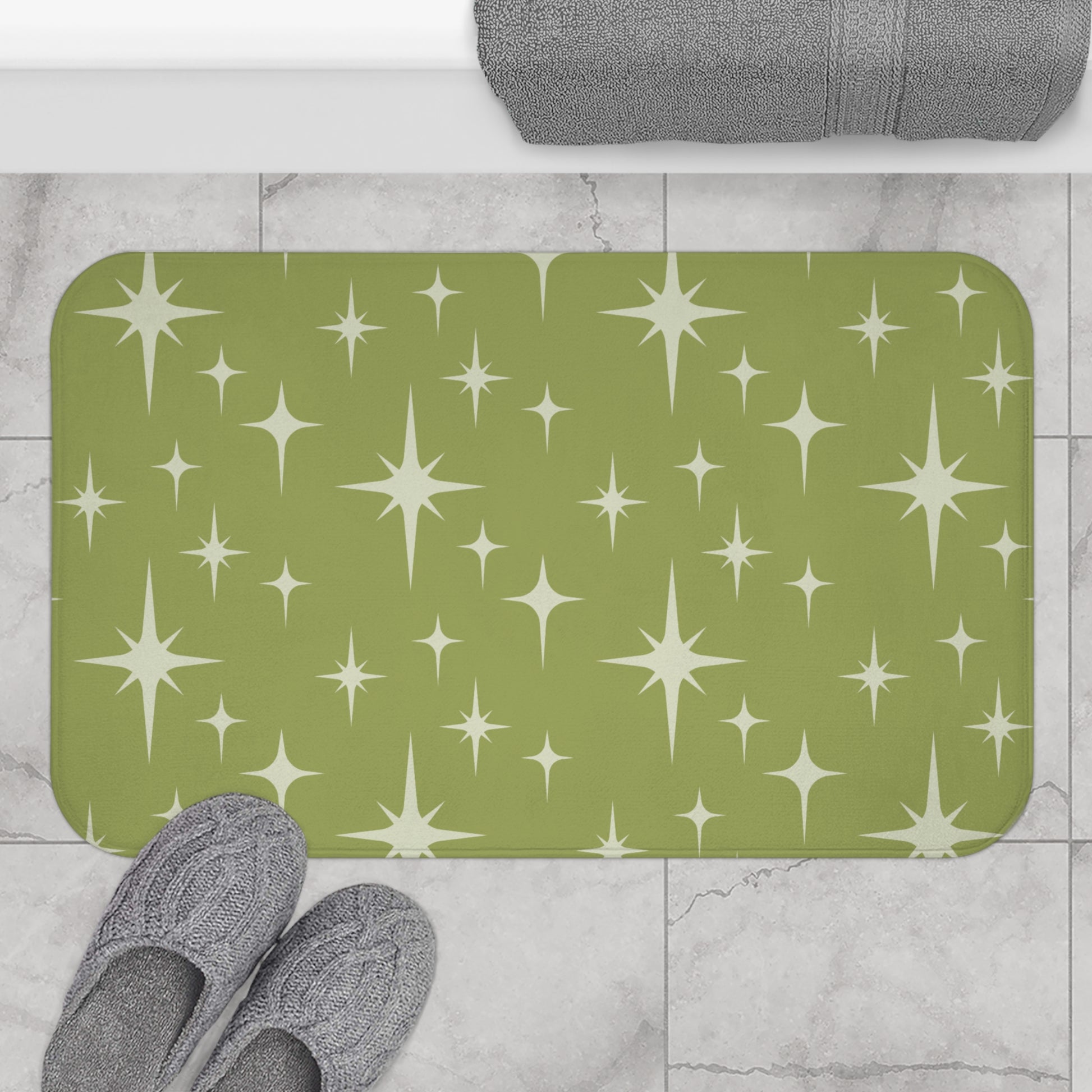 This bath mat features an atomic starburst design from the 50's mid century mod era in a beautiful chartreuse green. A quick change of your bath mat is an easy way to refresh your bathroom! Matching shower curtain available.