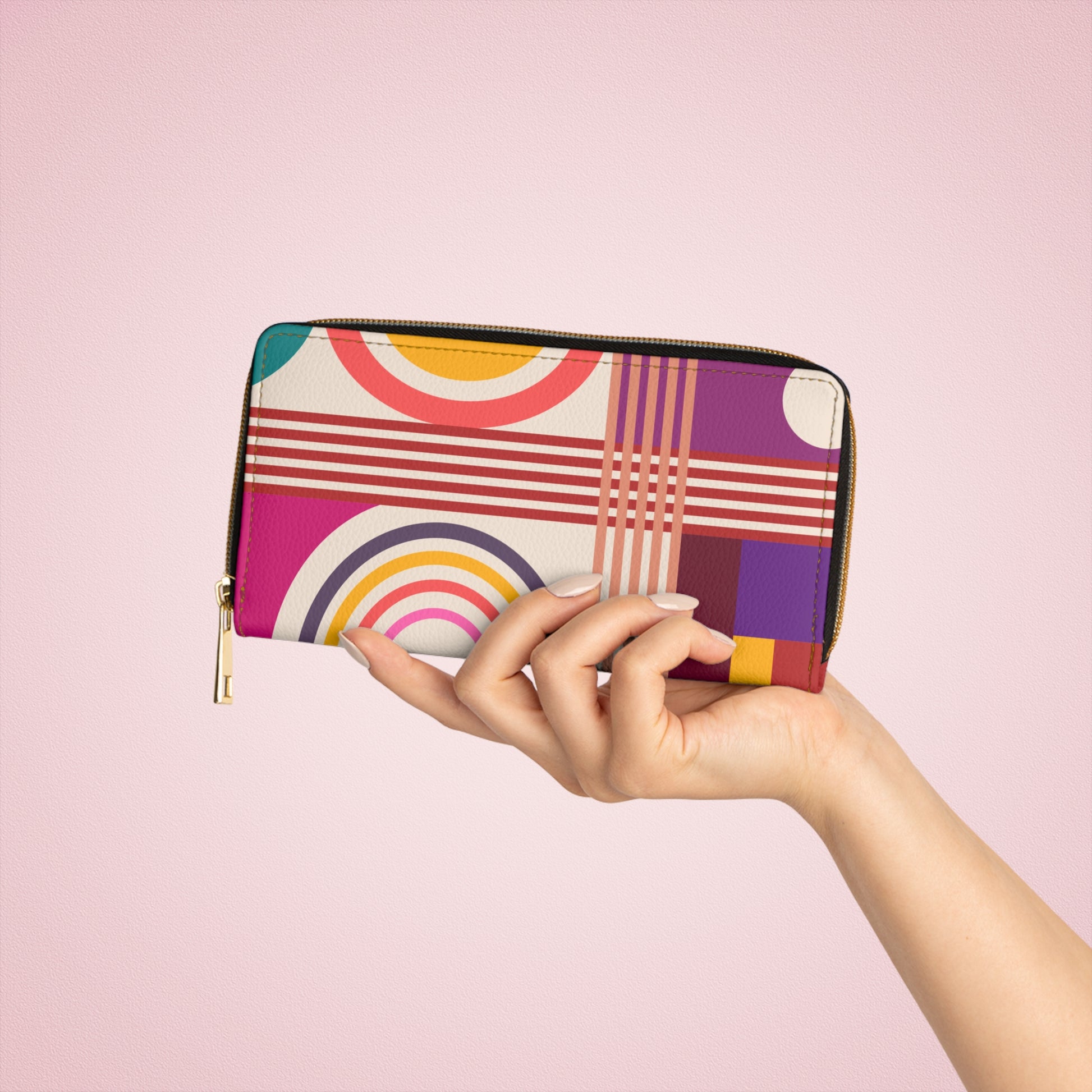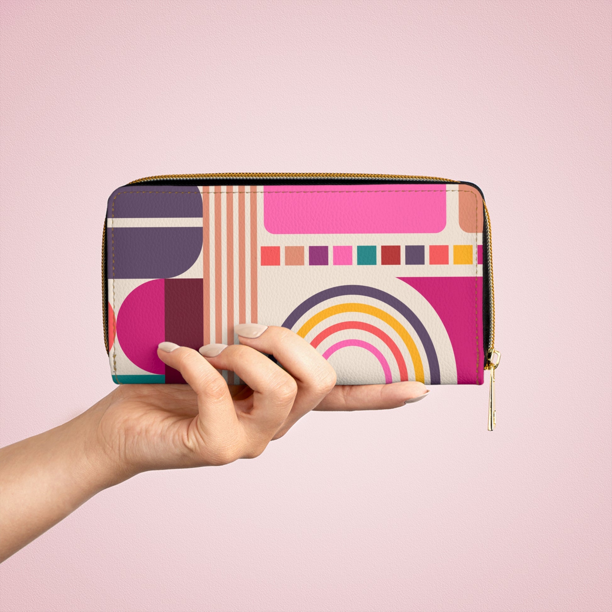 Designed with love and adorned with a colorful and bold, abstract bauhaus design, our zipper wallet is made from cruelty-free faux leather, so you can flaunt your unique style without compromising your values! Inside the zipper closure, you'll find pockets designed to hold your cash, credit cards, coins, and checkbook, ensuring your valuables are secure while you are free to go where your carefree spirit takes you!