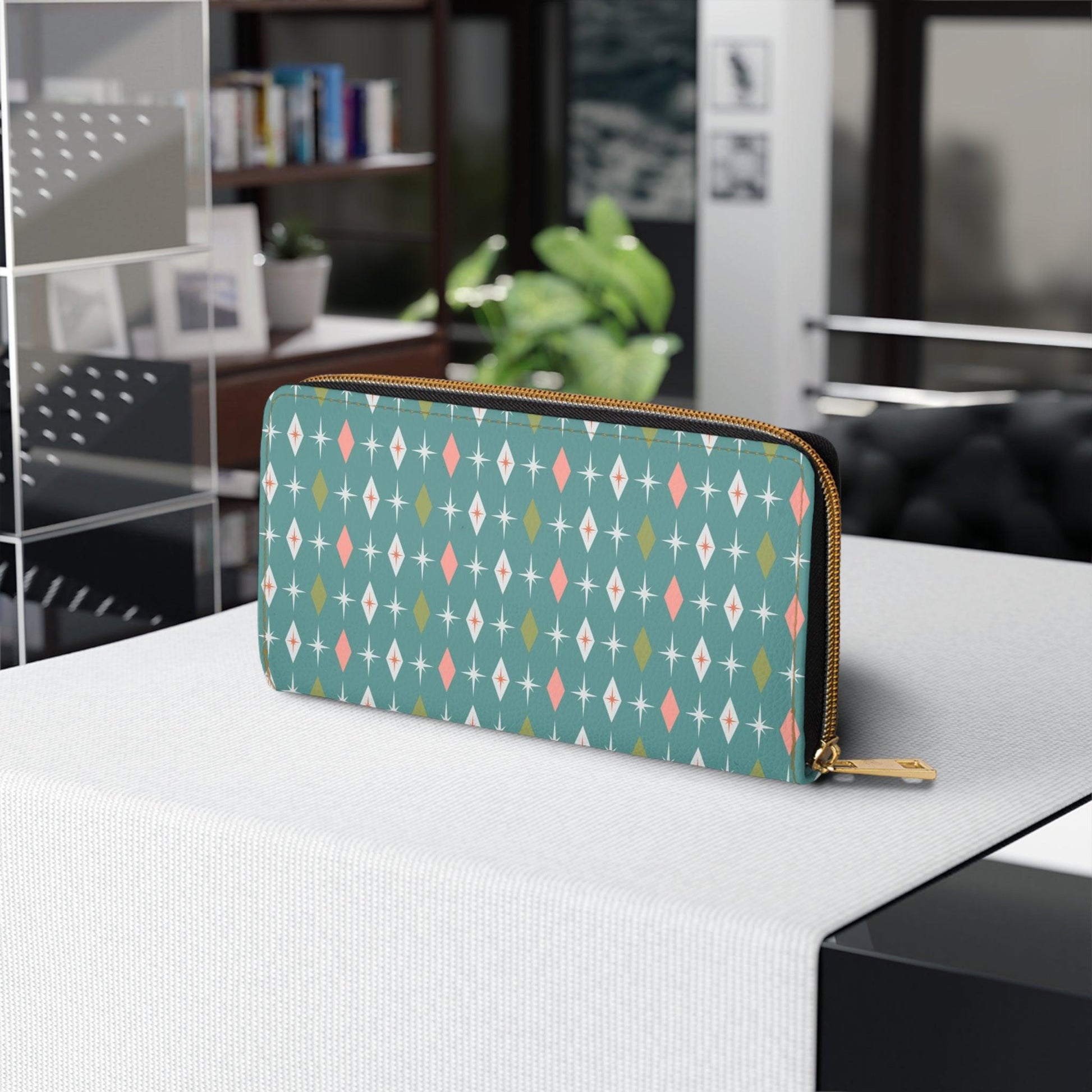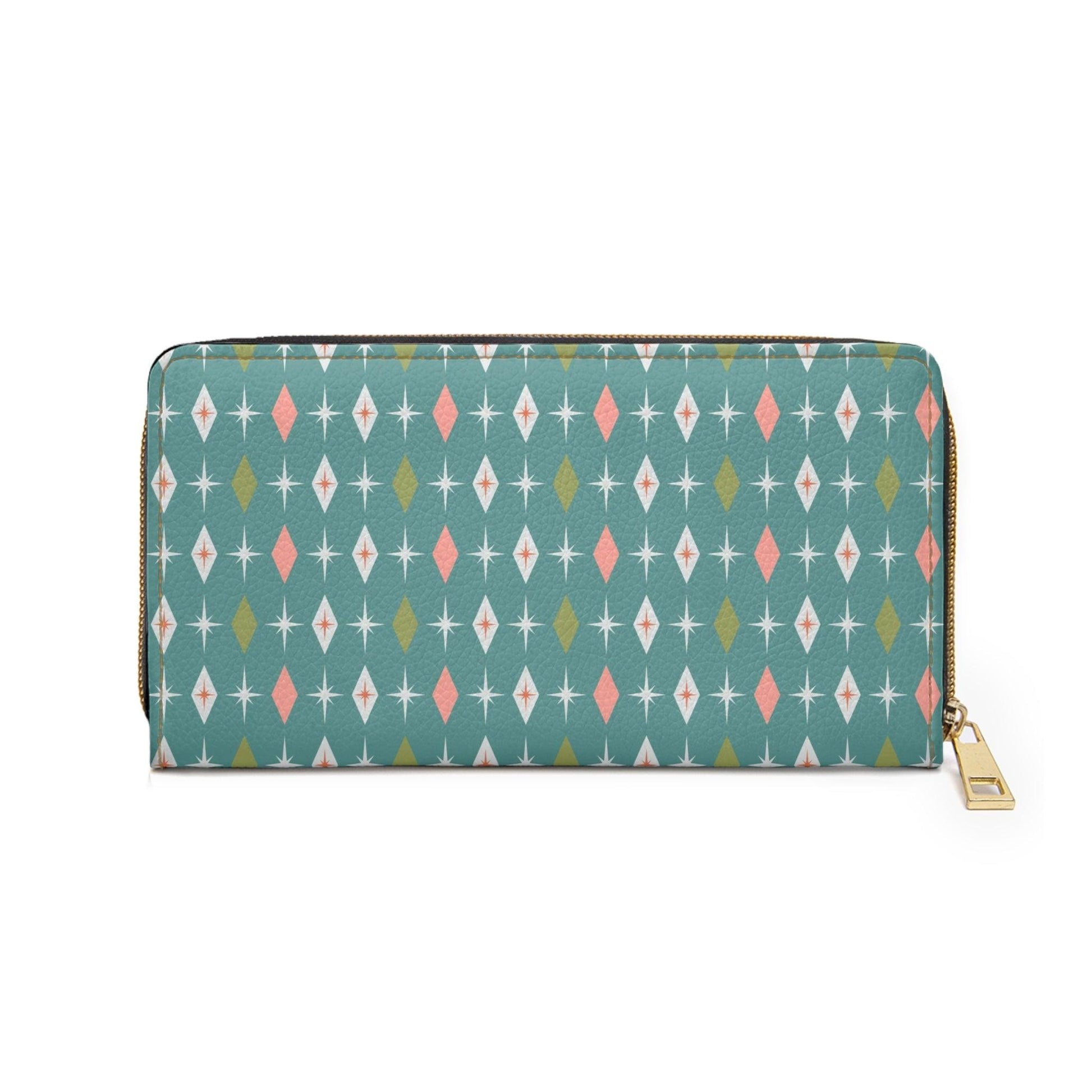 Embrace the spirit of the mid century modern era, where everything was bold, chic and colorfully fabulous, with our retro burst and diamonds zipper wallet. Crafted with love and designed to make you feel outta sight!