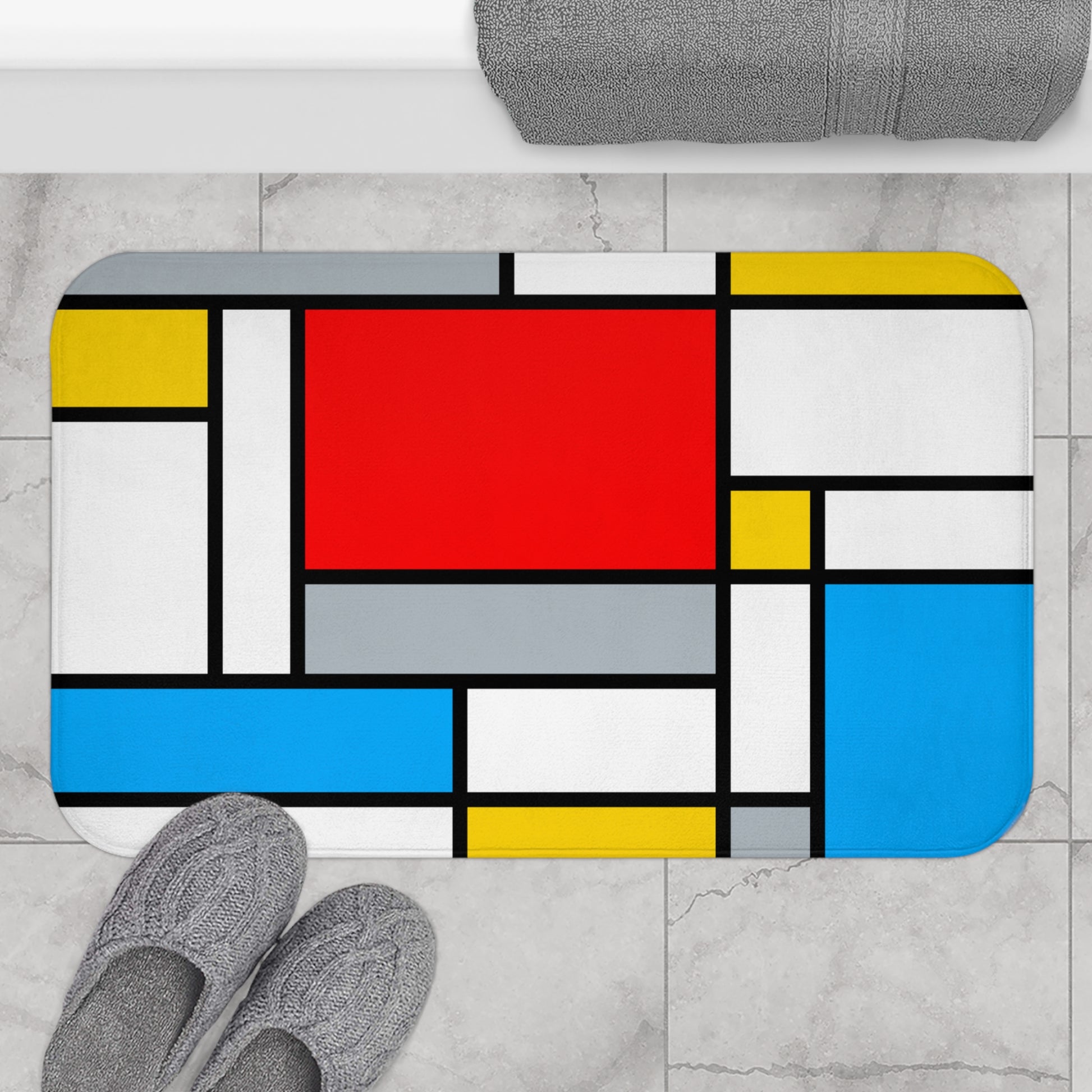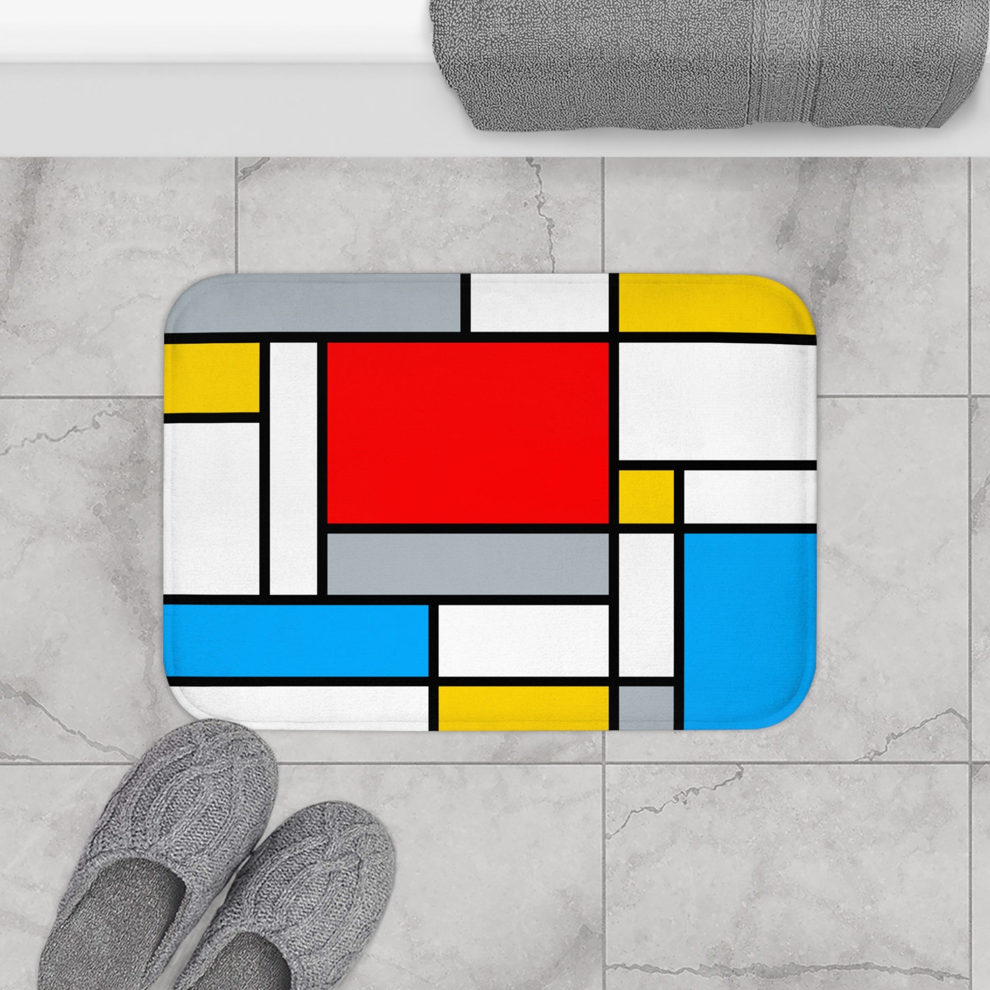 This bold Mondrian inspired design will awaken your eyes before your morning shower wakes up the rest of you! Beautiful in its simplicity, this bath mat doubles as abstract mcm art, since it was inspired by the Dutch art movement "De Stijl" which literally translates to "The Style!" Matching shower curtain also available.